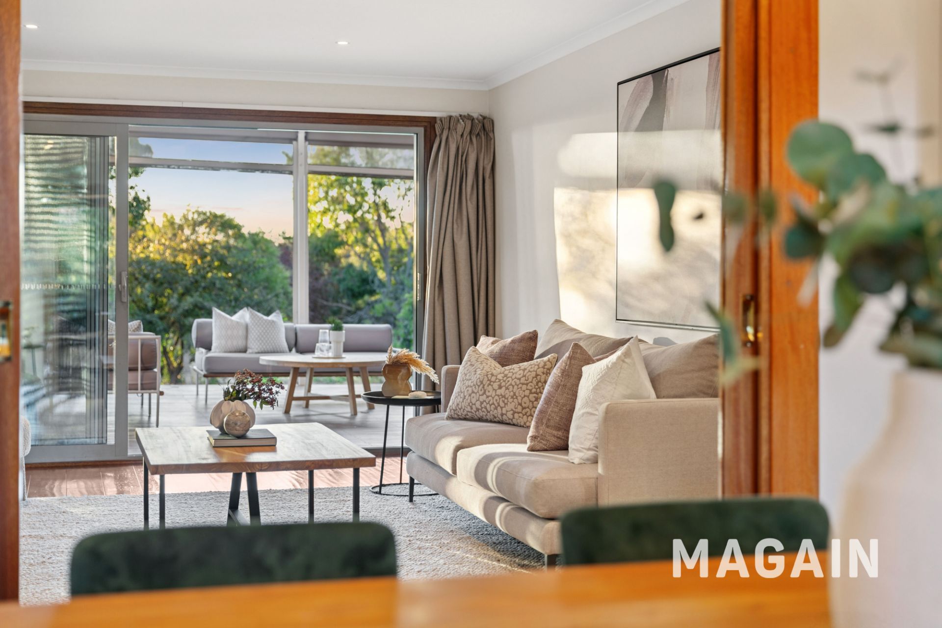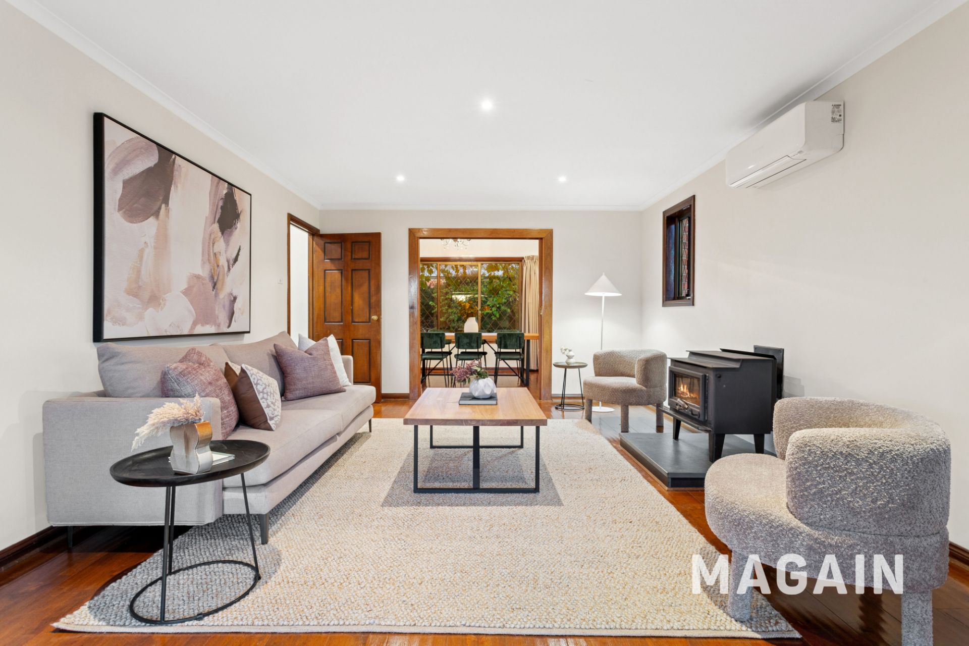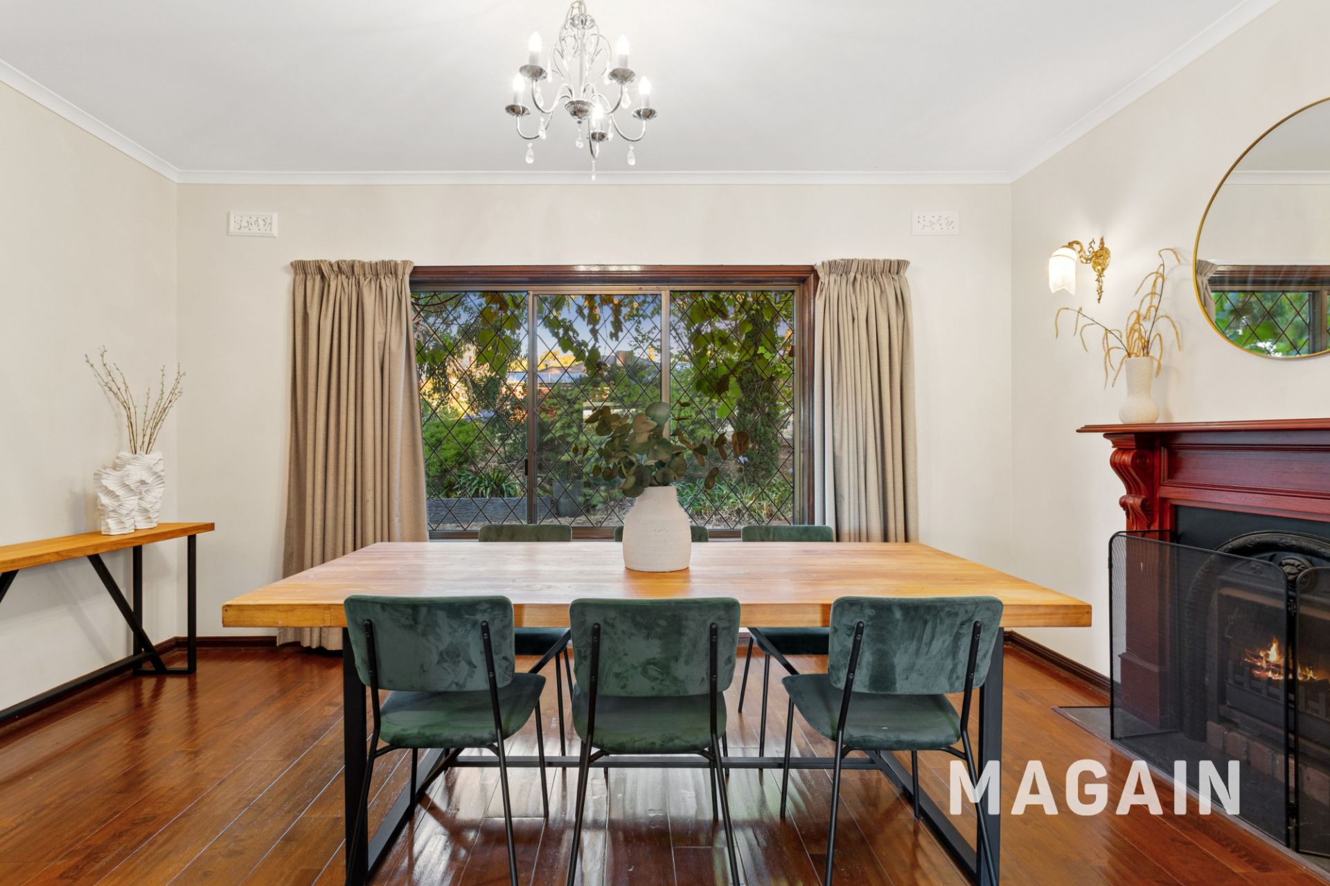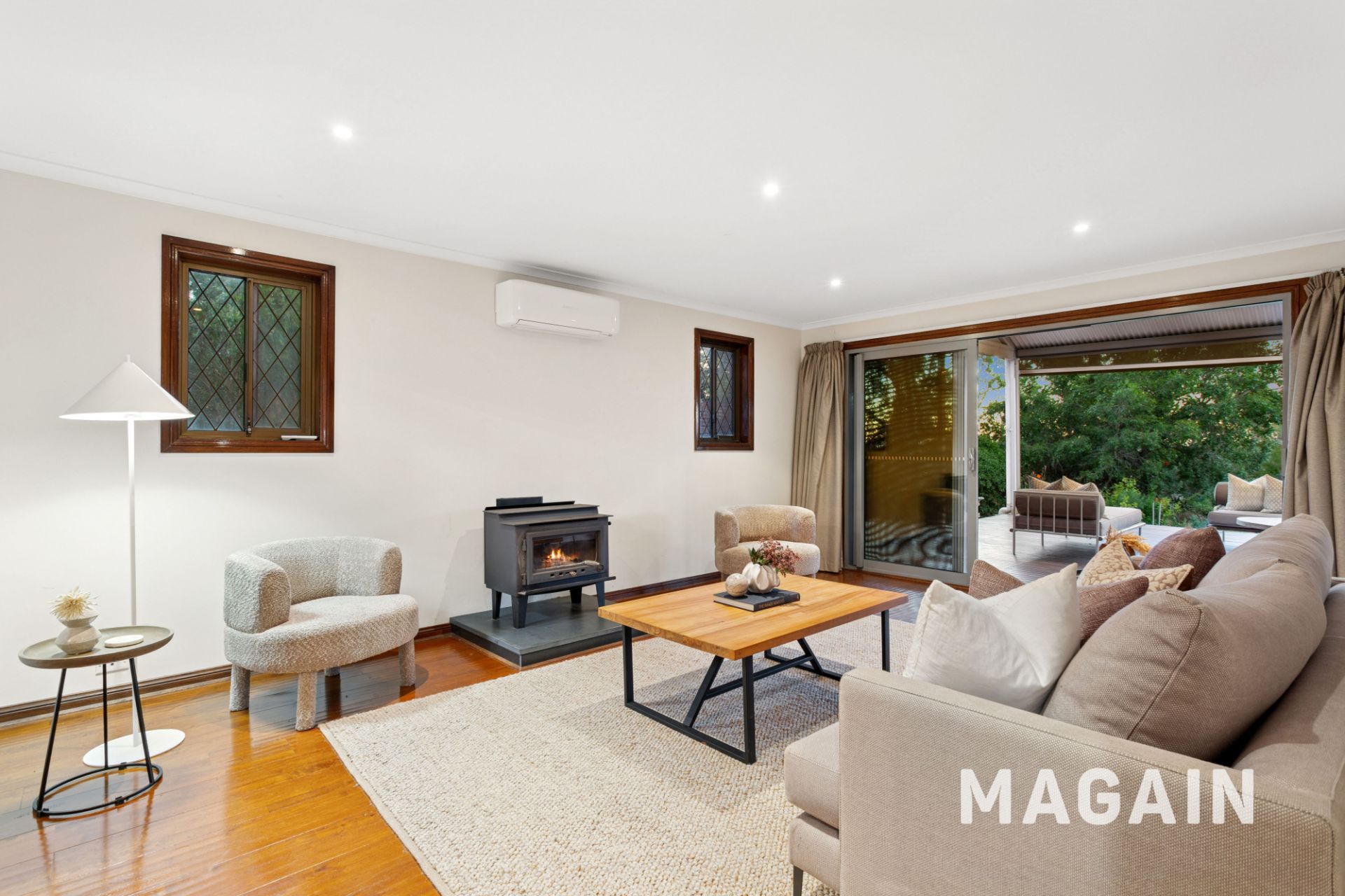 Step inside via a vine covered porch to the entry foyer, this provides access to the home's separate downstairs living zones. The formal dining and adjoining formal living room showcase hard timber floors, a cosy open fireplace and a slow combustion heater, creating a warm and inviting atmosphere. There are sliding stacker doors that open out to the rear deck and entertaining area from this living area which is impressive.