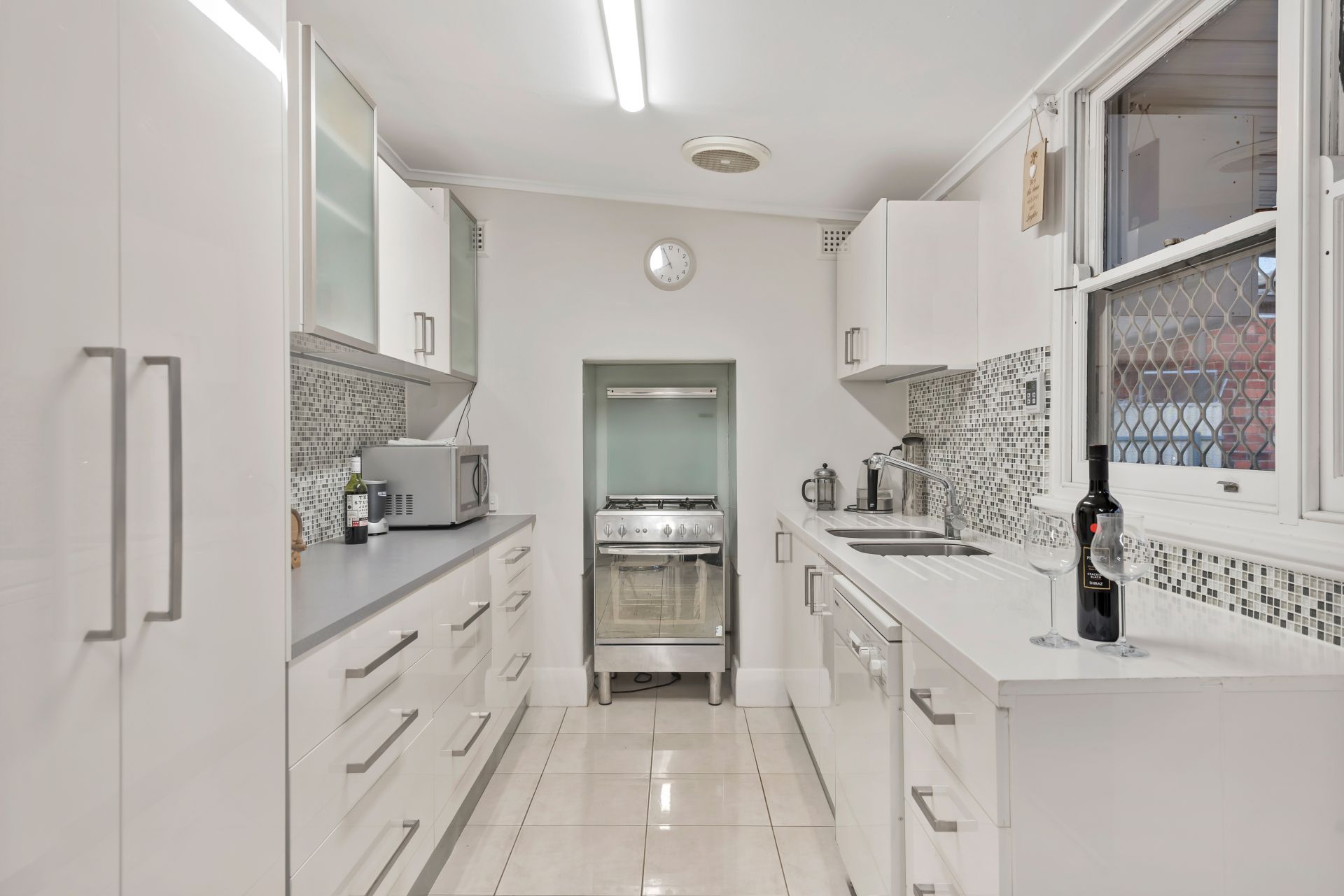 - Renovated kitchen with acrylic benchtops, mosaic tiles, Miele dishwasher, & stainless freestanding stove within the original chimney cavity