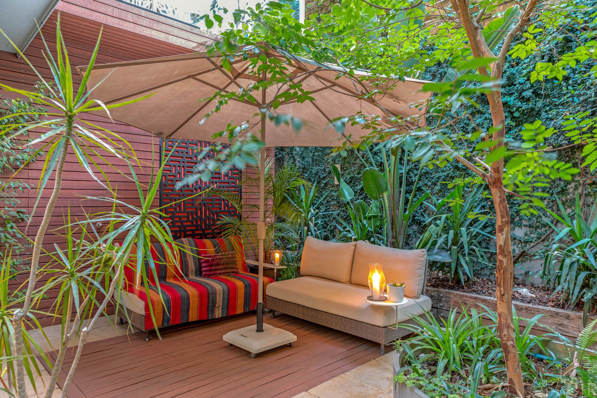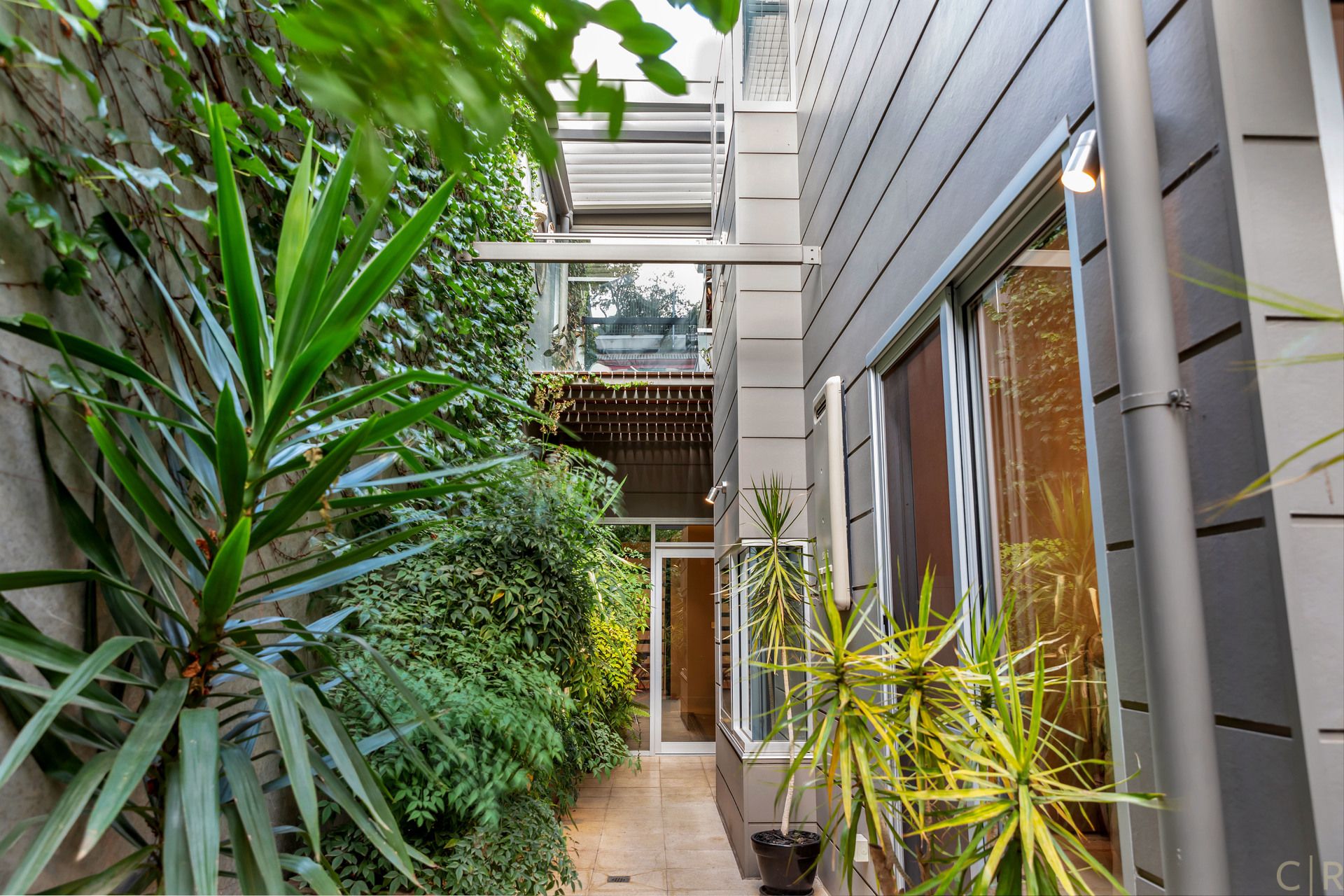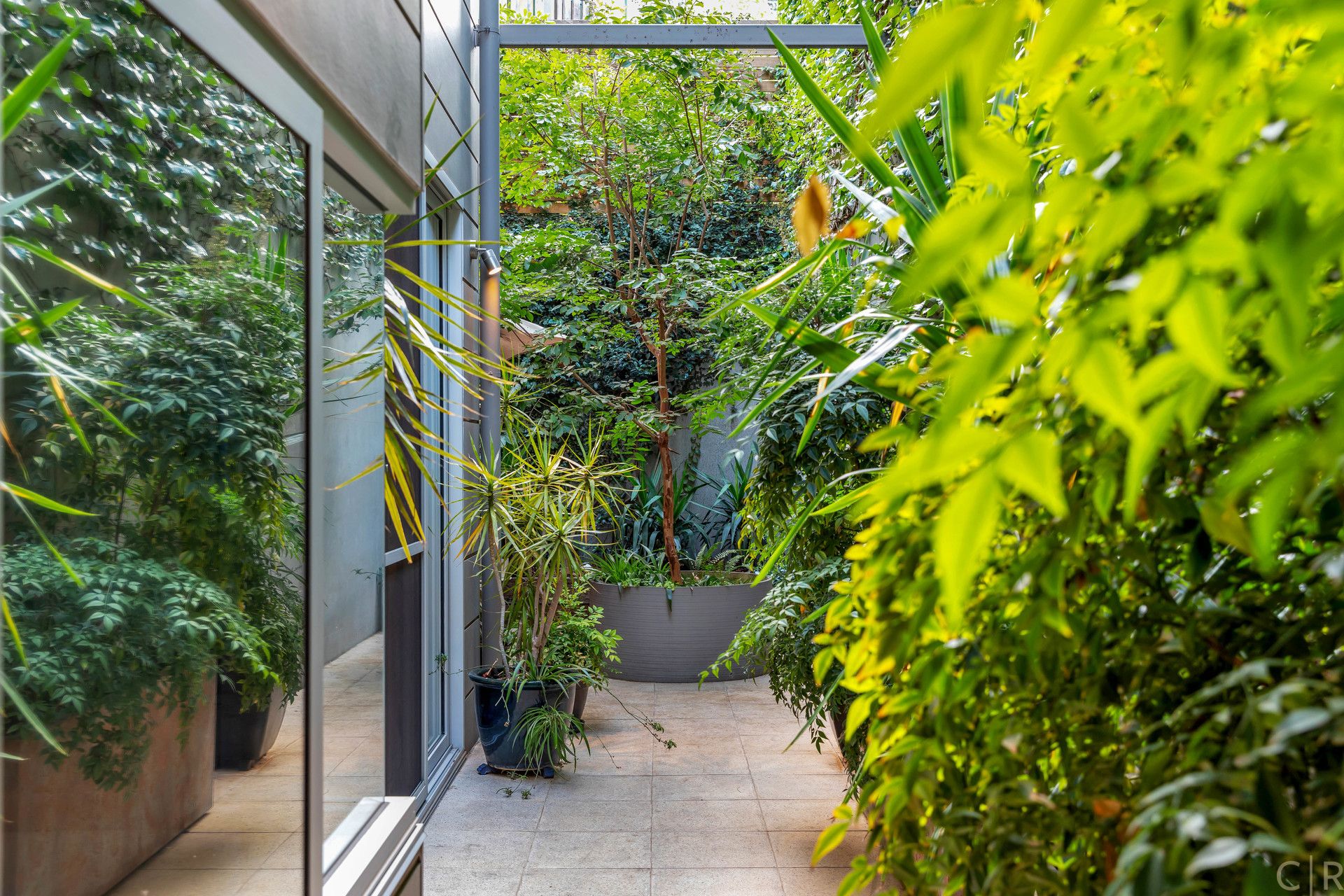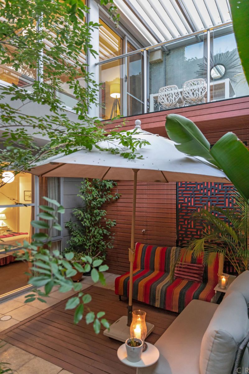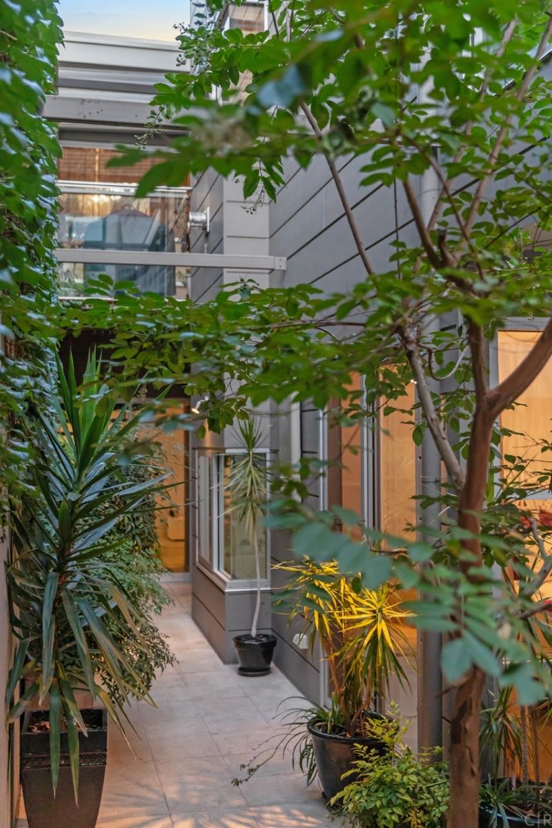 Beautiful and private rear courtyard with established greenery and discreet utility room and automatic irrigation