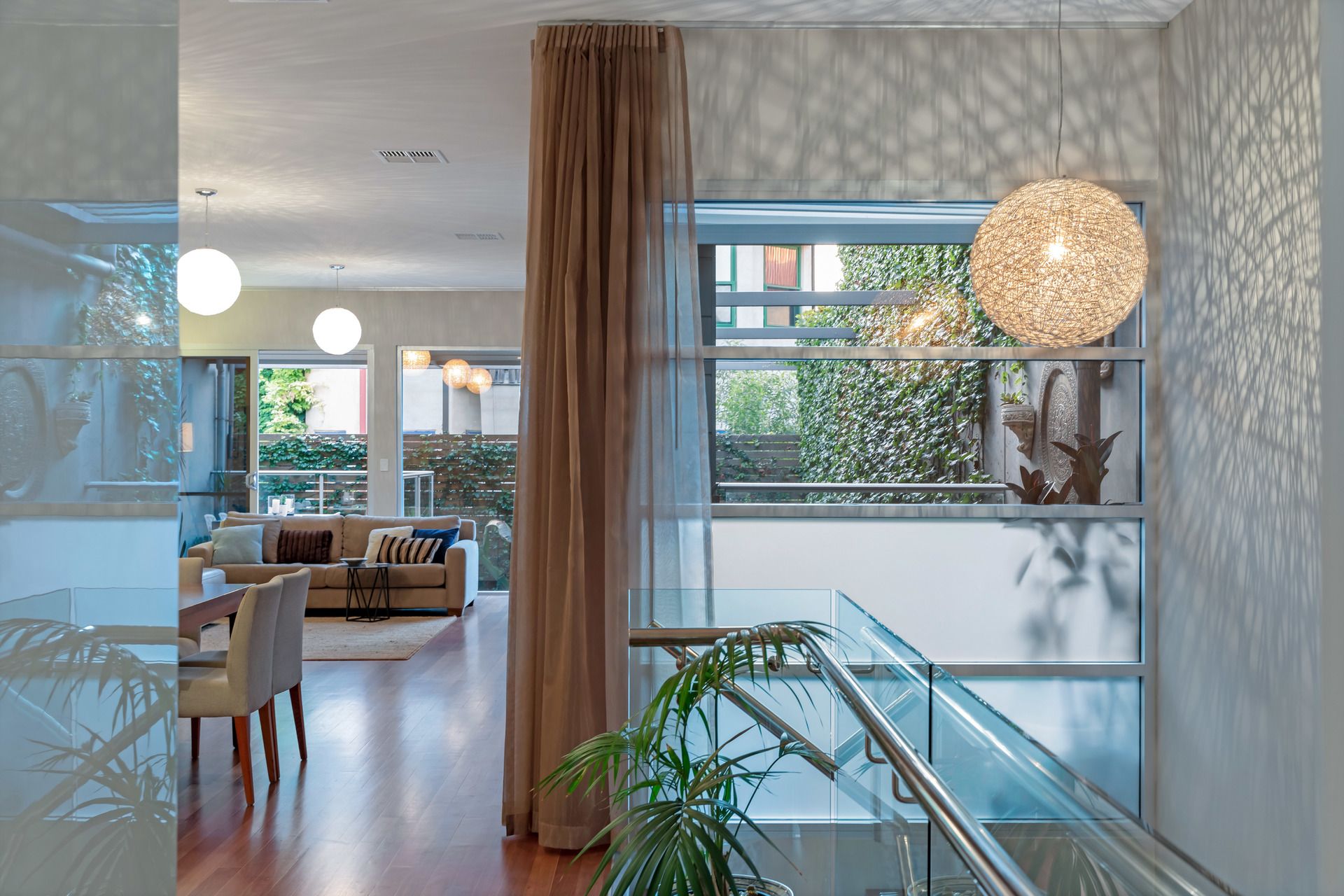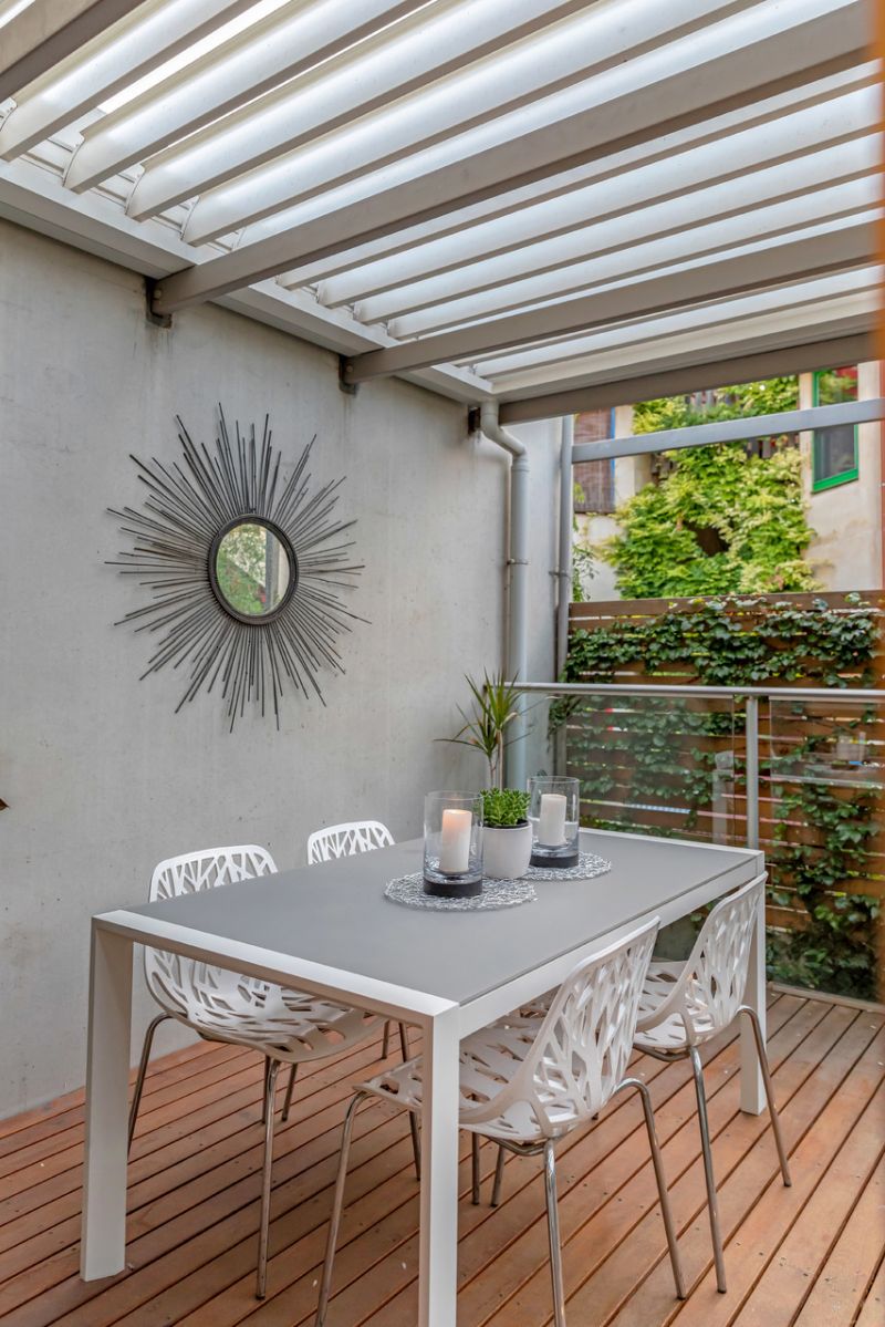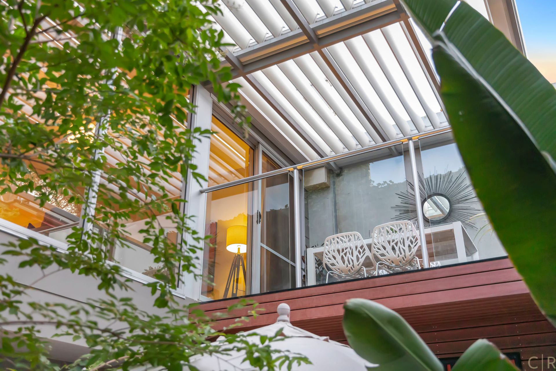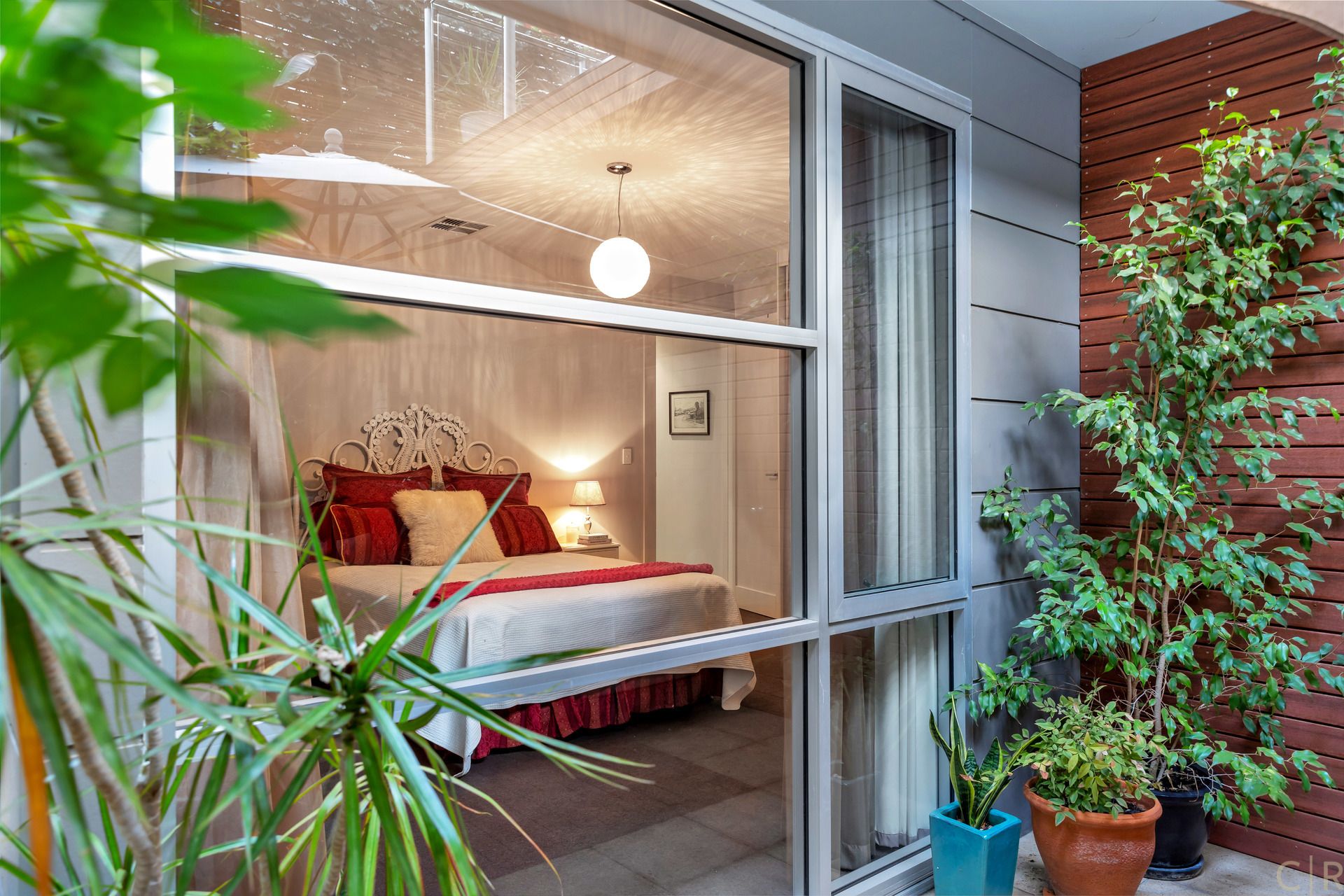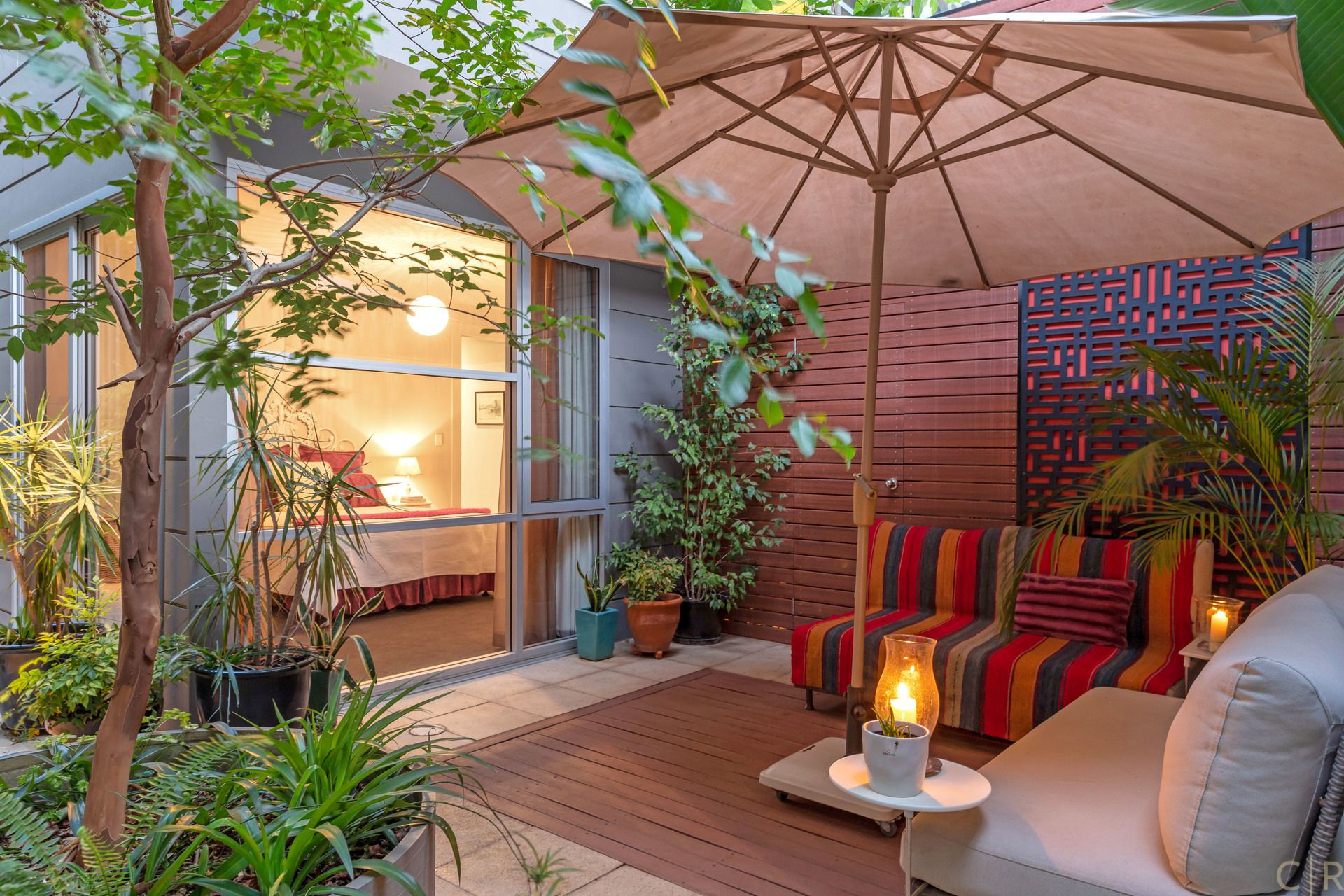 Beautiful and private rear courtyard with established greenery and discreet utility room and automatic irrigation