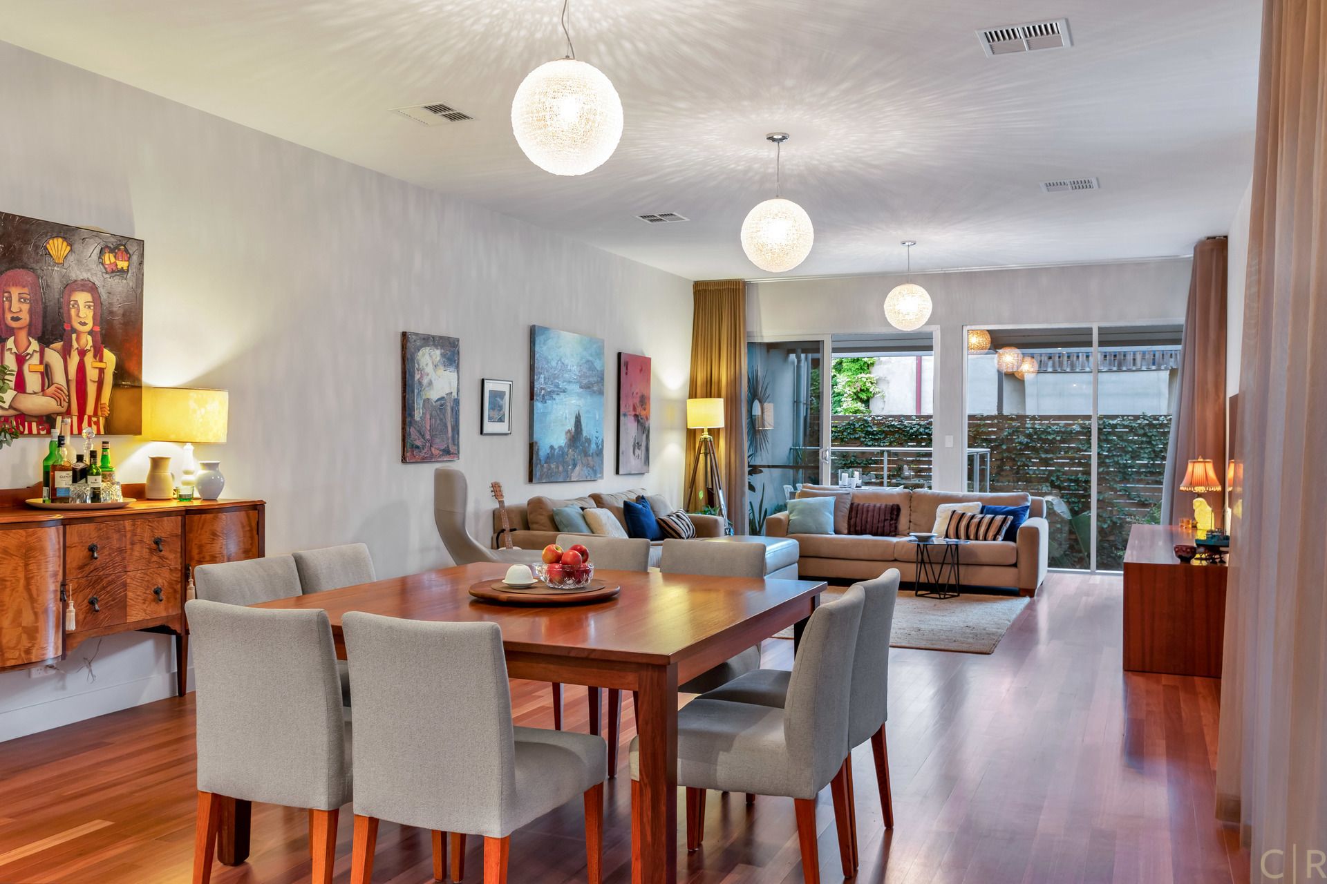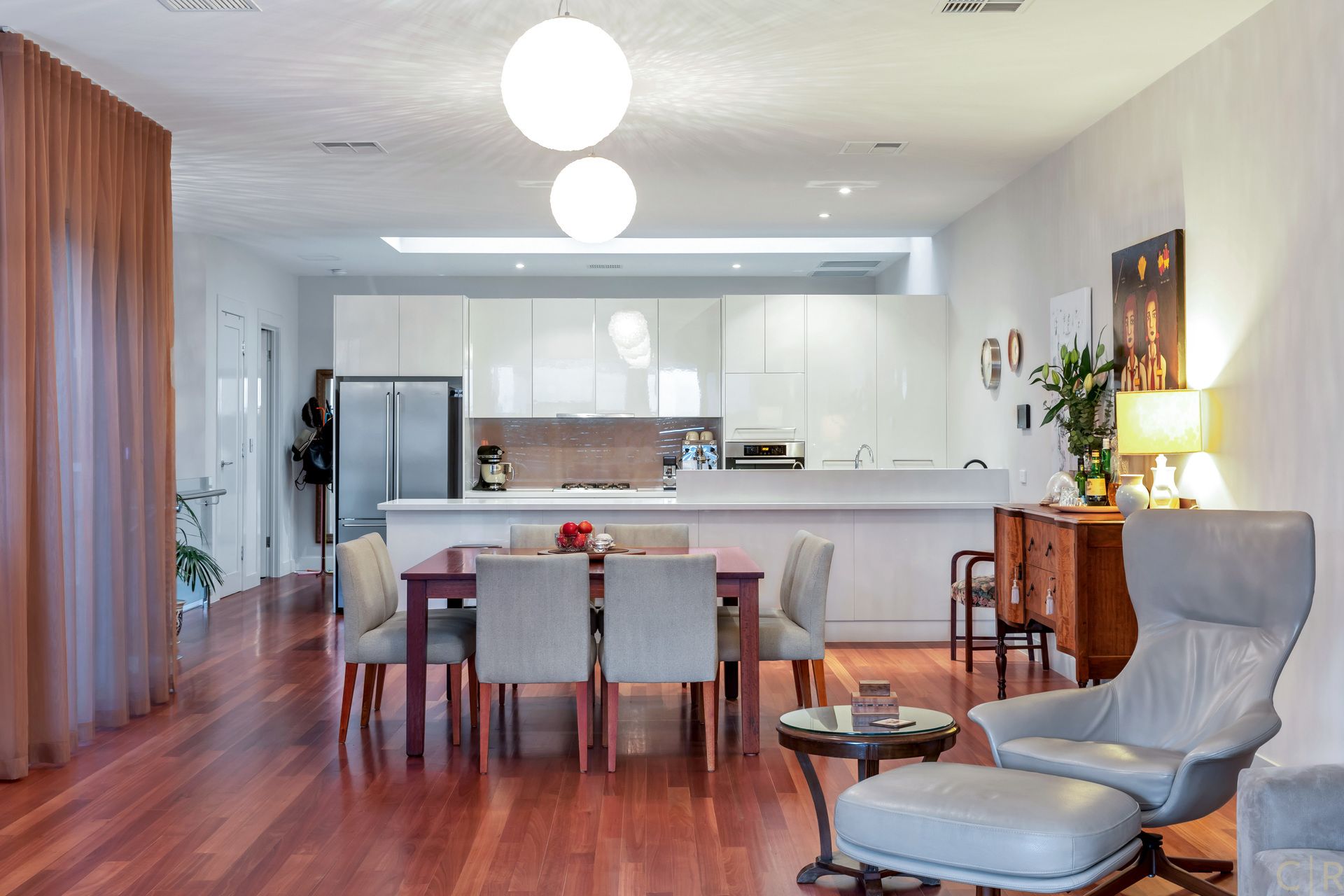 Expansive dining/ living area with gorgeous solid wood flooring