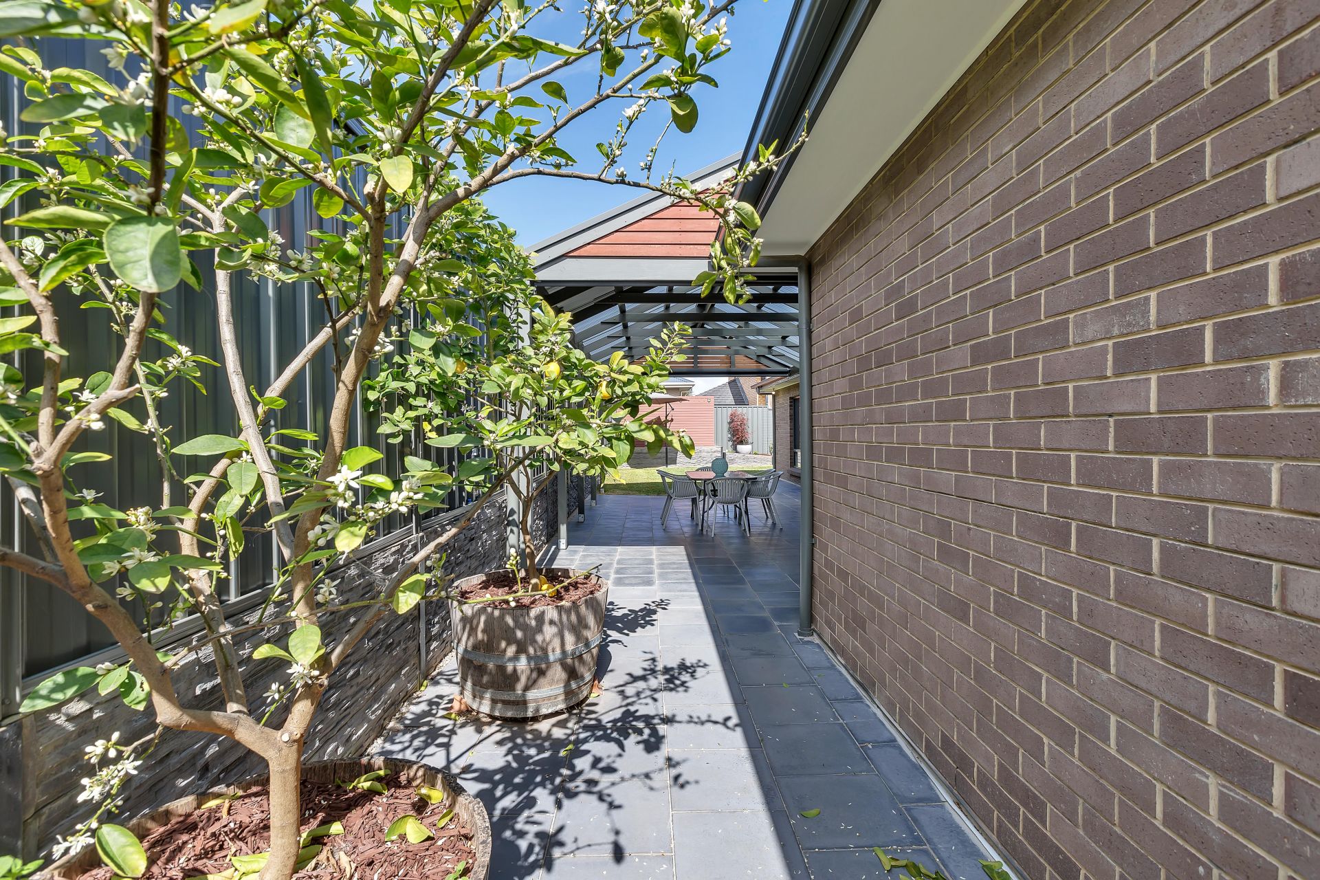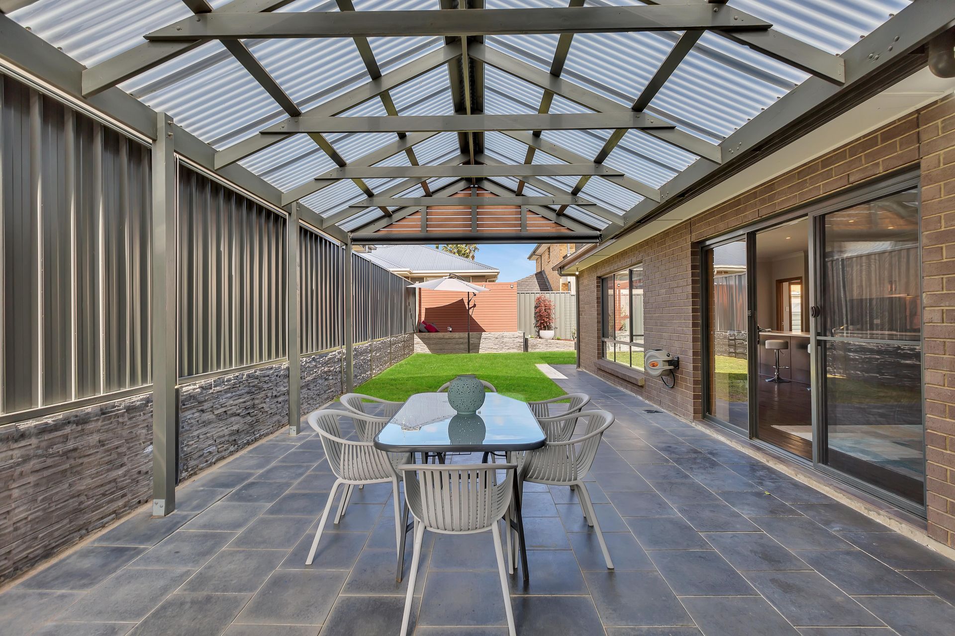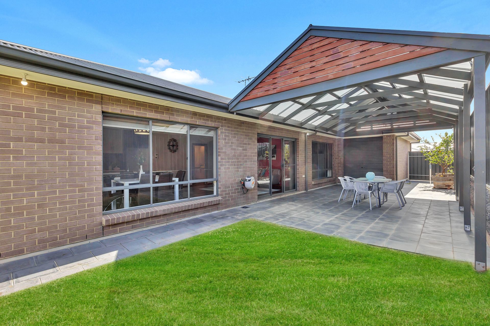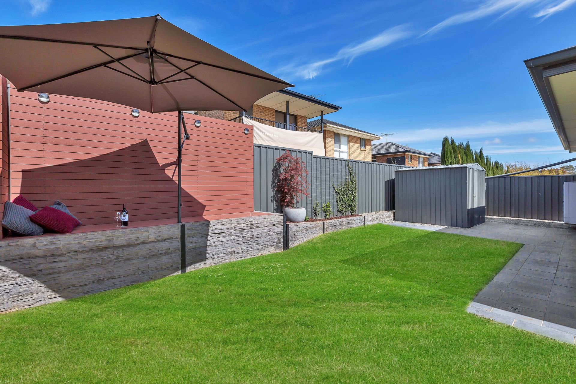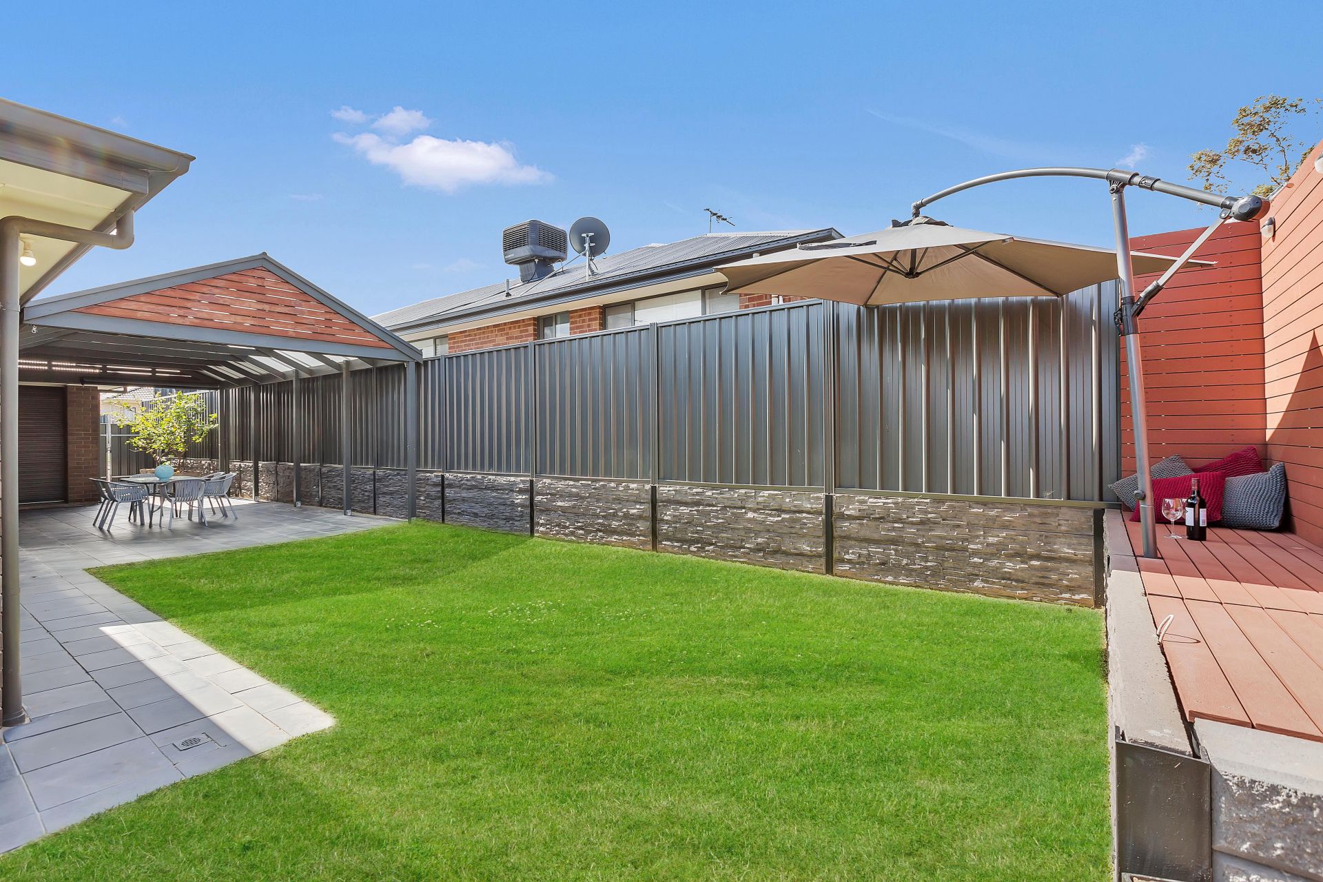 Stepping outside, there is sliding door access to the outdoor entertaining, perfect for integrating the indoor entertaining to outdoors. A pitched pergola with retractable cafe blinds is large enough for outdoor seating and the trusty bbq. A grassed area is at the back of the yard for the kids to run around and play. There is a decked seating area overlooking the backyard with room for a cantilevered umbrella and a hidden sandpit will be a wonderful surprise for the kids.