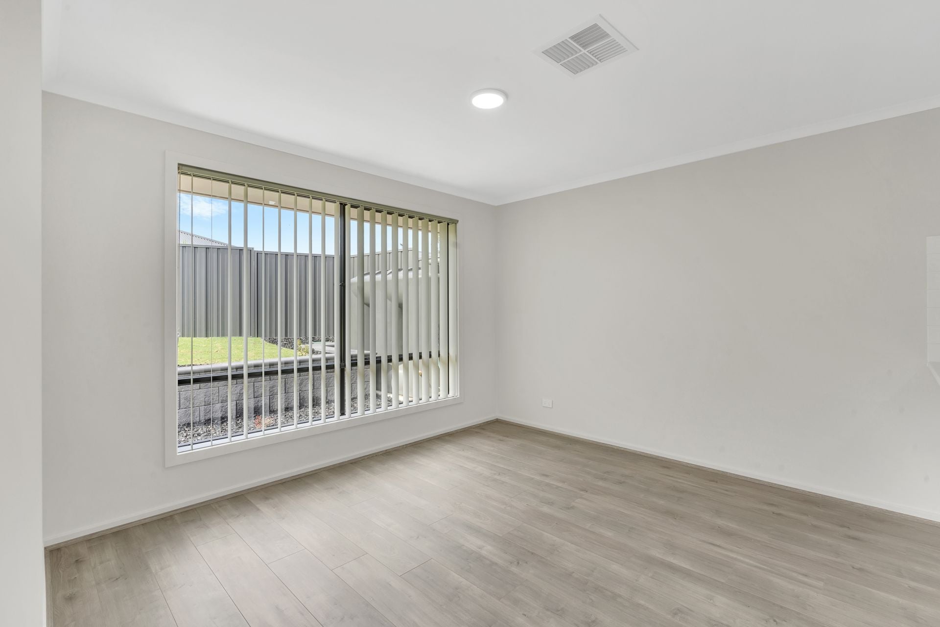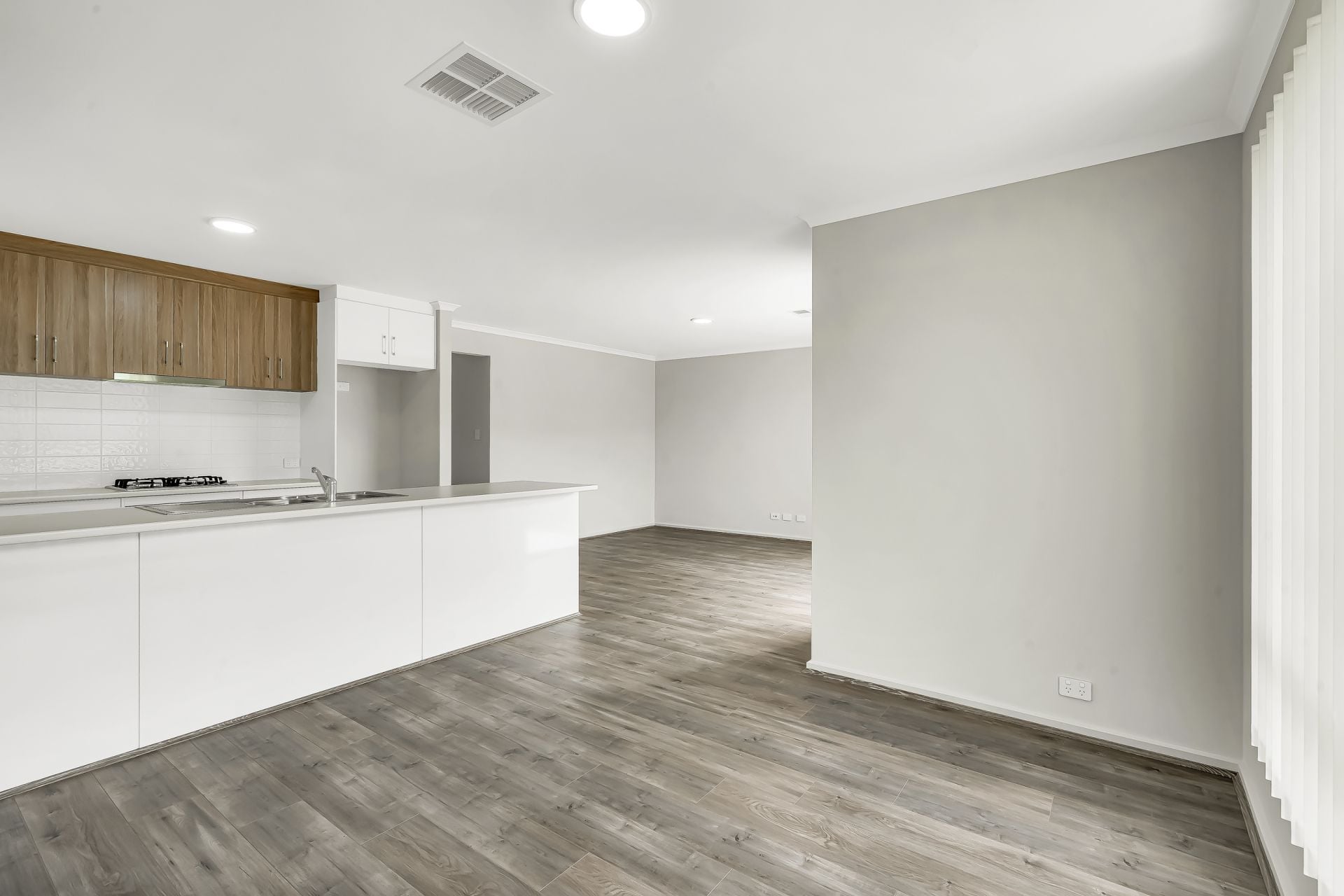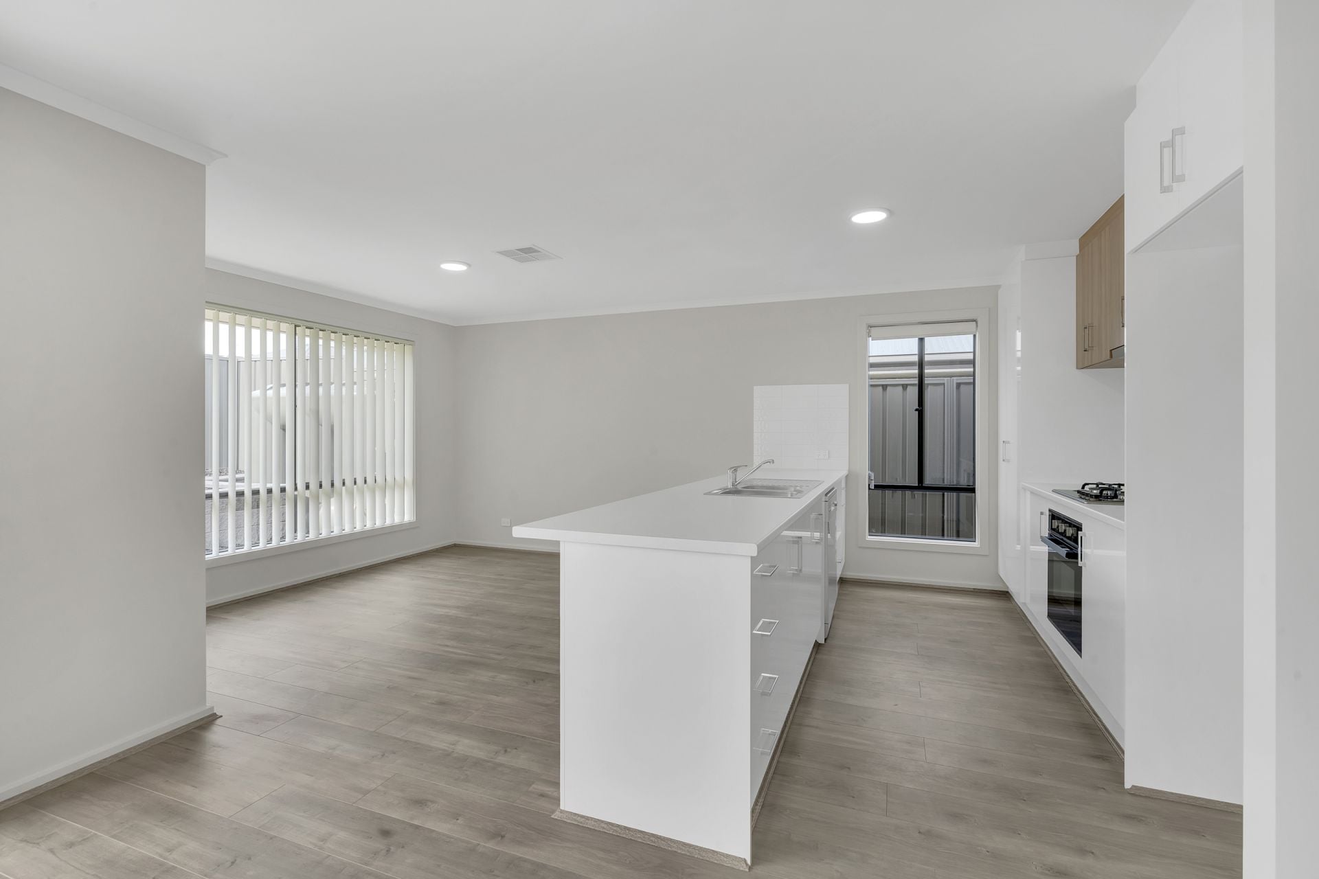 > Light filled open-plan living area includes the dining, living and kitchen.