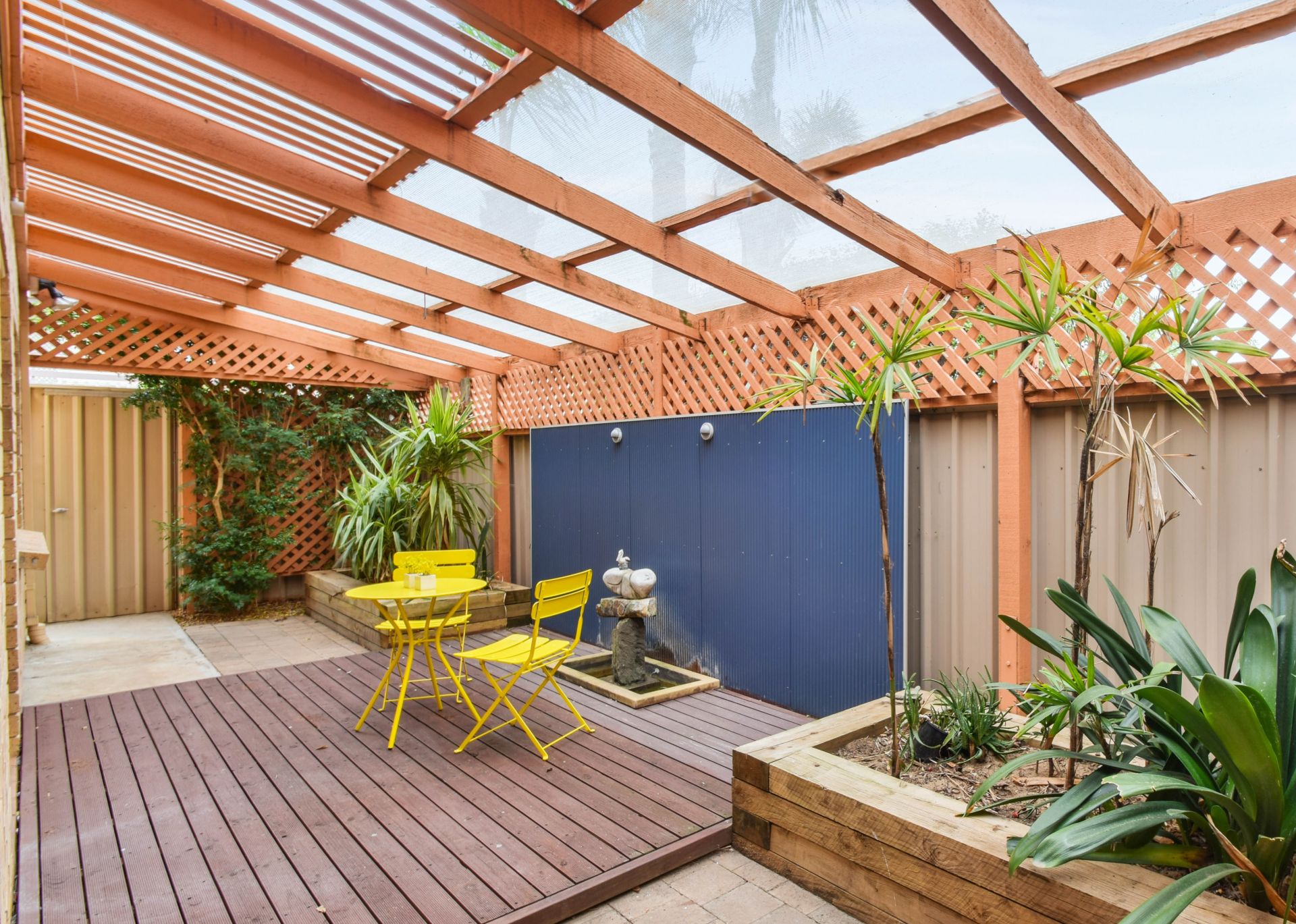 > private decked courtyard with lush tropical plants
