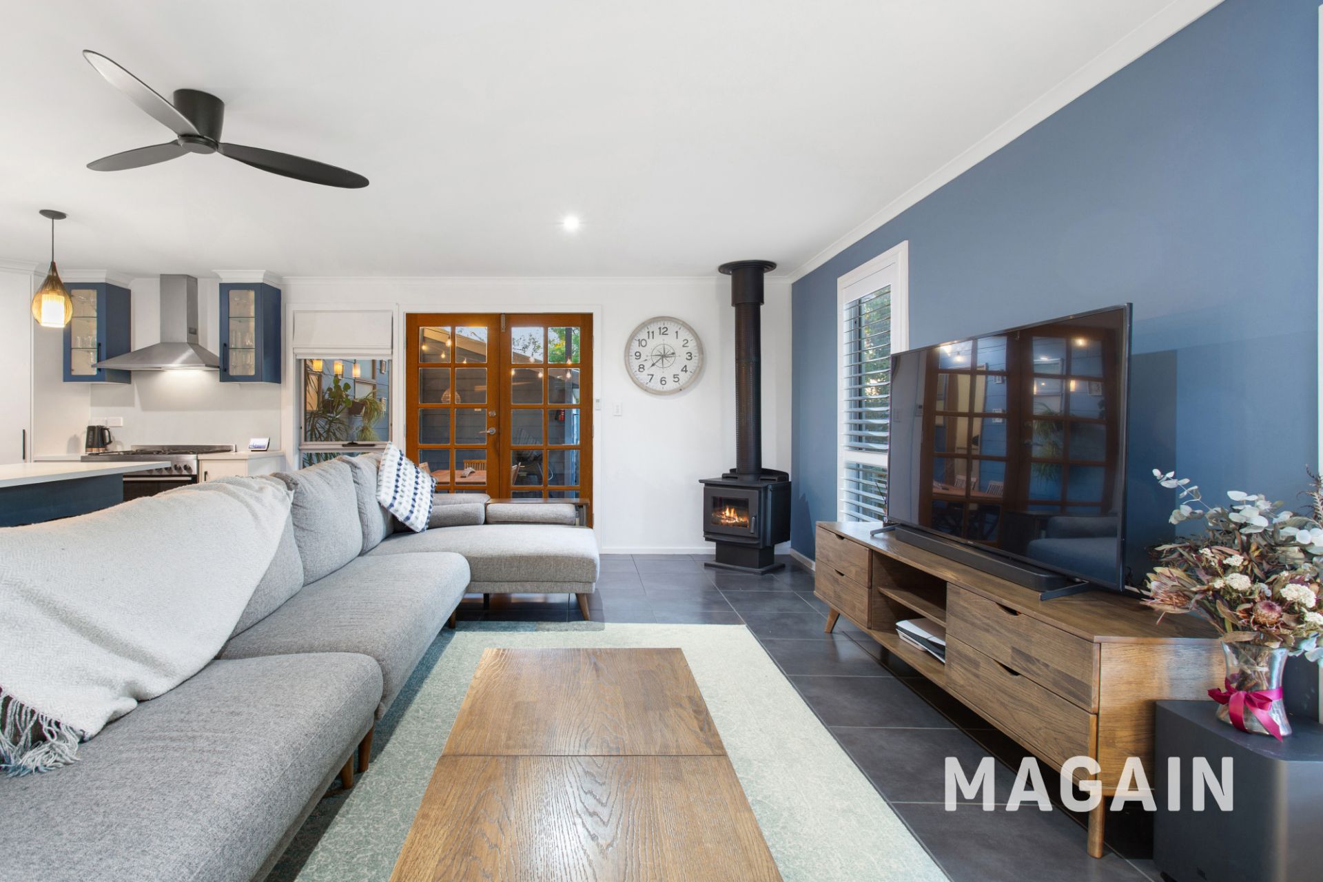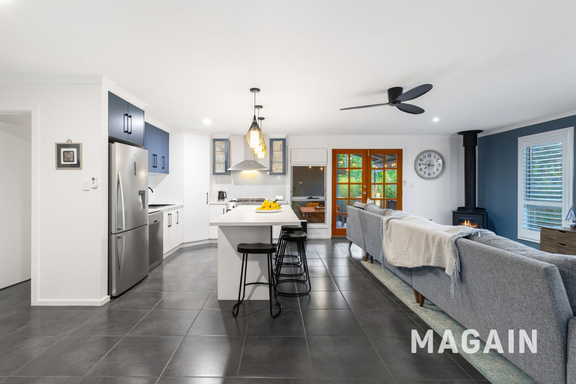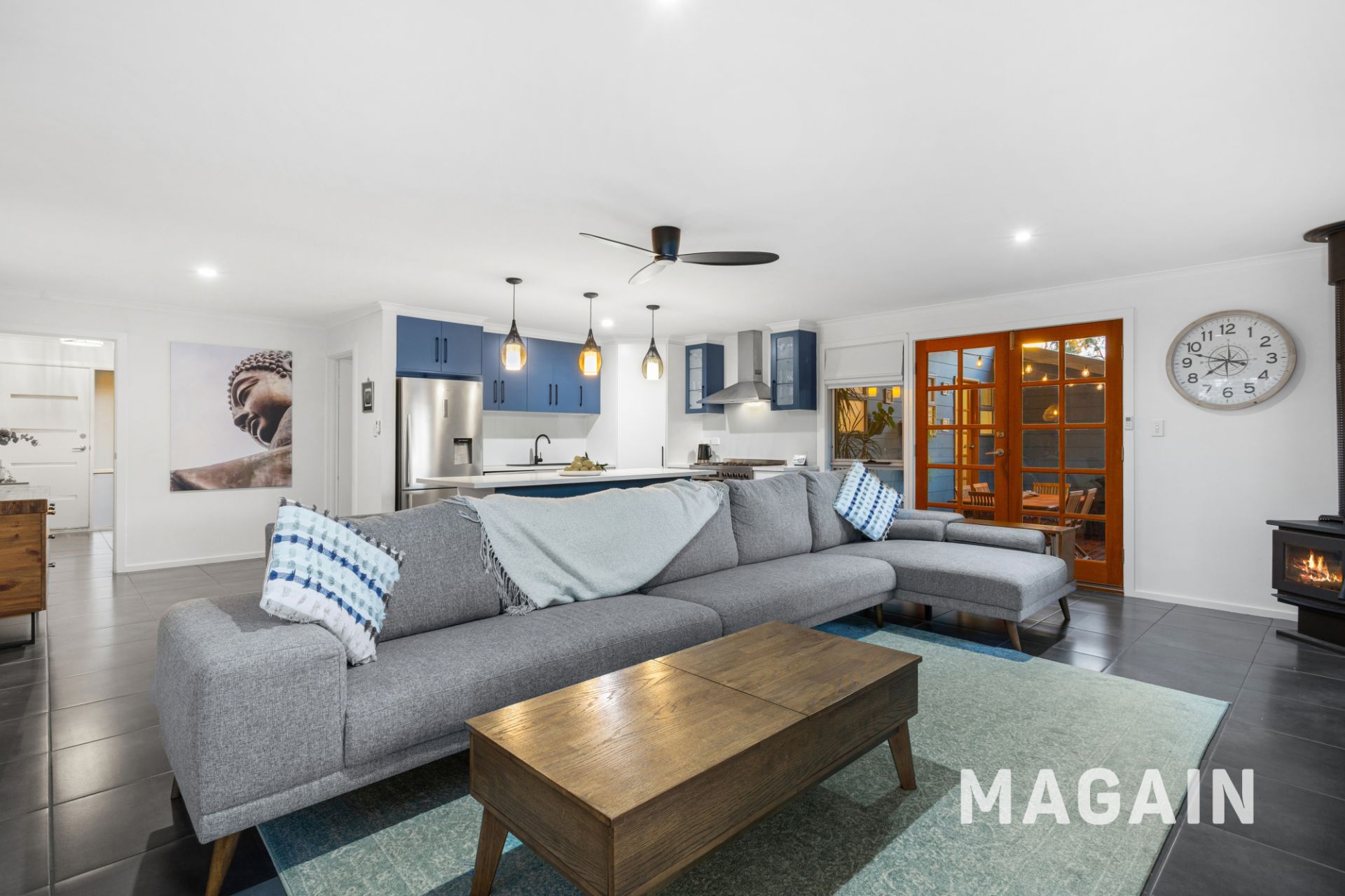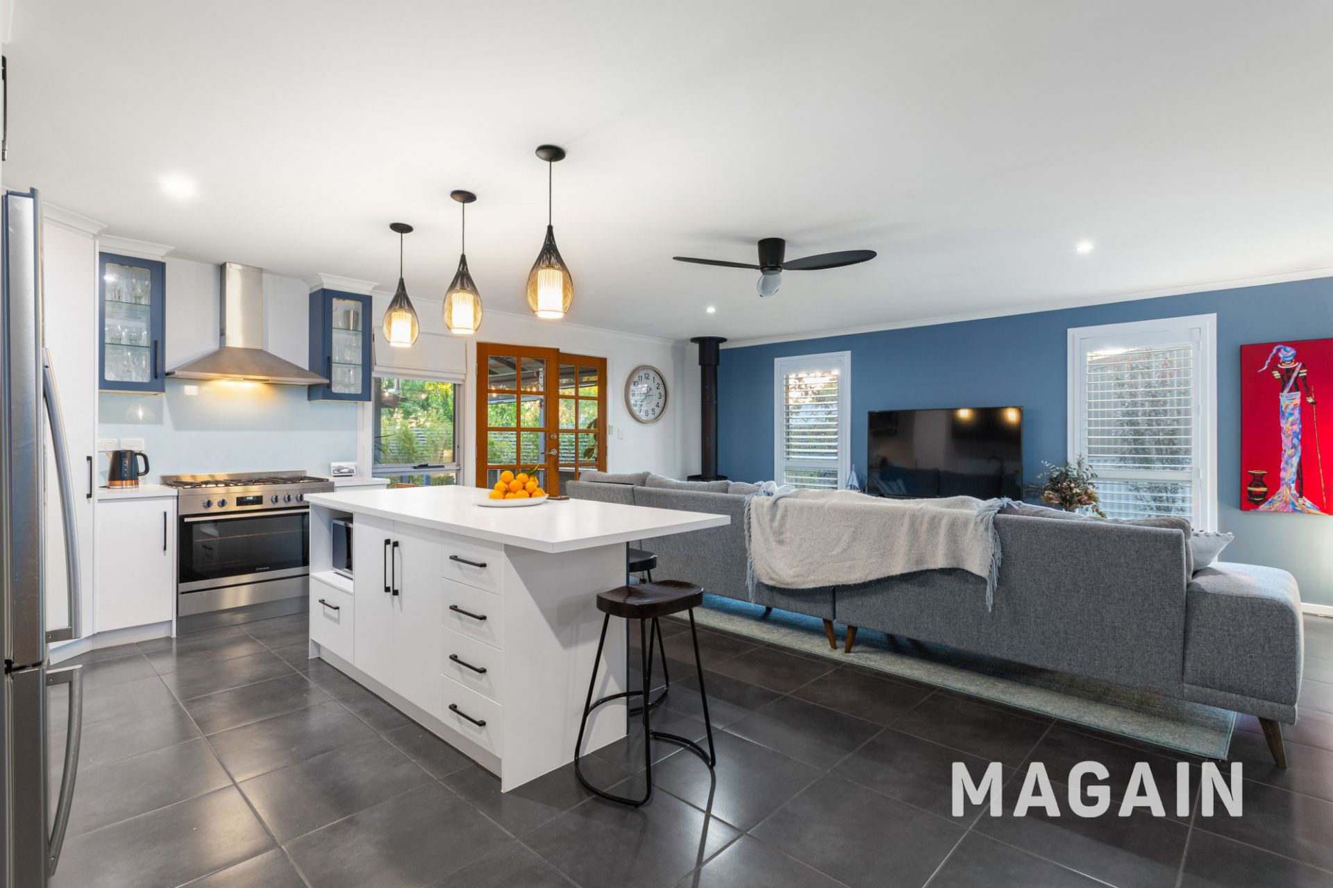Flowing down the hall, the open-plan living area impresses with its modern upgrades and relaxed appeal. The kitchen has been stylishly updated, showcasing a 900mm freestanding oven with gas cooktop, new dishwasher, feature pendant lighting, classy fixtures and a large island bench with breakfast bar seating. The living zone includes plantation shutters, ceiling fan, split system air conditioning and a slow combustion heater – perfect for year-round comfort. A separate dining room, enclosed by sliding doors, can easily serve as a home office or a versatile fourth bedroom.