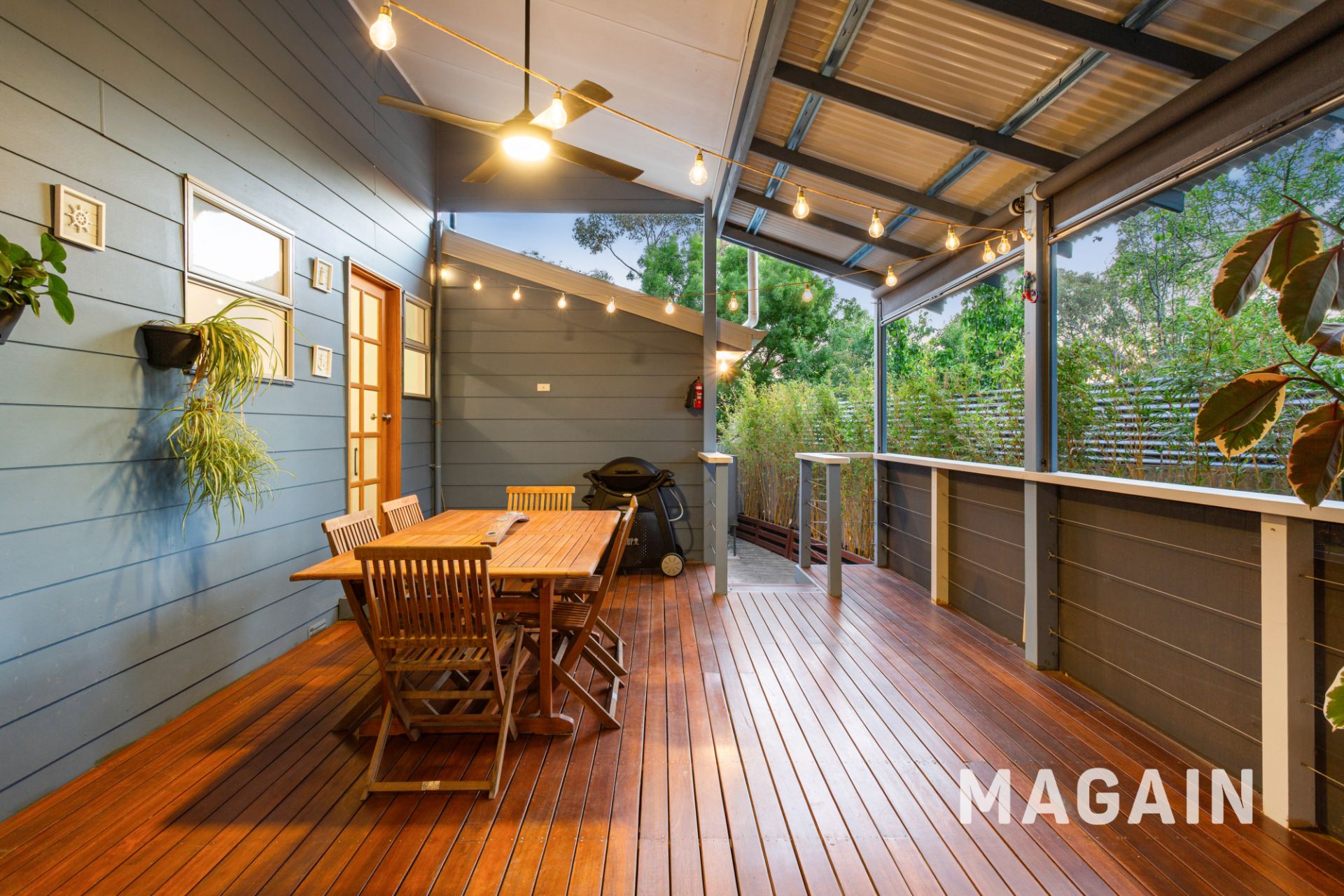 An inviting undercover timber-decked entertaining area – complete with café blinds, ceiling fan and ambient lighting is an ideal space to entertain family and friends while a private courtyard garden with bamboo screening, irrigated greenery and a side veggie patch complete this perfectly planned property.