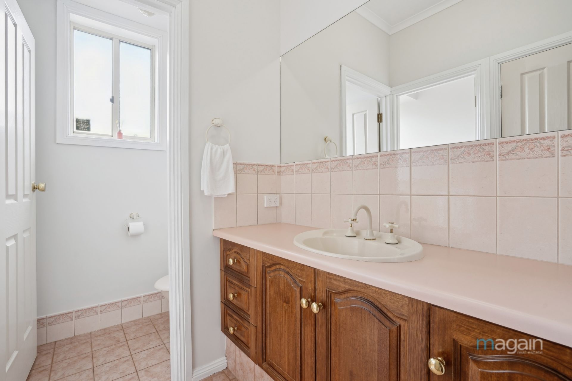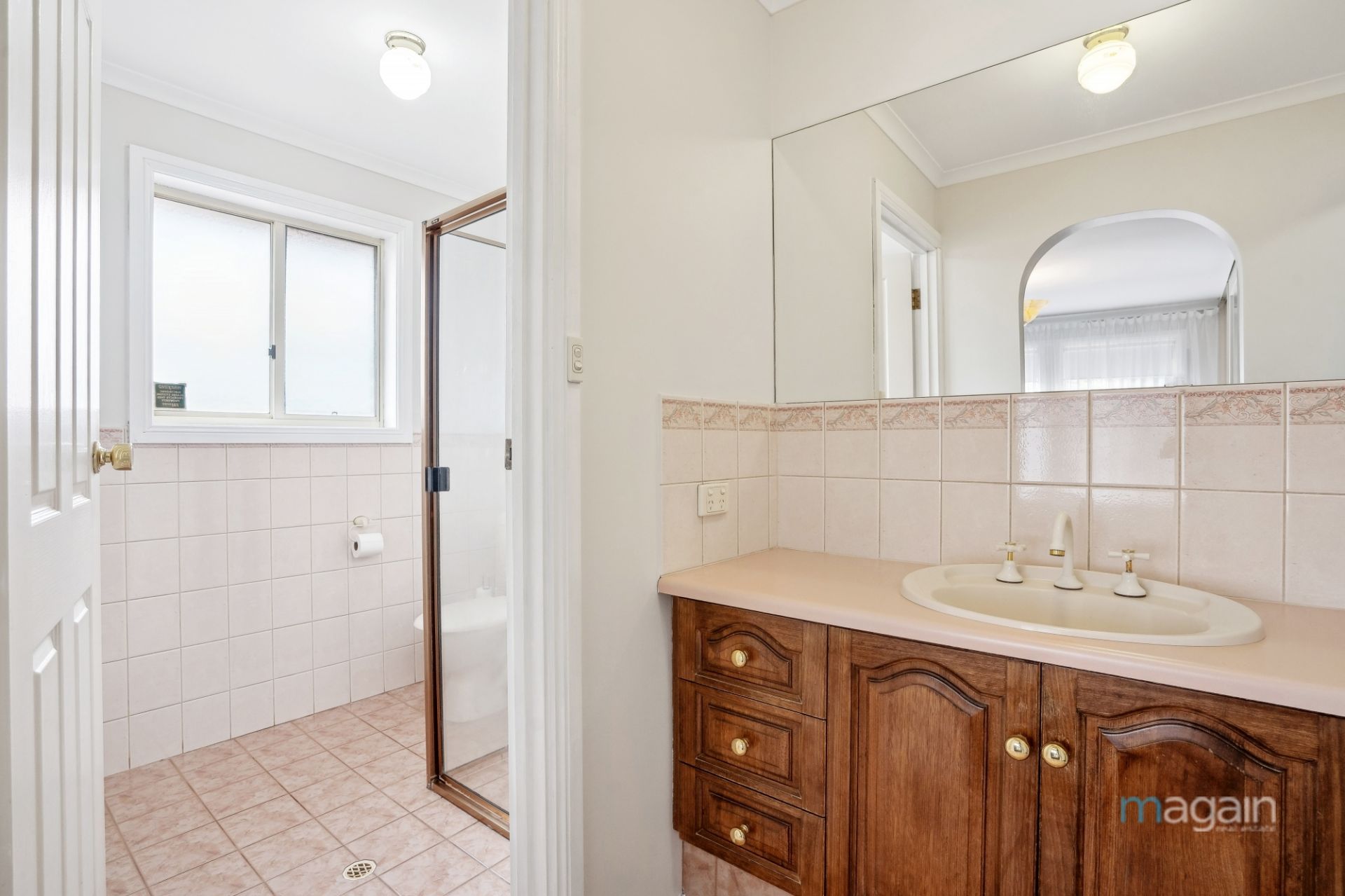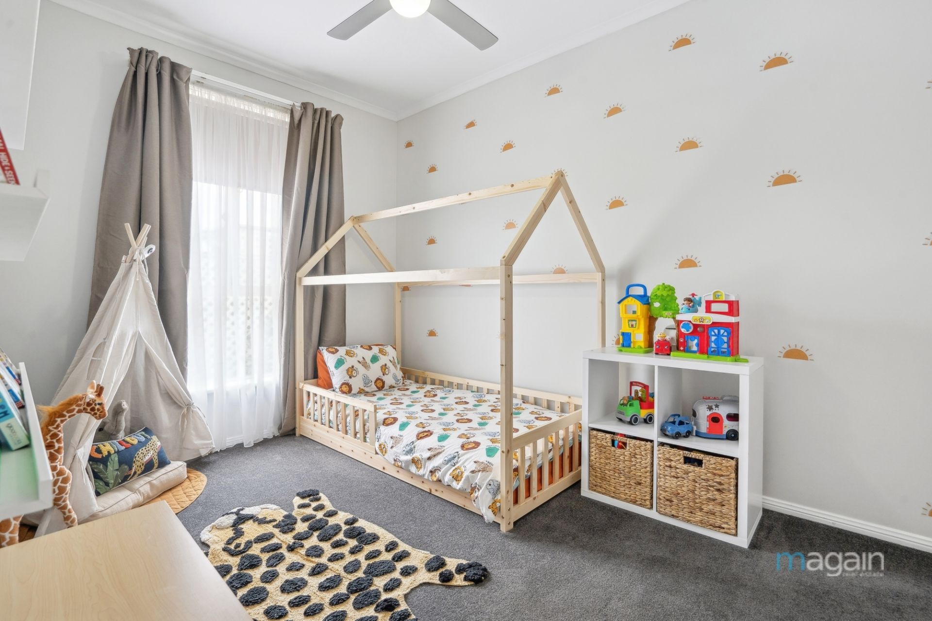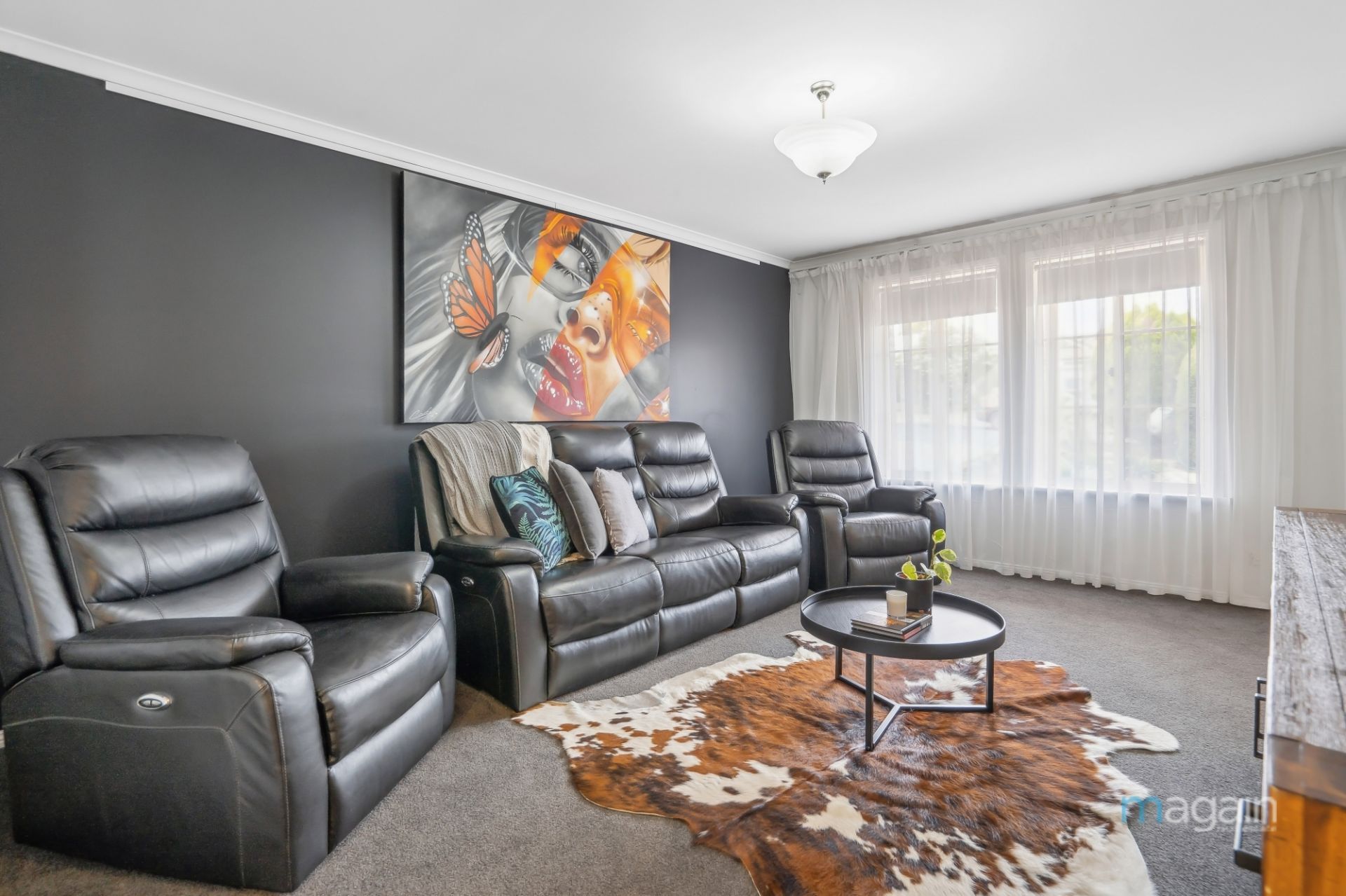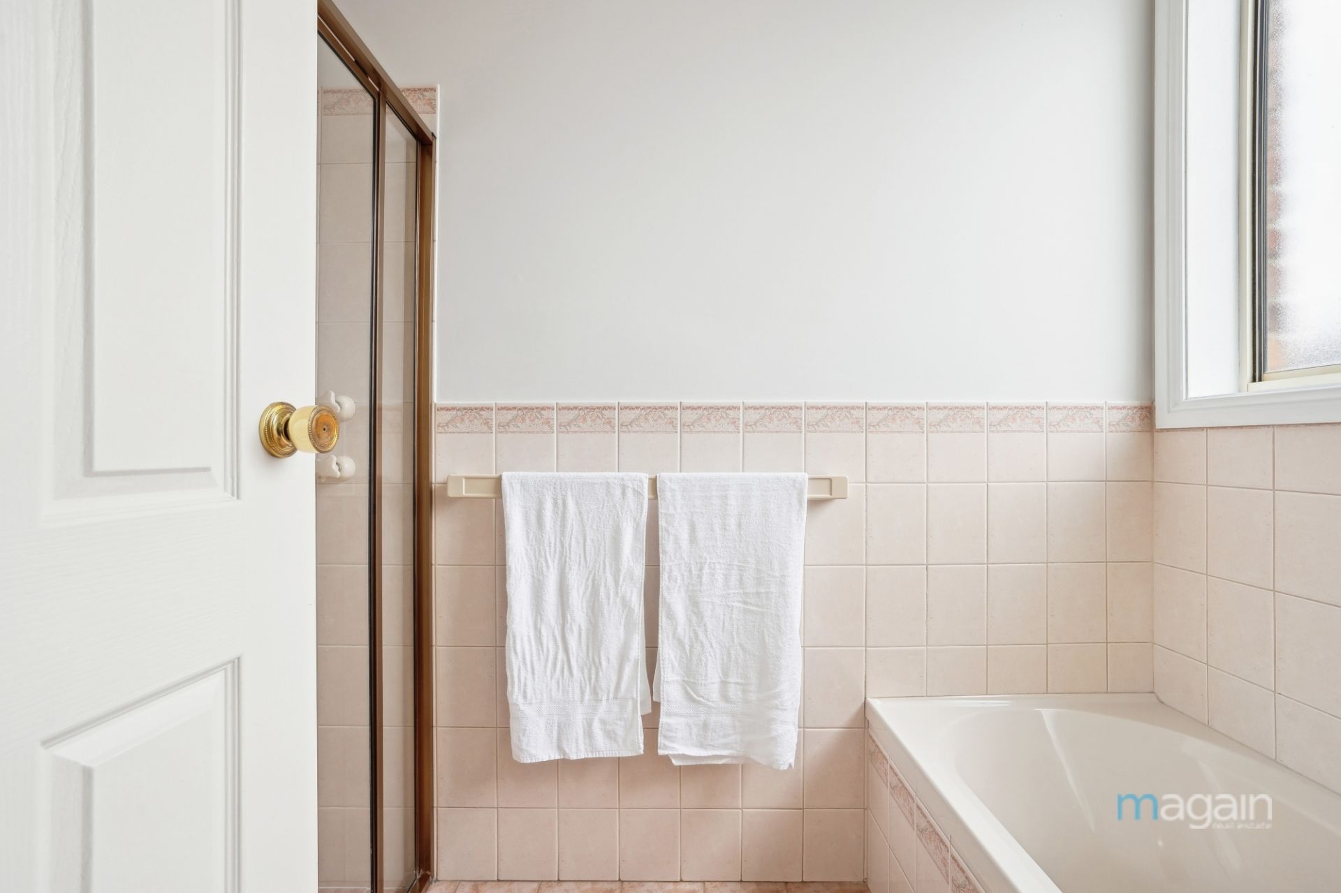 The master bedroom is a private retreat, featuring a built-in robe, ensuite, and walk-in robe. Bedrooms two and three, each with built-in robes (and a ceiling fan in bedroom two), provide comfort and practicality. The study, offering a peaceful workspace or nursery option, adds further flexibility. The cleverly designed three-way bathroom with a linen closet ensures ultimate functionality for busy family life.