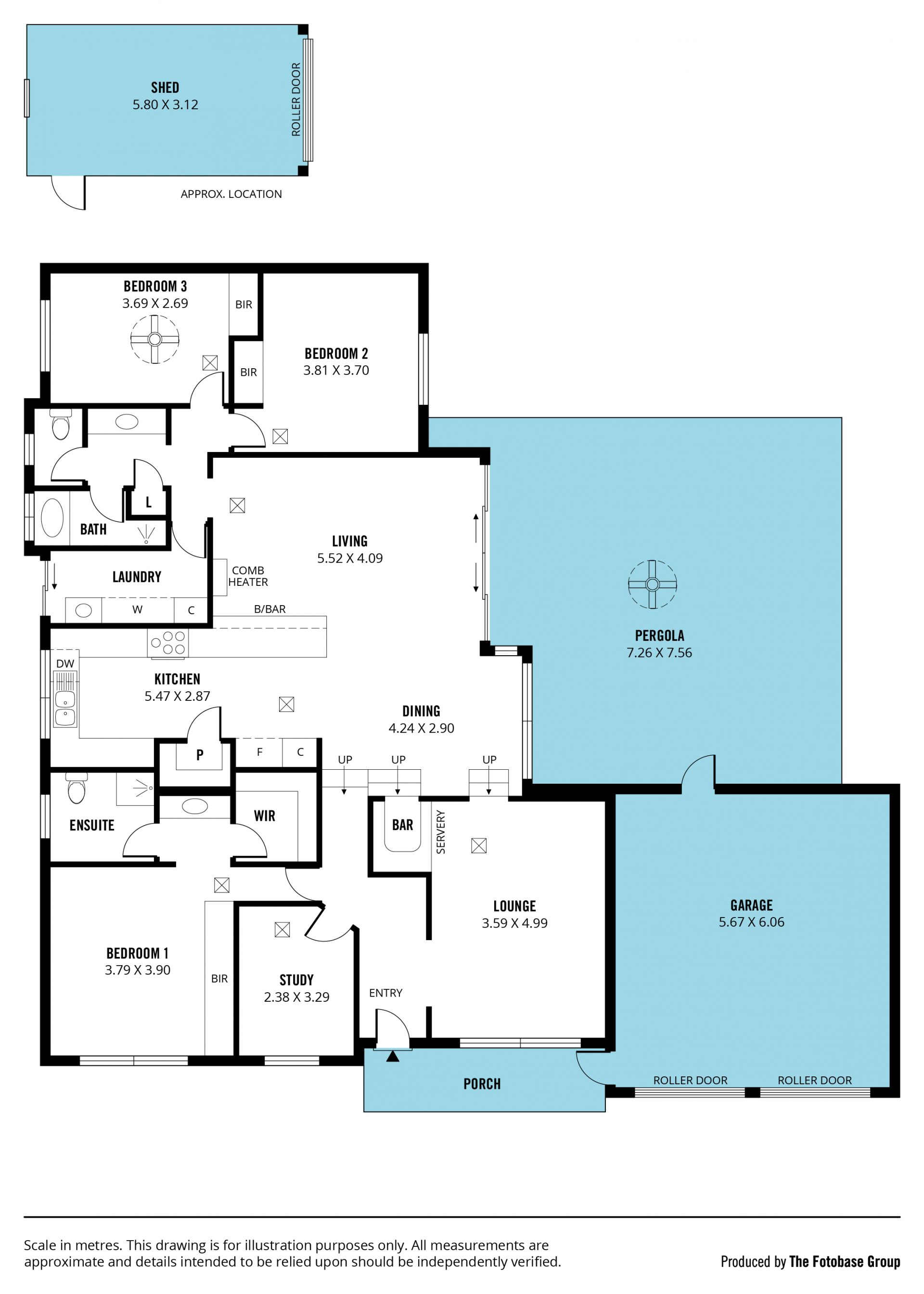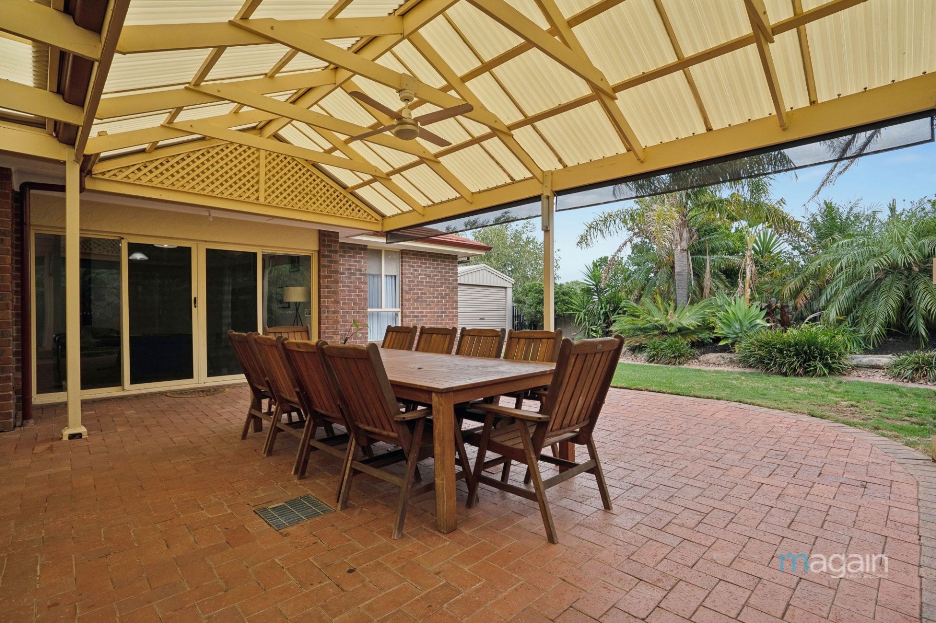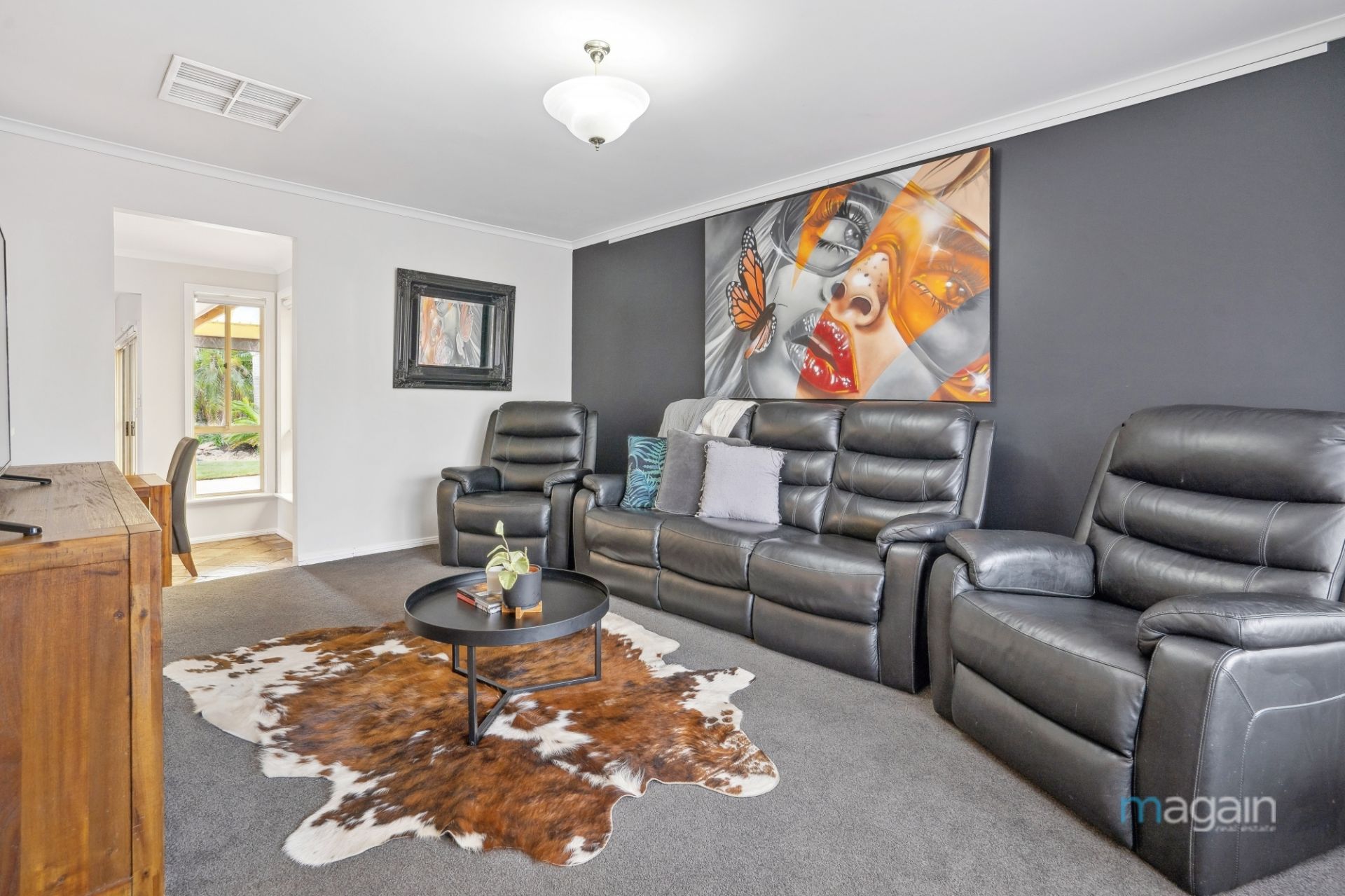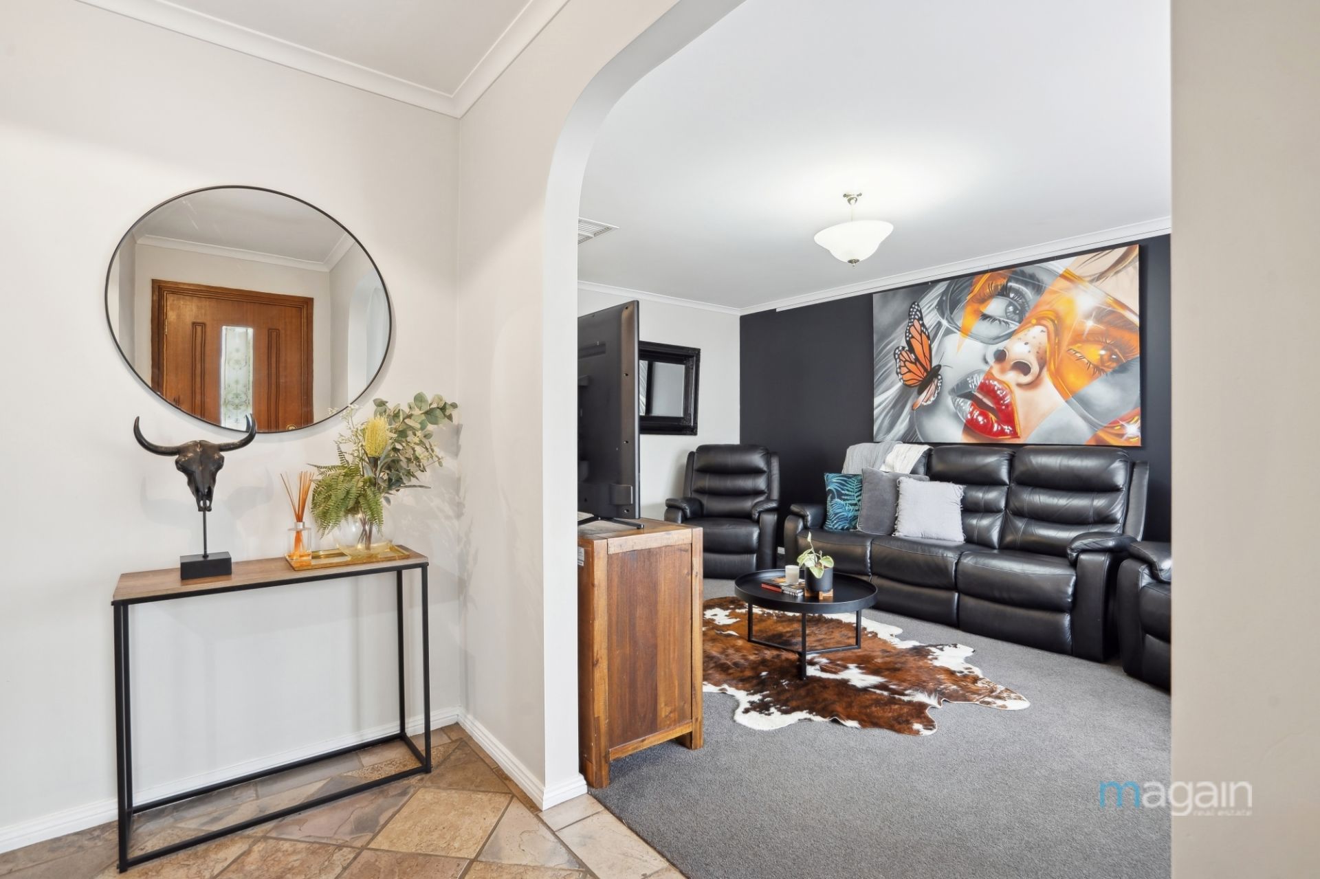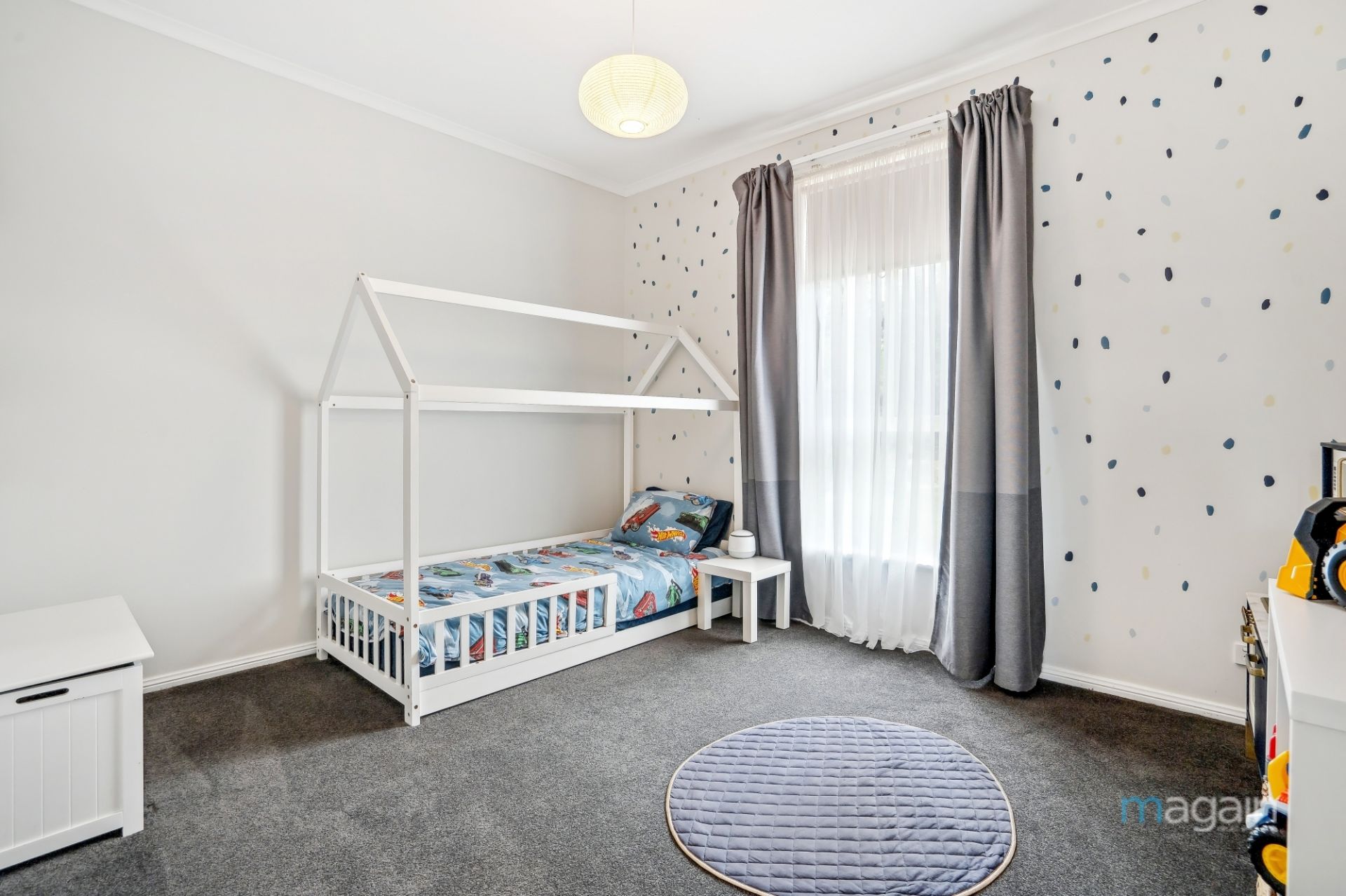 The master bedroom is a private retreat, featuring a built-in robe, ensuite, and walk-in robe. Bedrooms two and three, each with built-in robes (and a ceiling fan in bedroom two), provide comfort and practicality. The study, offering a peaceful workspace or nursery option, adds further flexibility. The cleverly designed three-way bathroom with a linen closet ensures ultimate functionality for busy family life.