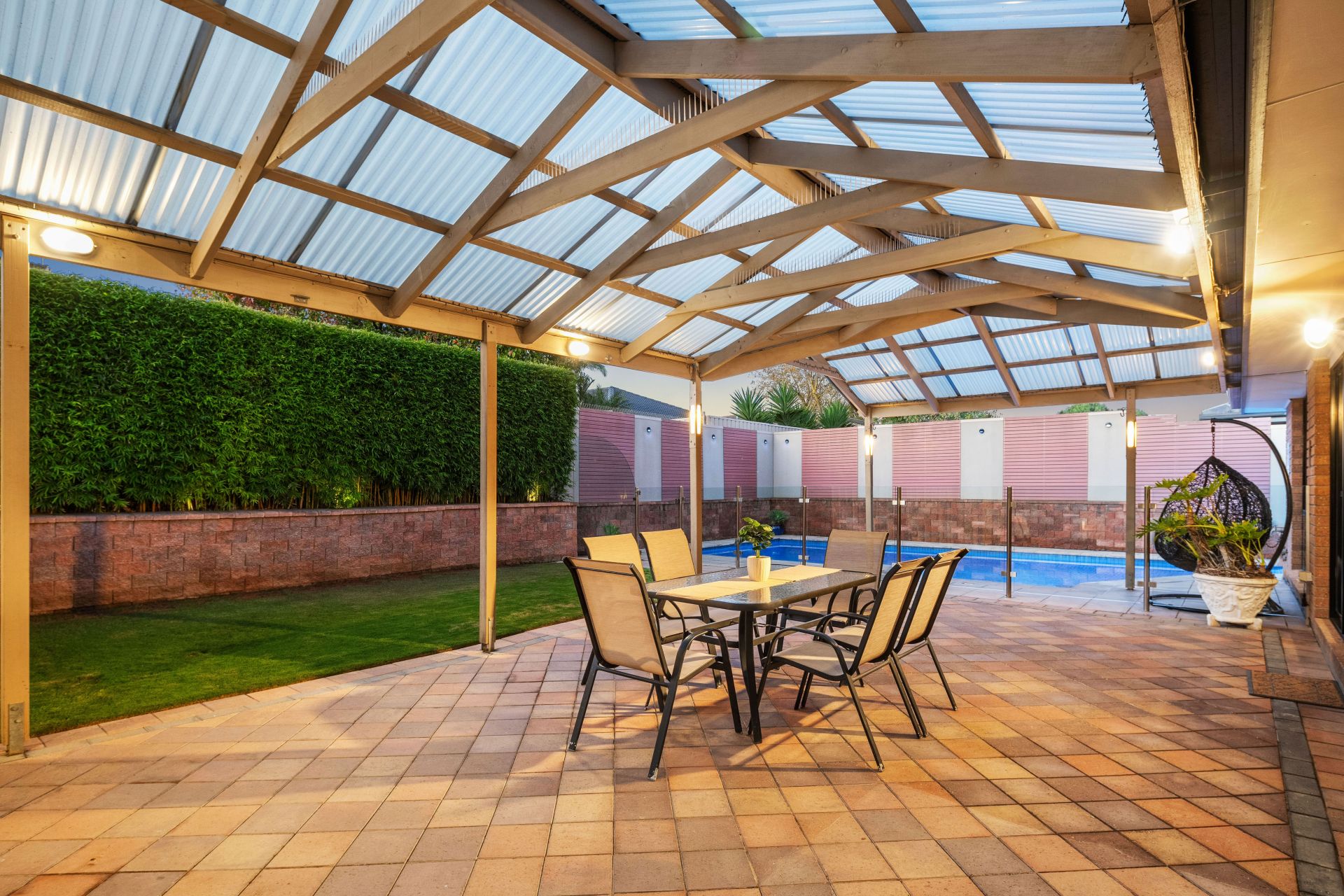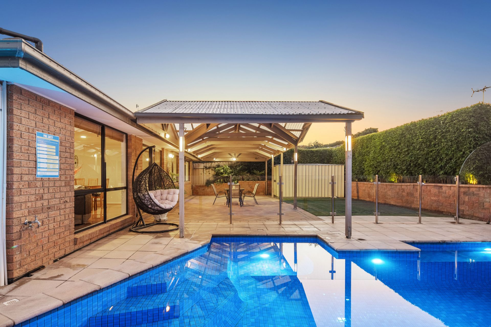 Glass sliding doors from the open-plan living provide a view and seamless access to an entertainer's paradise! Entertain family and friends in style with a spacious paved entertaining area with a pitched roof pergola and sparkling inground and solar heated, custom concrete tiled swimming pool with spa. You will also find in this beautifully landscaped backyard, a level lawn area making it the ideal place for the whole family to enjoy.