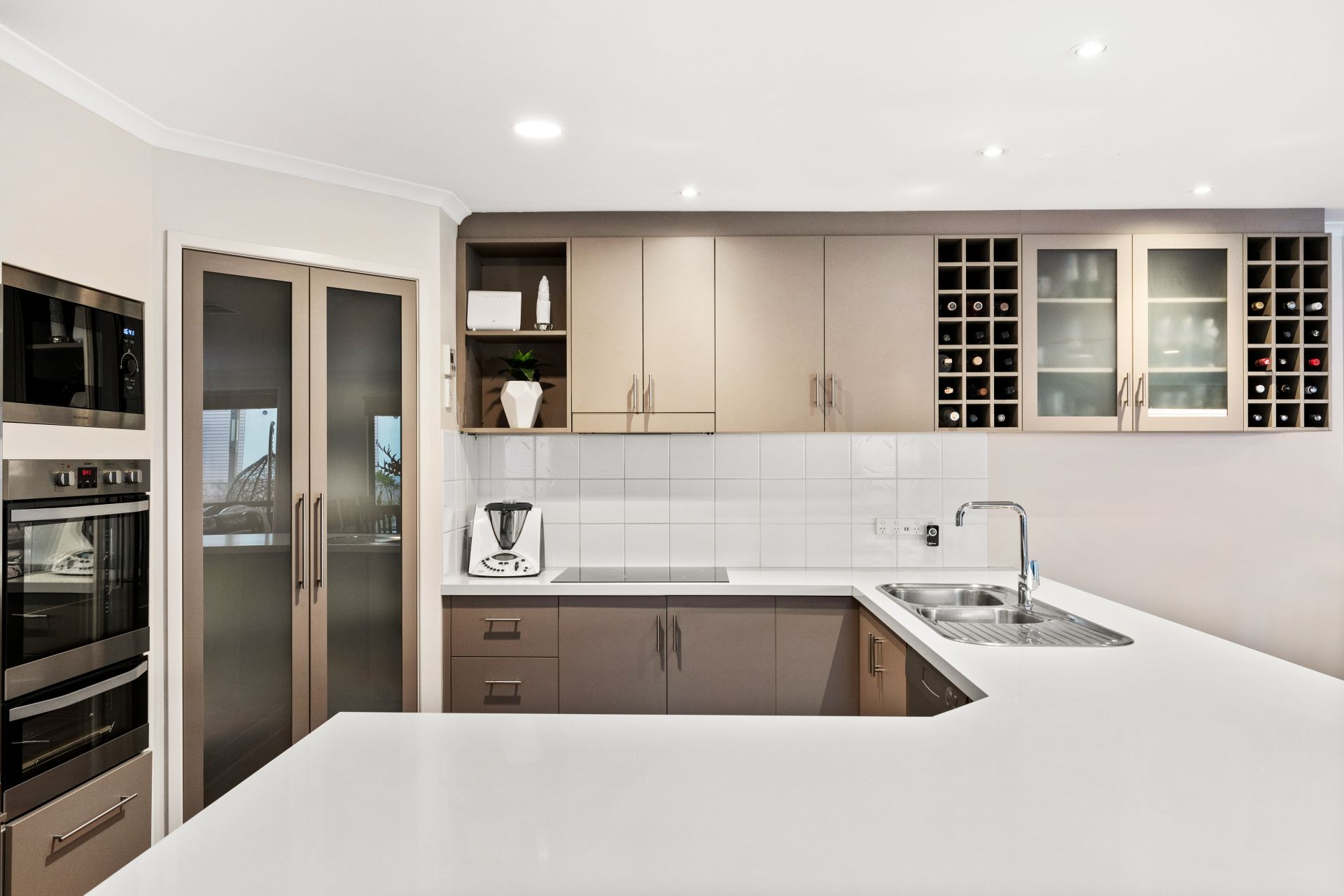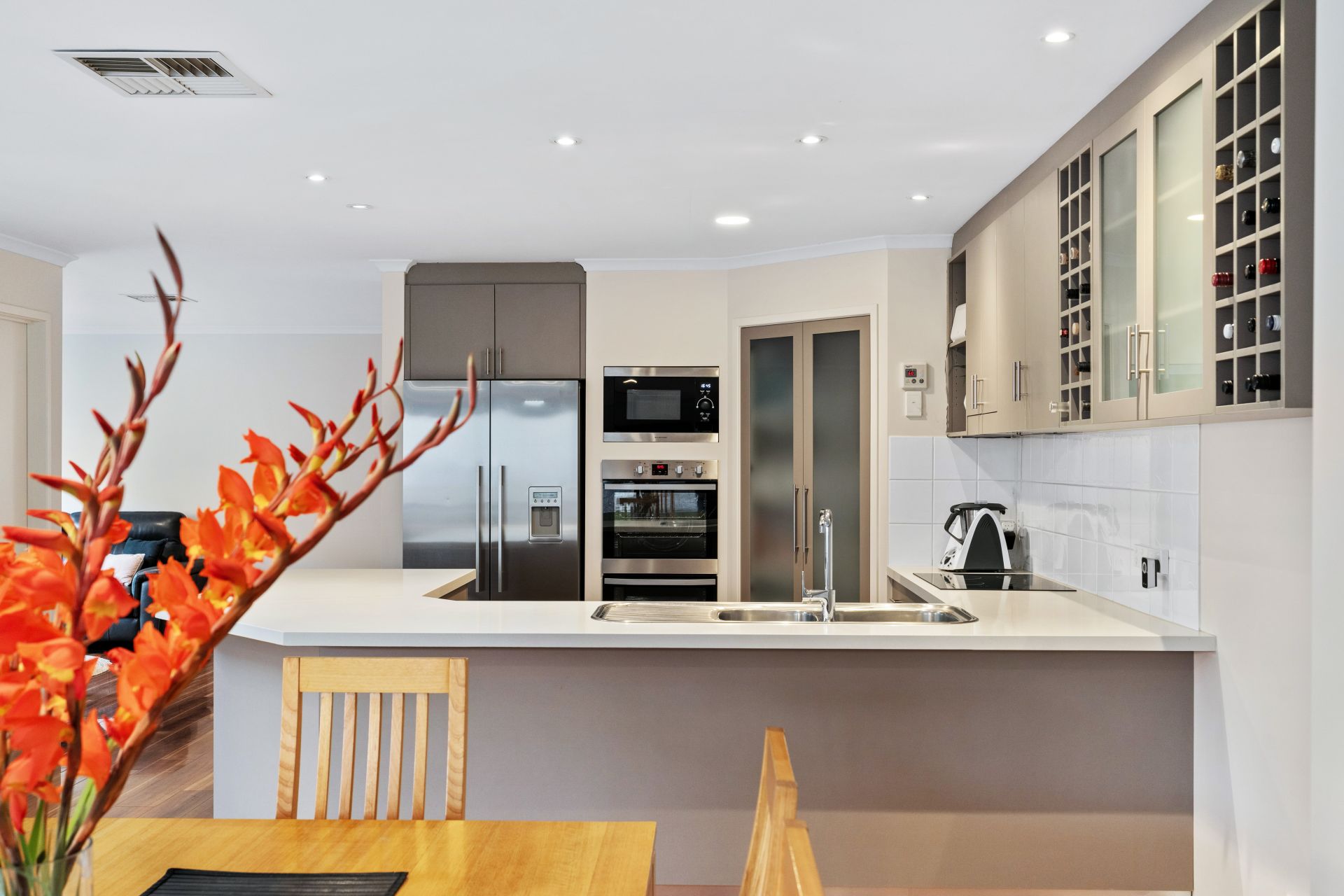 The formal lounge flows through to the modern kitchen positioned overlooking an open plan casual meals and living, which spills out through sliding doors to a paved entertaining area. The impressive gourmet kitchen is complete with stone benchtops, a corner pantry featuring frosted glass doors, and beautifully appointed with modern stainless steel appliances including a double oven, built-in microwave, an electric cooktop, and dishwasher plus a well-designed breakfast bar providing a fantastic space for entertaining guests while also allowing for maximum storage and preparation space.