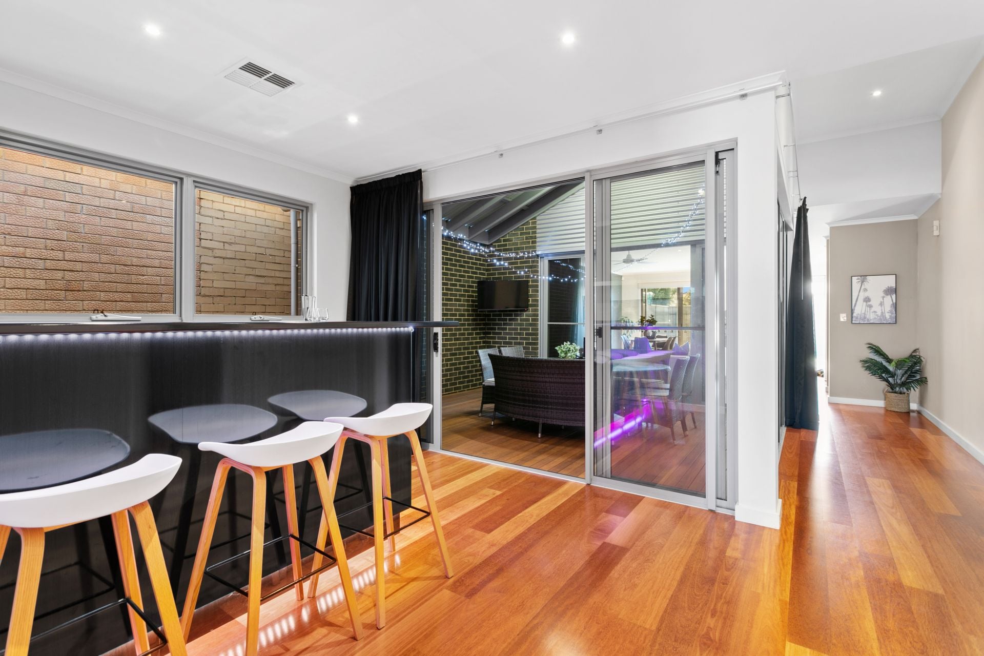 Flowing into the home further you're met with the second living area, converted to a professionally-installed full wet bar, equipped with mood lighting, bar fridge, sink and wine rack, making this the perfect home for those that love to entertain.
