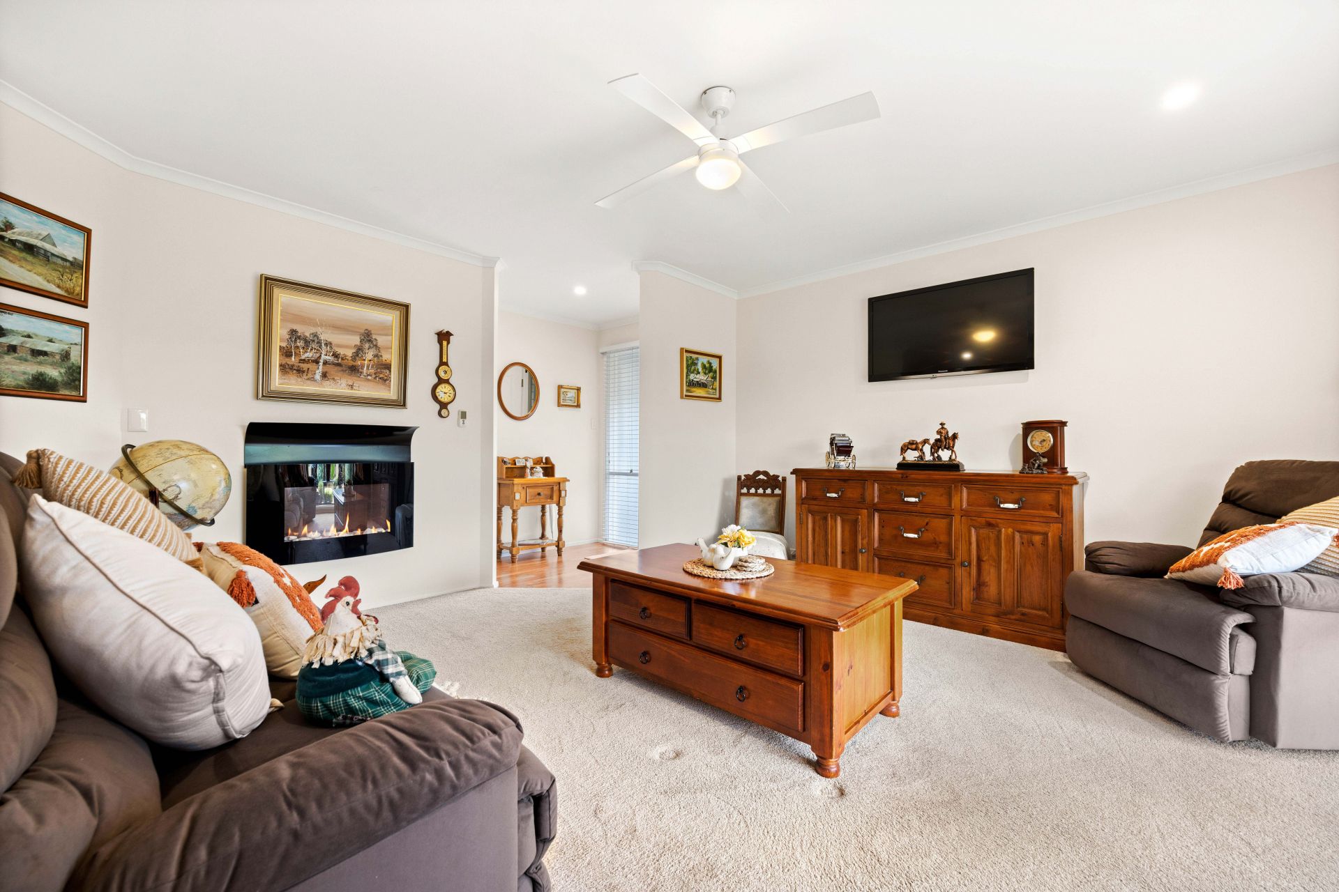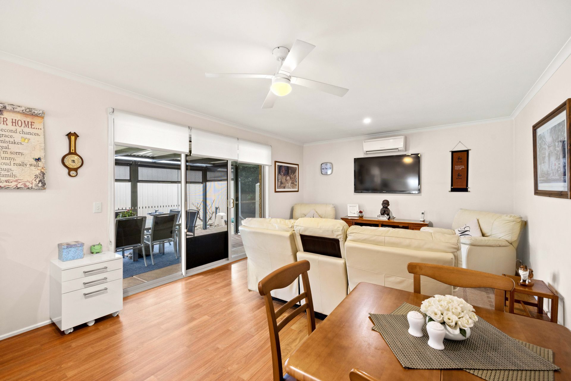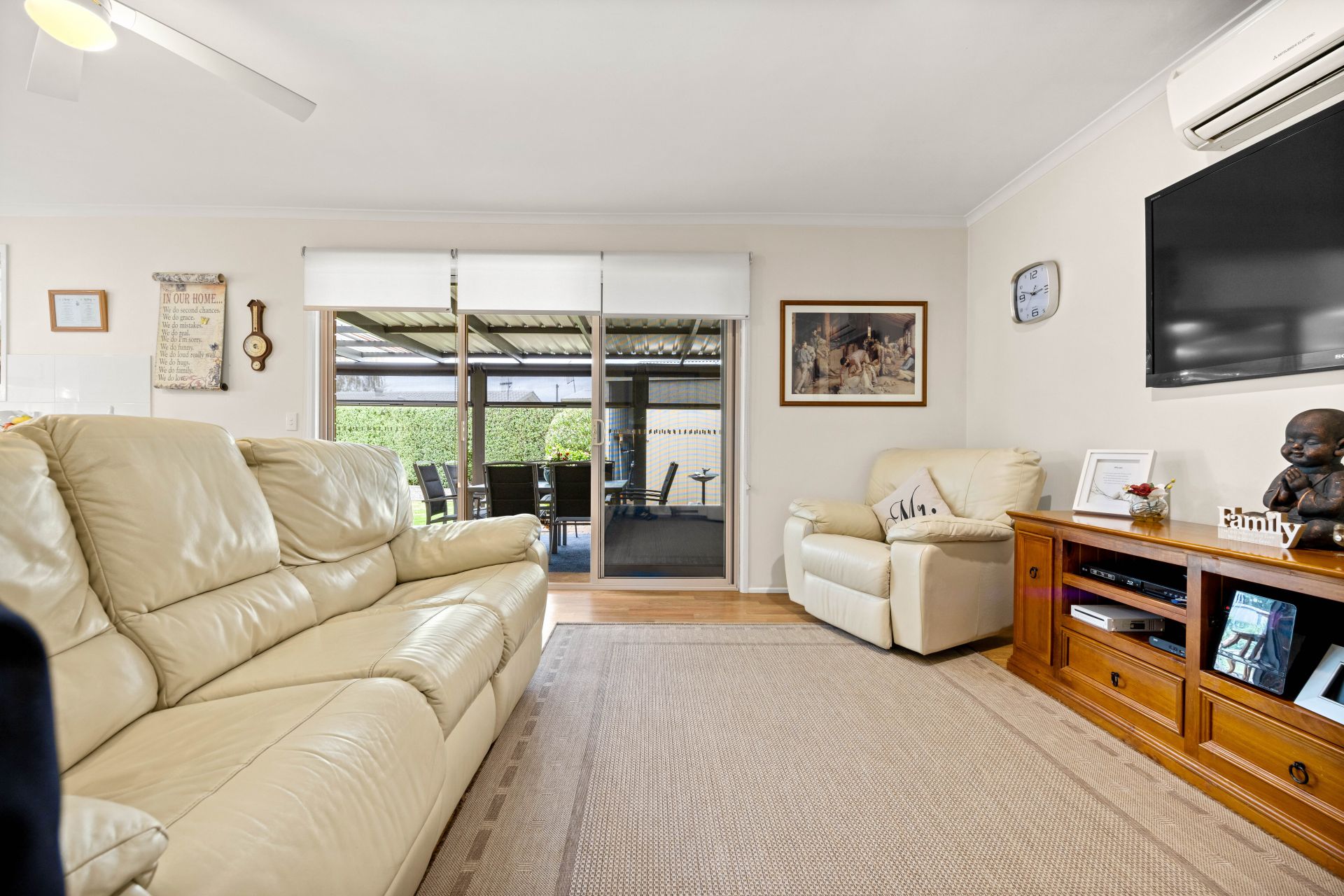 Stepping inside the home you are greeted into a formal entrance hall with all the bedrooms down one side of the home and the living areas on the other. The formal living room is the perfect evening retreat, an electric heater & ceiling fan will keep this room comfortable in all seasons, while the room is filled with an abundance of natural light via the large window that overlooks the rear yard. An adjoining dining room is ideal for entertaining larger groups in a more formal setting……it also has lovely views onto the backyard. At the rear of the home is the open plan kitchen, meals area and family room with convenient sliding door access to the outdoor entertaining area. The well-appointed modern kitchen is gorgeous, presented in sparkling white tones it offers all electric appliances including a dishwasher along with ample storage and plenty of bench space for meal prep. Comprising three bedrooms, the master suite offers a walk-through robe with access into the ensuite bathroom, while the remaining two bedrooms have built-in robes and all the bedrooms have carpet floors that providing warmth & comfort. Centrally positioned between the two secondary bedrooms is the family bathroom, presented with heritage floor tiles, a shower with glass screen, a vanity unit with storage plus the convenience of a separate toilet. Additional features include a reverse cycle split system air conditioner and ceiling fan in the family room, solar panels to minimize the electricity bills, LED downlights throughout, a ceiling fan in the master bedroom, easy care vinyl flooring in the formal dine and open plan kitchen/meals & family plus a large built-in linen cupboard.
