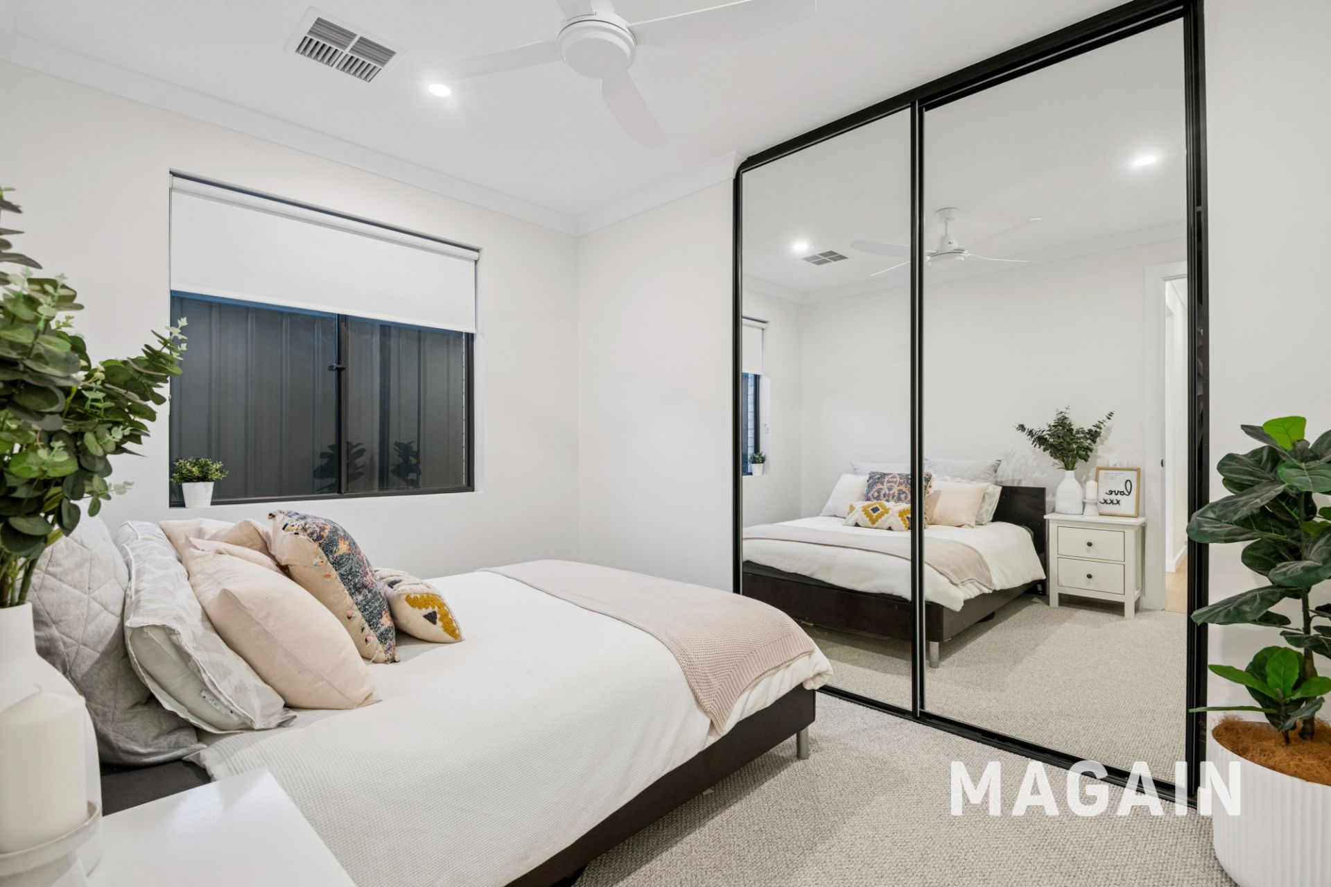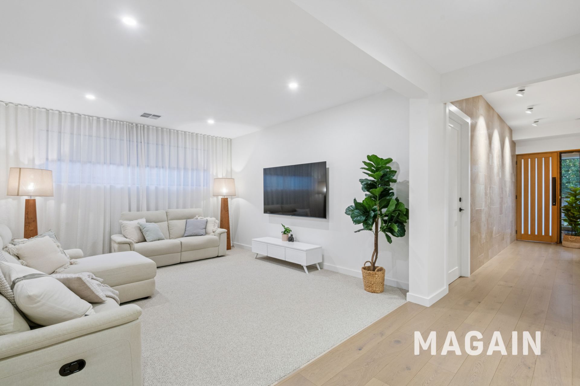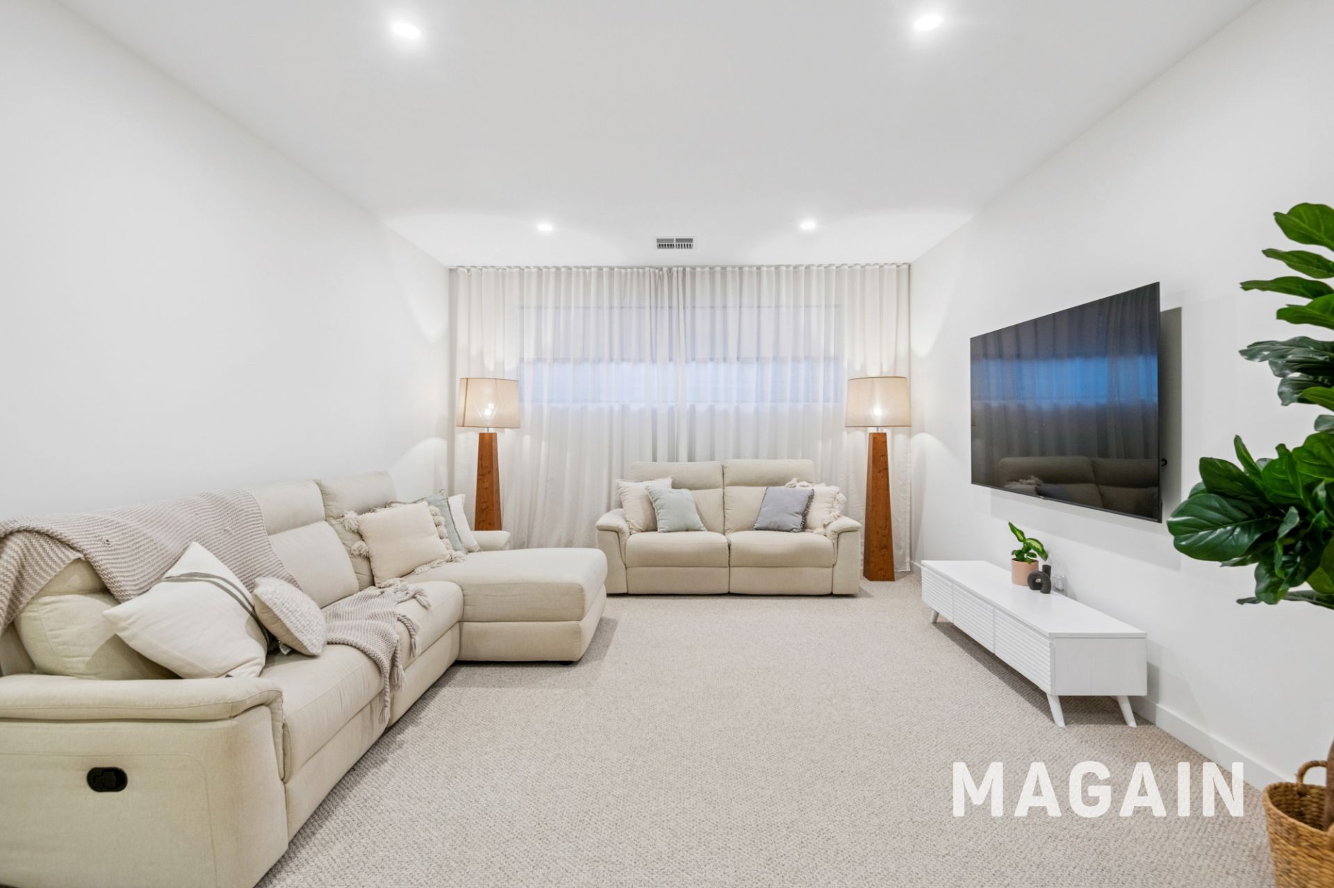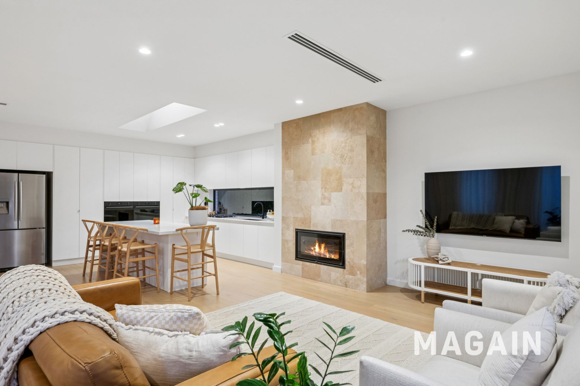 A second living room provides a peaceful place to relax, complemented by soft carpets and a stylish feature strip window. Bedrooms two and three both include built-in robes and ceiling fans, while the sleek three-way bathroom continues the home's refined style with a separate bath and floor-to-ceiling tiles.
