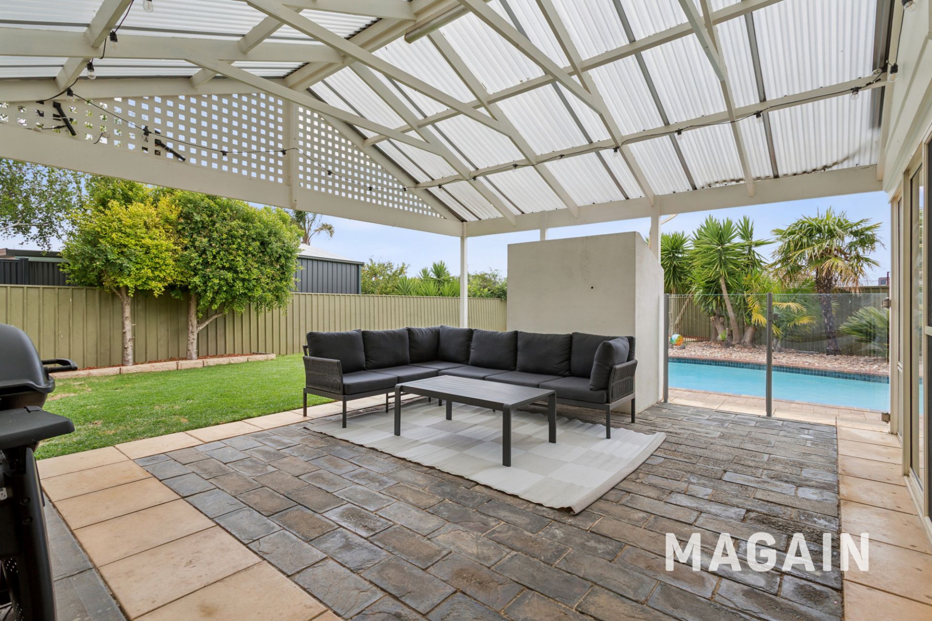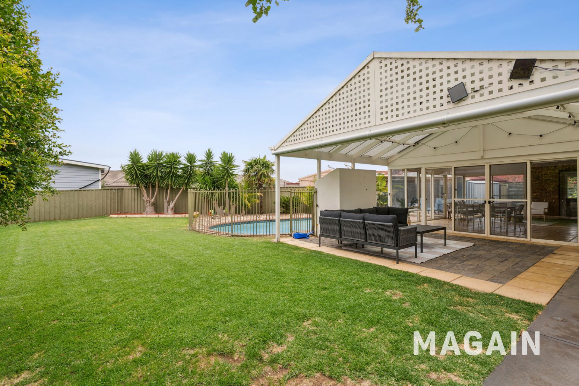Outdoors, the home continues to shine with an in-ground swimming pool, two separate lawn areas for kids and pets, a rainwater tank, tool shed, and a double-length carport with a roller door, adjacent to a paved area. Solar panels add further appeal, helping to keep energy costs down.