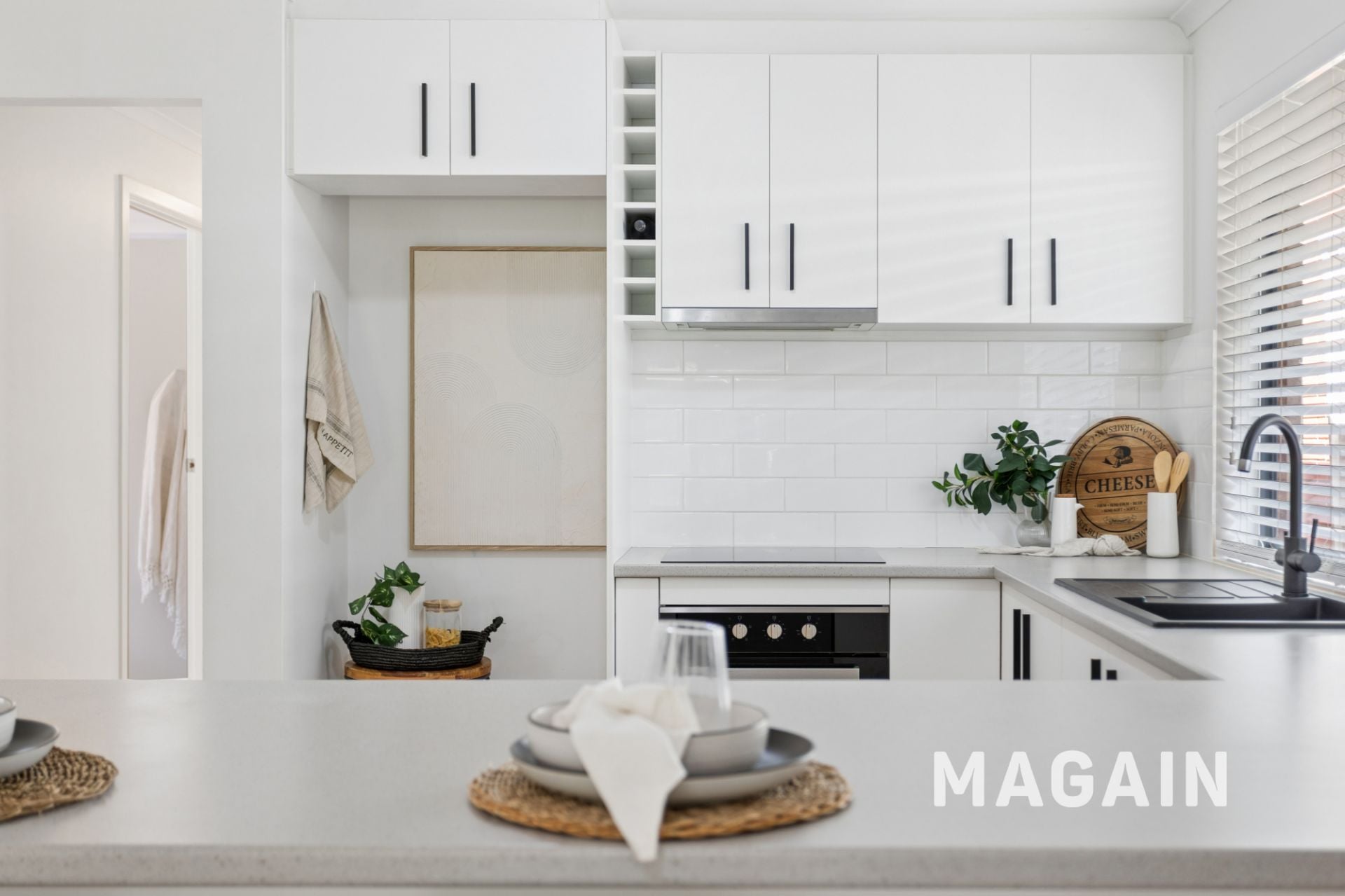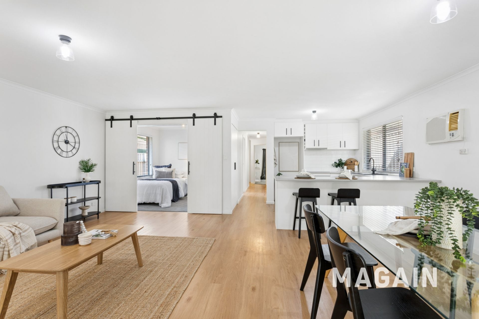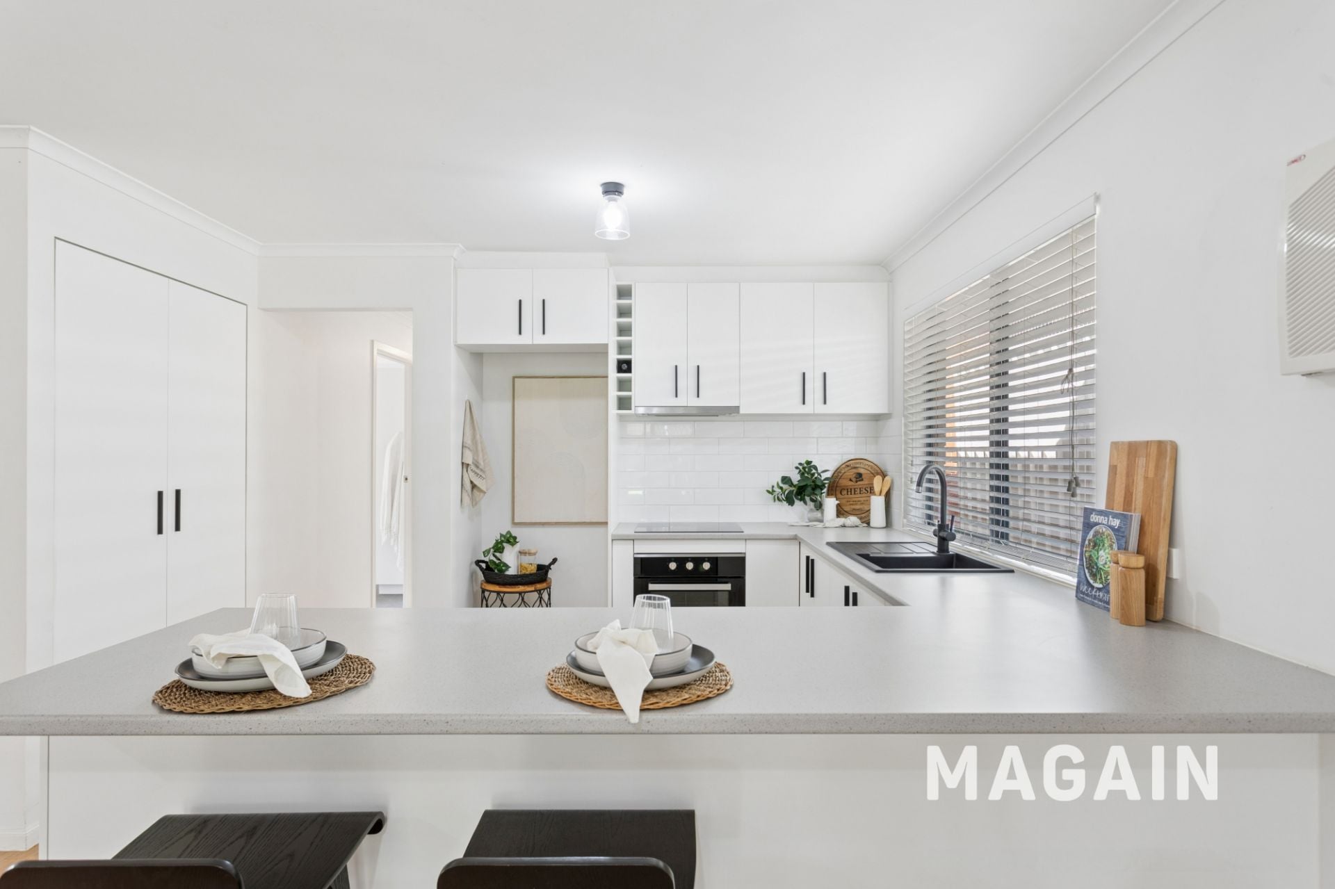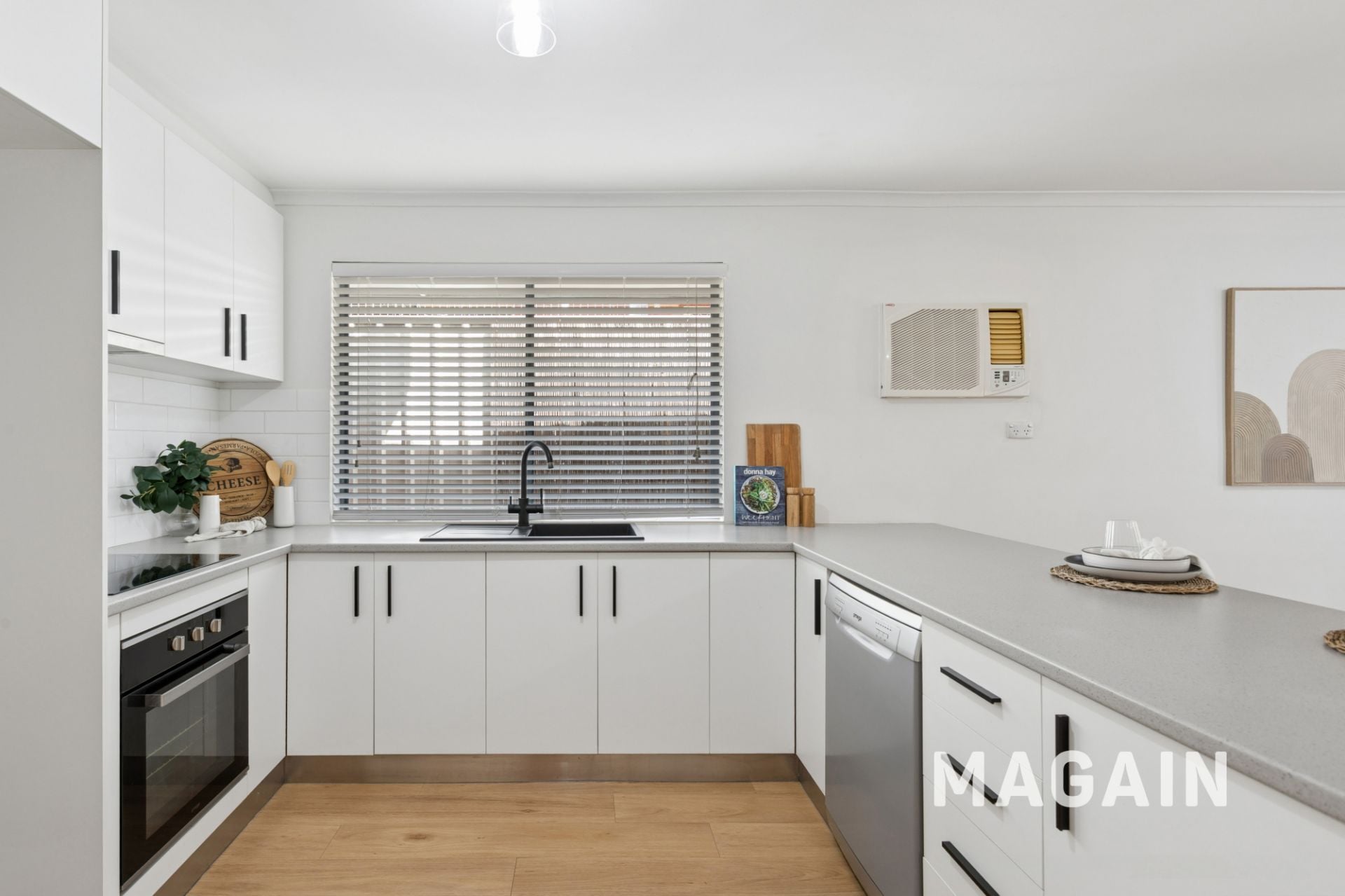Overlooking this space is the stunning, fully updated kitchen, truly the heart of the home. Featuring crisp white cabinetry, sleek black fixtures, and brand new stainless steel appliances including a dishwasher, it perfectly blends modern style with everyday functionality. A well-positioned breakfast bar adds versatility, whether it's casual dining, entertaining guests, or simply enjoying your morning coffee. Reverse cycle air conditioning ensures year-round comfort throughout this living zone.