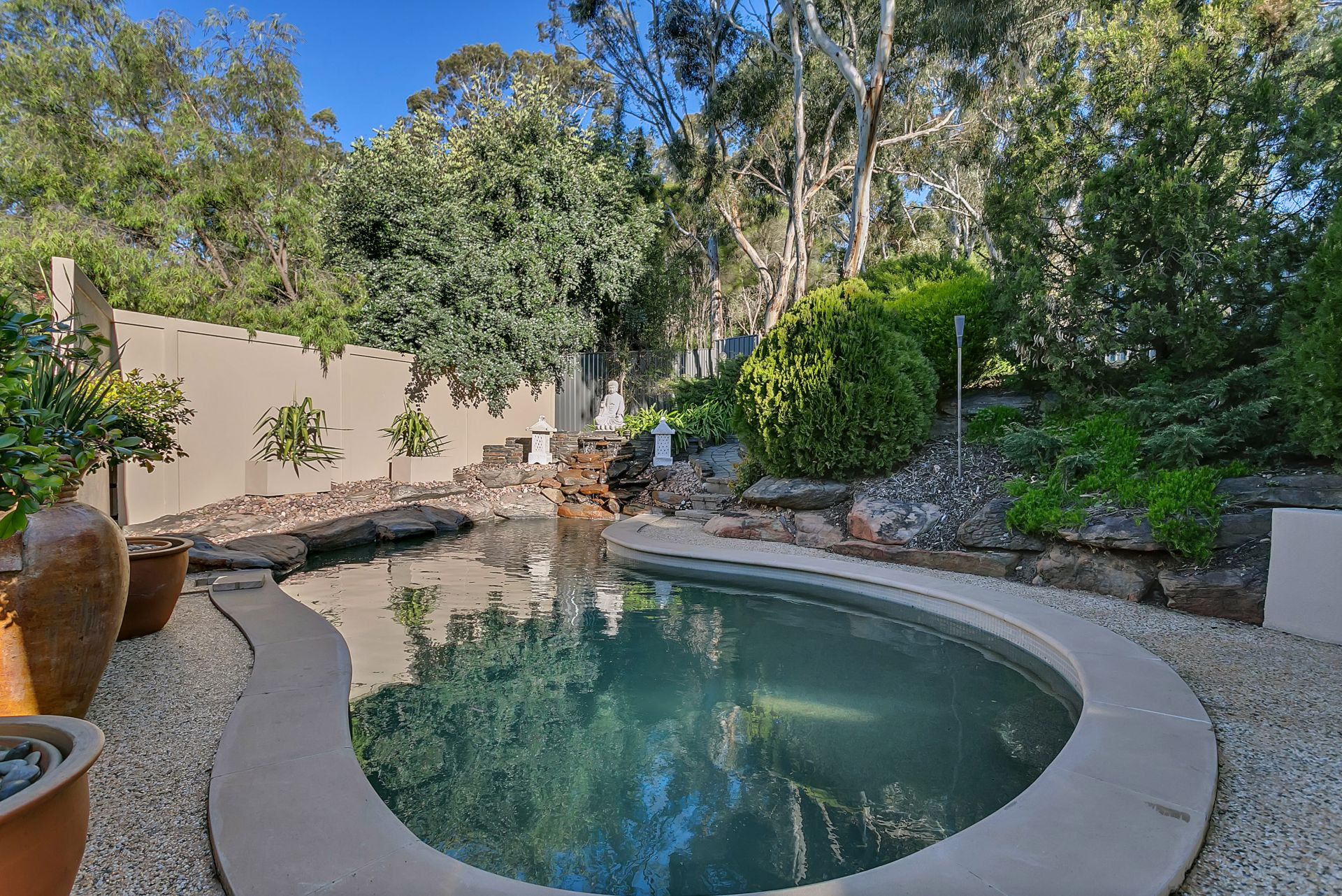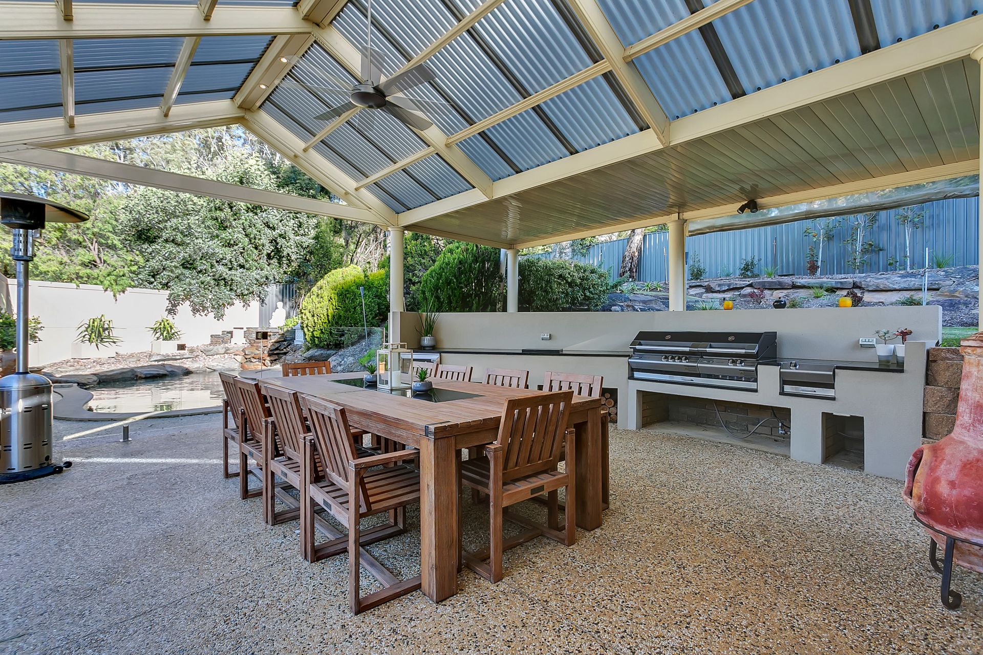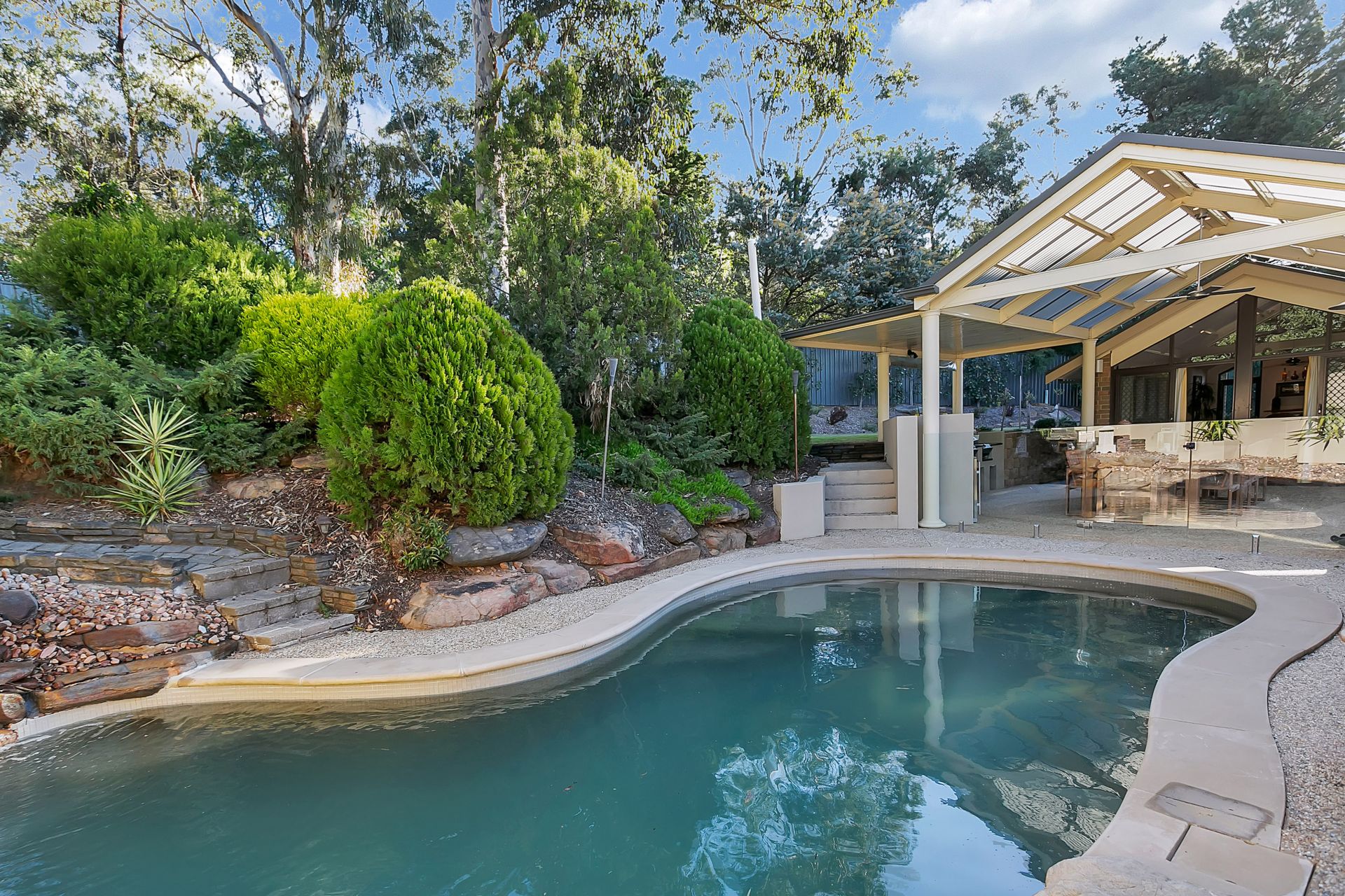 From the entertaining room, you step out to a fabulous undercover outdoor kitchen with granite tops and BBQ - natural gas is connected. This area looks over the heated saltwater inground pool with glass fencing. The gardens have been designed for easycare and blend beautifully with the natural surroundings.