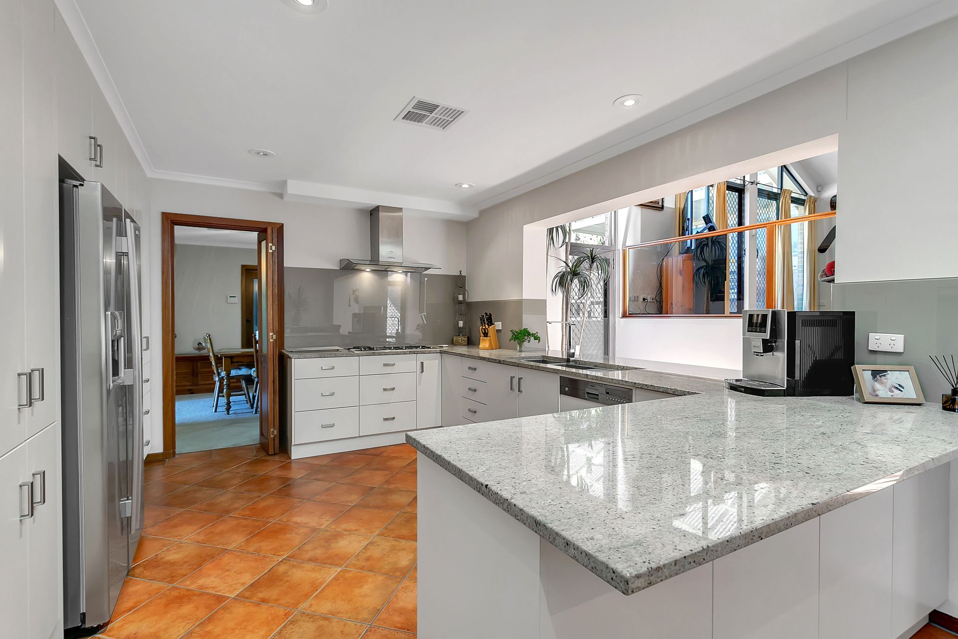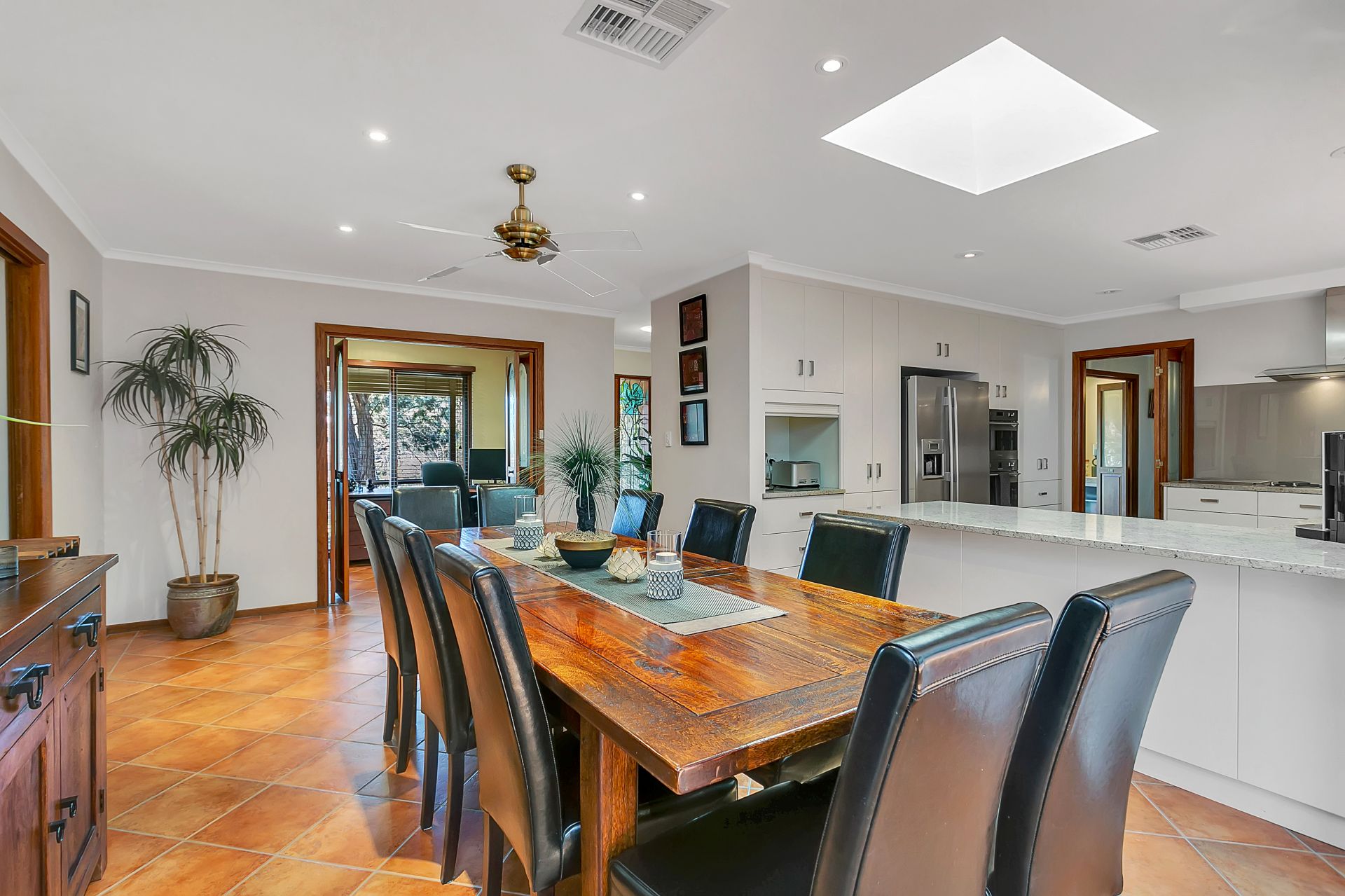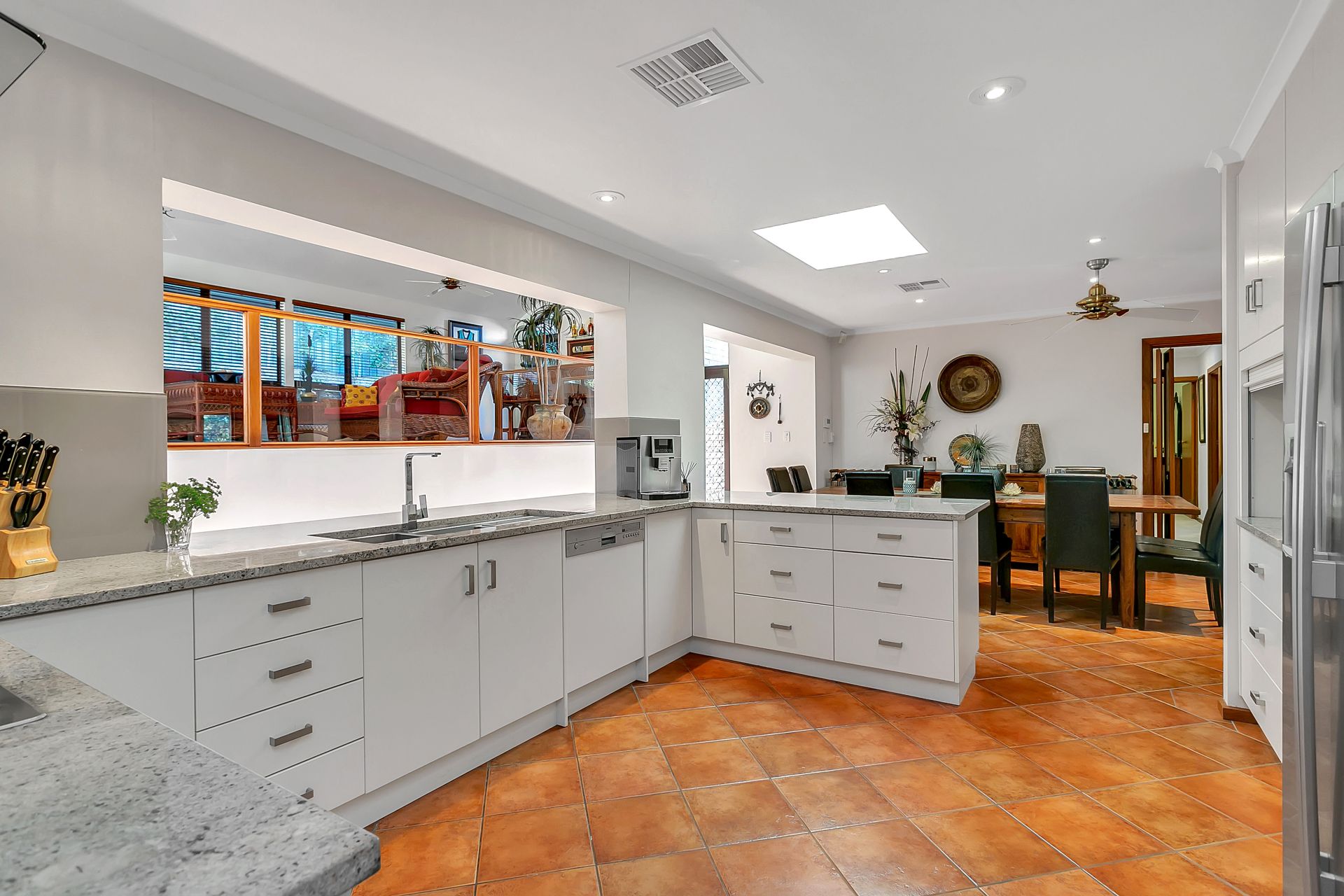 A fully renovated family kitchen with granite benchtops and stainless steel appliances is at the hub of the home and adjoins the large casual meals/ family area. From here you can step up to a fabulous entertaining area with vaulted ceilings, built in wet bar and beautifully tiled as are the adjoining rooms.