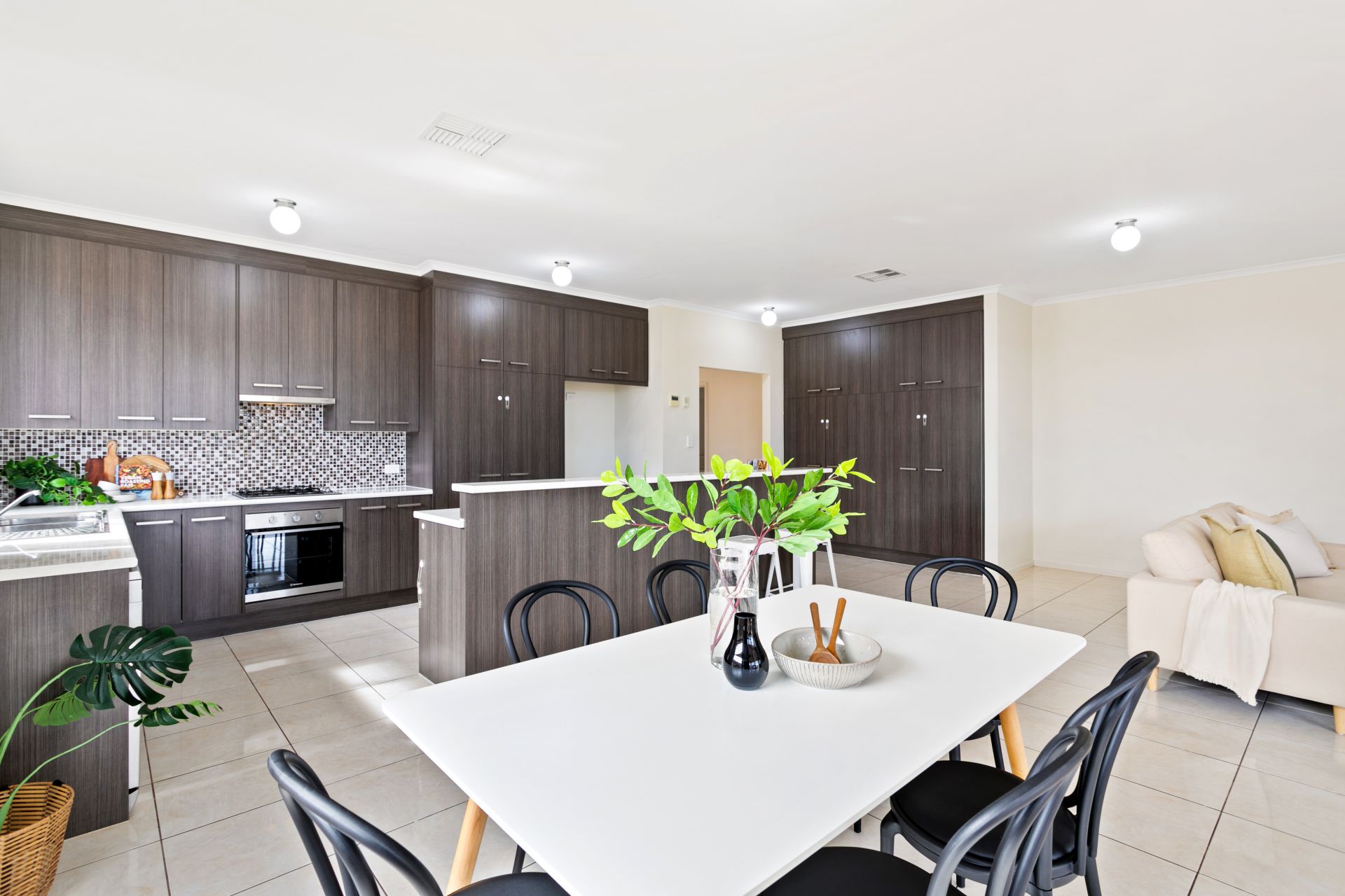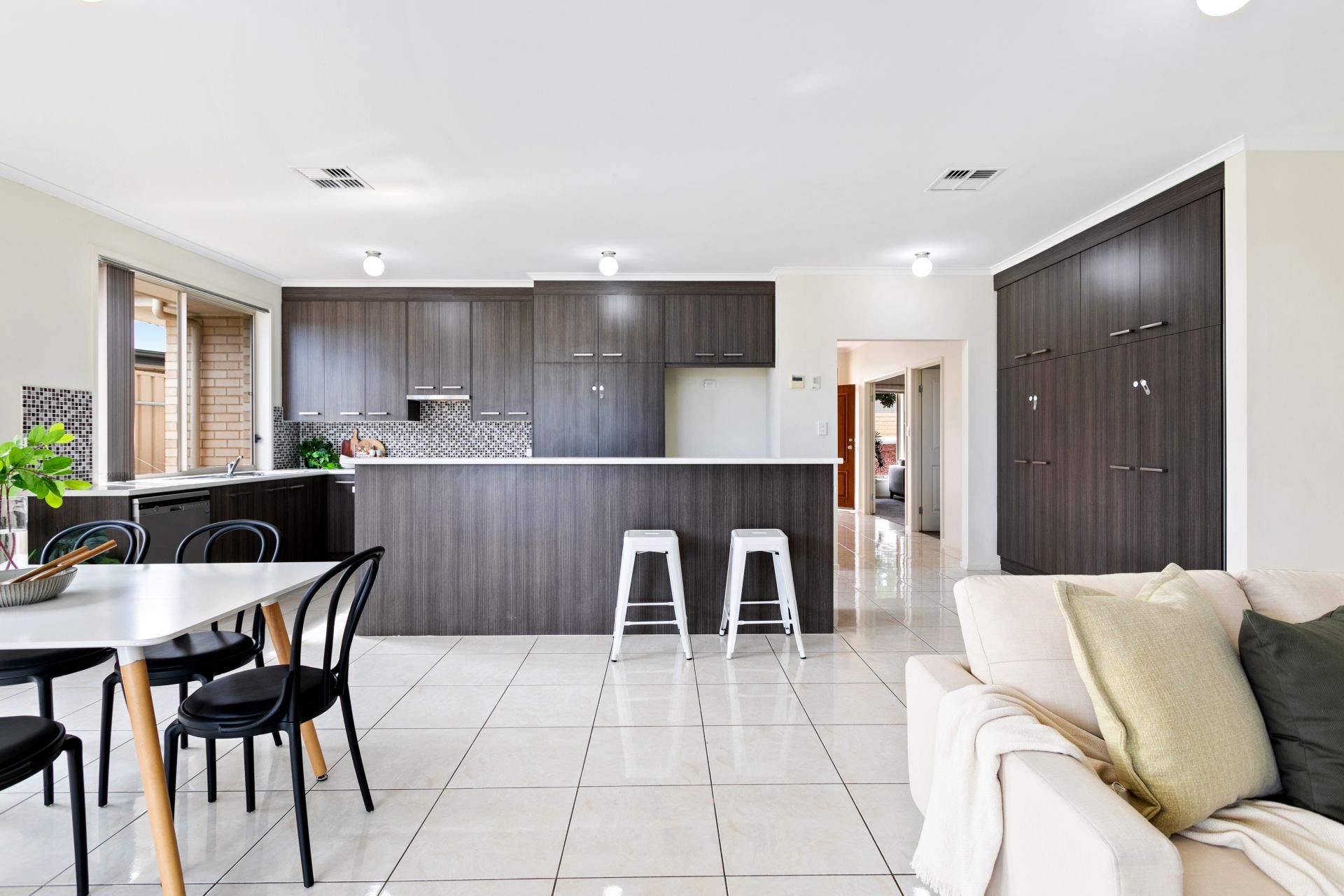 The centre hub of the home is the tiled, open plan living area, here is where you will find the expansive modern kitchen boasting stainless steel appliances consisting of a gas cooktop, a brand-new electric oven and dishwasher, plus there’s ample bench space including an island bench with breakfast bar and plenty of cupboard storage. The clever design ensures that the chef won't feel left out while the rest of the family unwinds in the living area. Adjacent the kitchen is the dining area - perfect for quick breakfast or a meal on the go, while a glass sliding doors offer a seamless transition to the Alfresco area. Additional features include ducted & zoned reverse cycle air conditioning throughout, brand new lush carpet in all bedrooms & formal lounge, 18 solar panels (4.5kW system) and NBN has been connected.