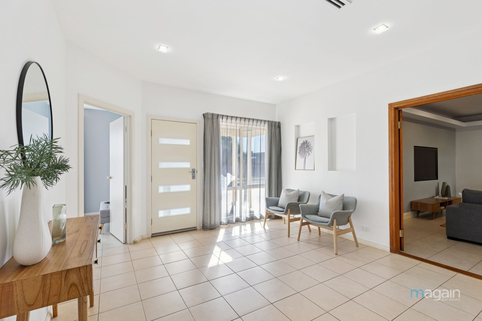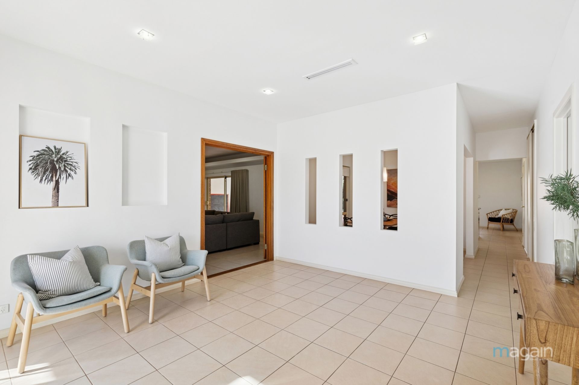 The home has been designed for year-round comfort, with multiple split system air conditioners placed throughout to ensure every space remains comfortable across all seasons. The layout is both practical and family-friendly, with a spacious entry hall anchoring the living zones and connecting seamlessly with the bedrooms.