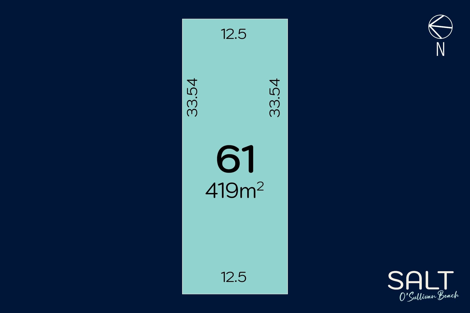 Don't miss this exclusive opportunity to secure Lot 61, a 419sqm block in the highly sought-after Salt O'Sullivan Beach community. With a 12.5m frontage and 33.54m depth, this lot provides the perfect space to design a stunning coastal home with modern living in mind.