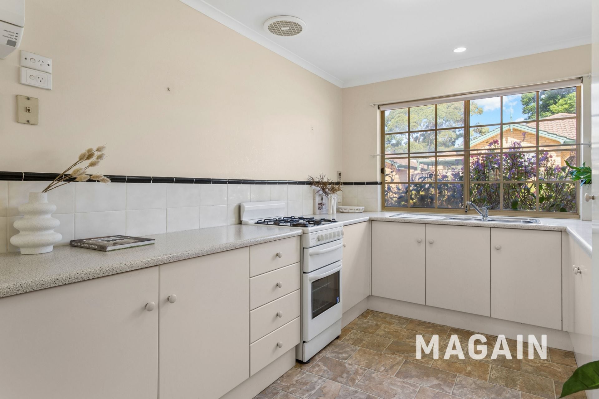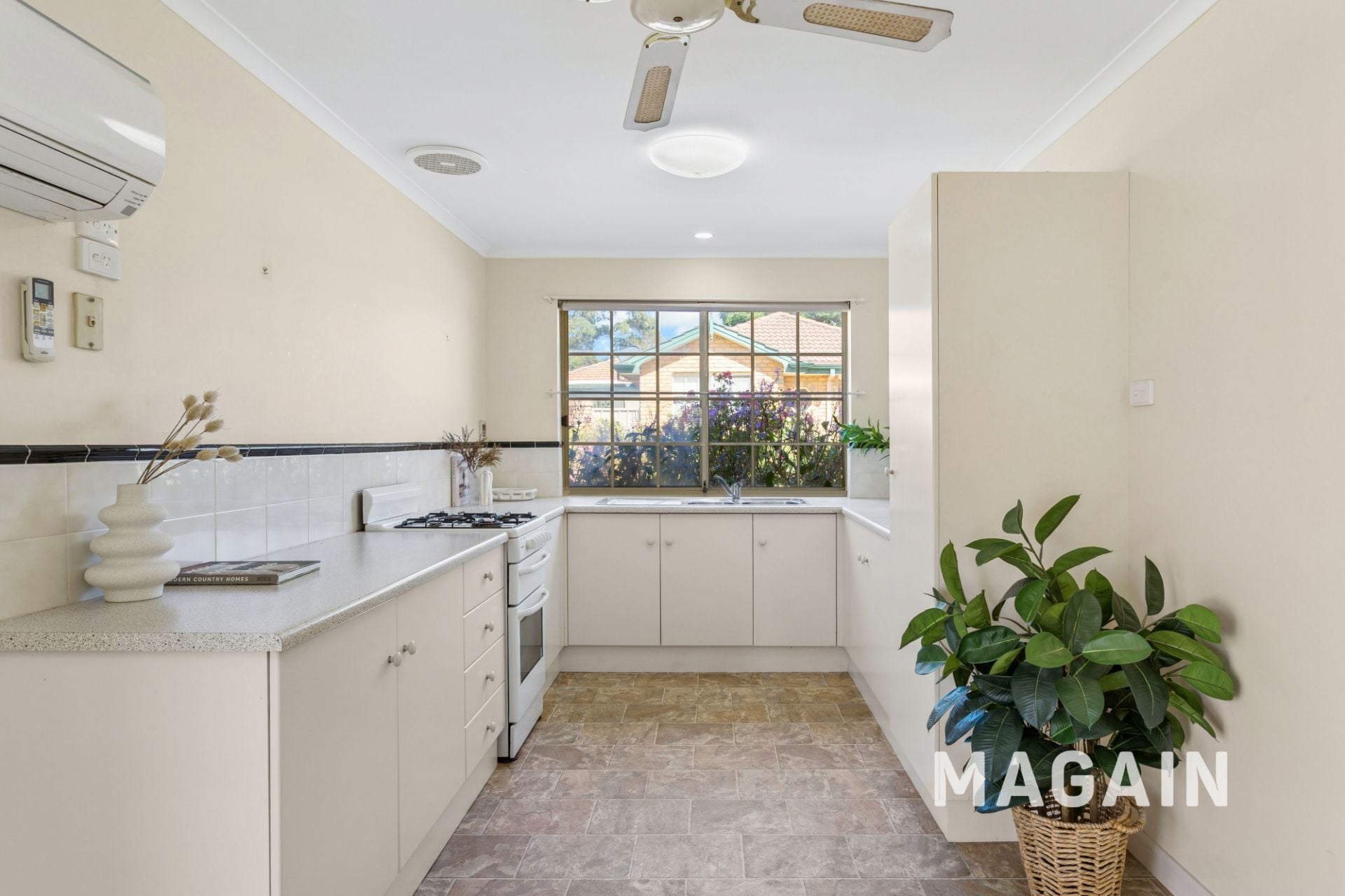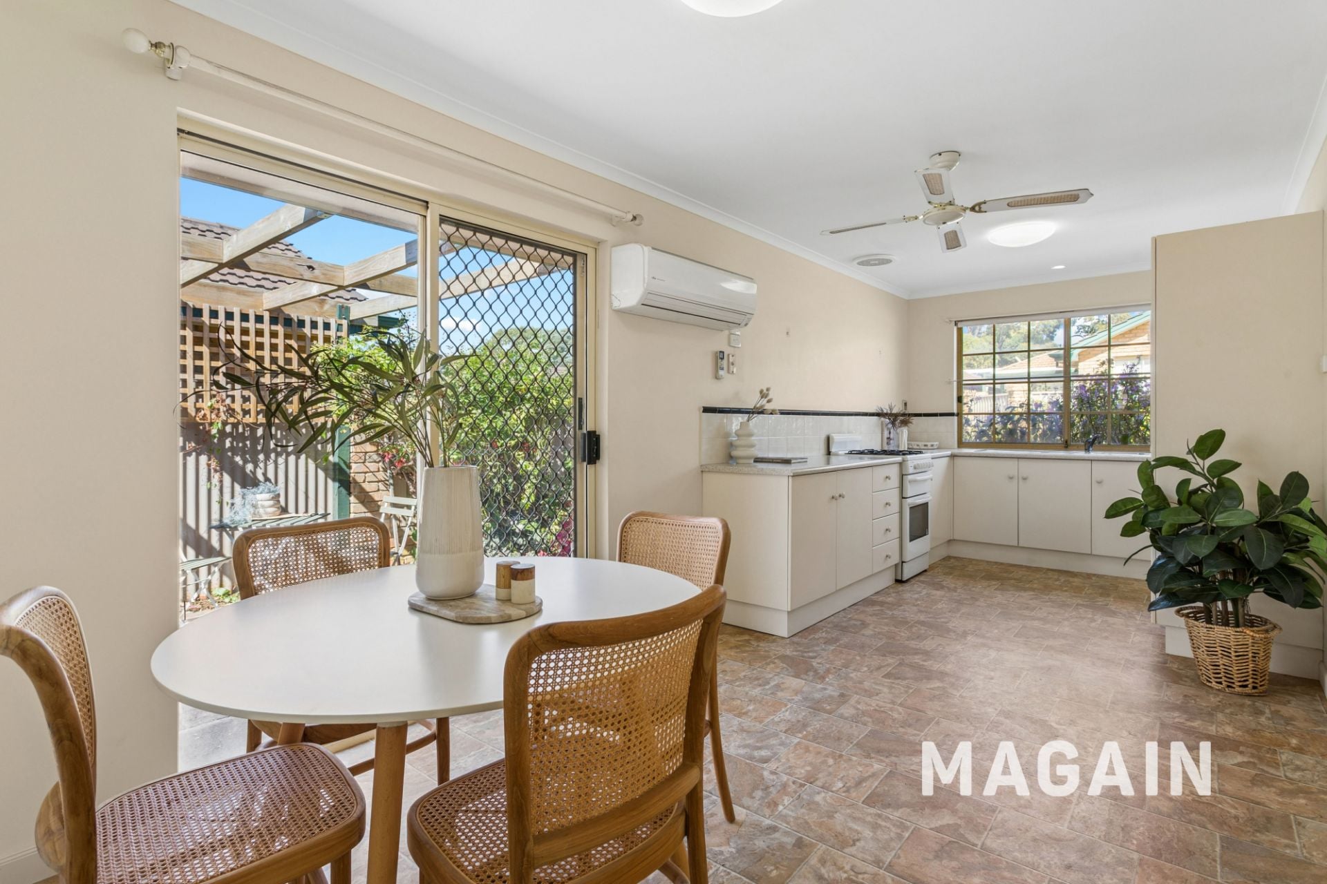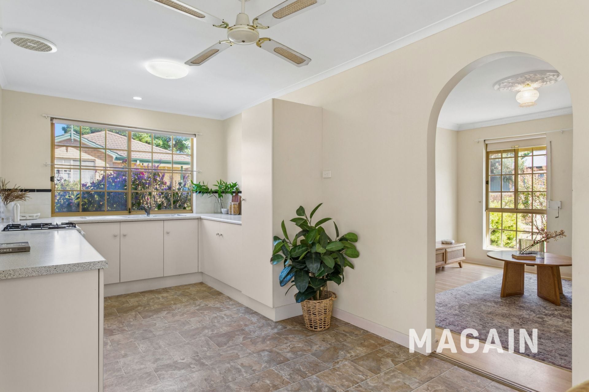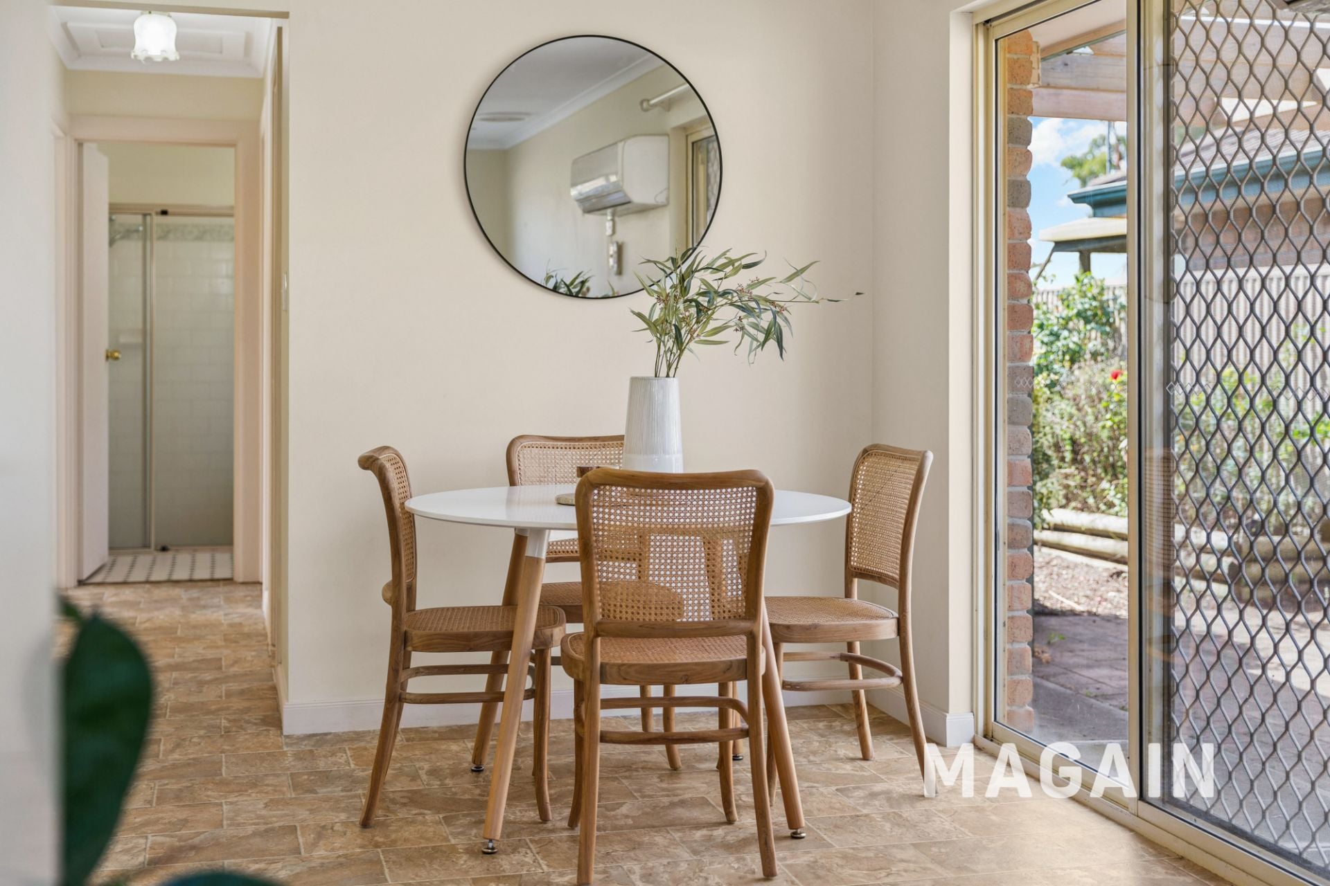 At the heart of the home is the kitchen and dining area, an ideal space for trying new recipes or gathering the family for a home-cooked meal. The kitchen features a neutral, practical design with ample cream cabinetry and light benchtops. Equipped with quality appliances, including a 4-burner gas cooktop, oven, and grill, it offers everything needed for easy meal preparation. Additional features include a dedicated fridge alcove, generous pantry, double sink, ceiling fan, and split system air conditioning for year-round comfort.