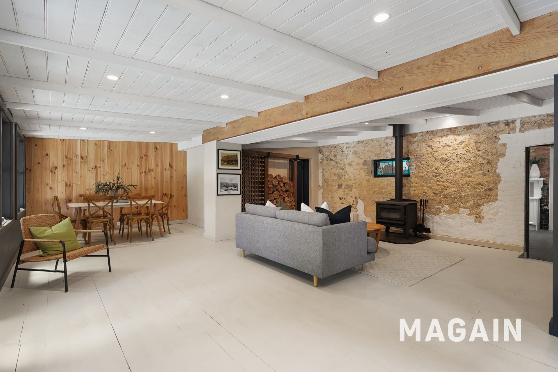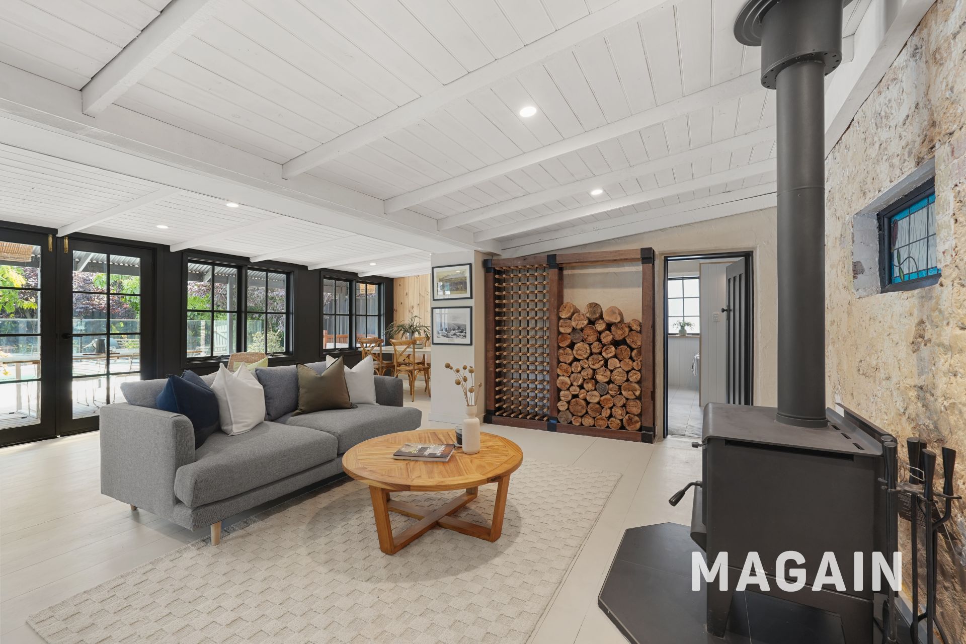 At the heart of the home, the family living area exudes warmth and character, highlighted by a combustion fireplace, exposed beam ceilings, and a stone feature wall. Whether relaxing with the family, enjoying a home-cooked meal, or hosting guests, this inviting space is designed to accommodate it all.
