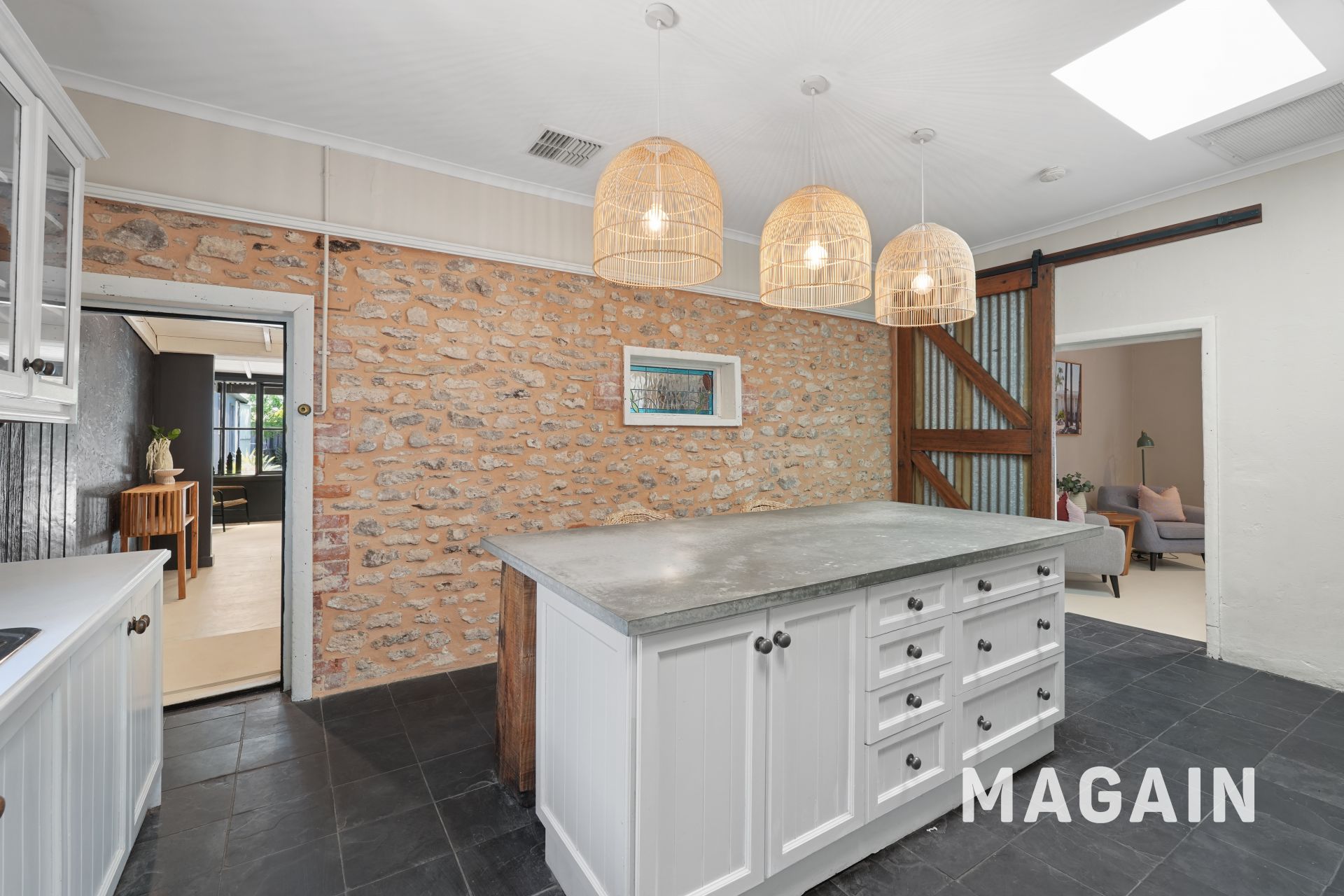 A welcoming entry leads into the light-filled kitchen, sure to impress with its abundance of white cabinetry, striking stone feature walls, and concrete island bench. High-quality appliances include a four-burner electric cooktop with rangehood, oven, and dishwasher, ensuring everyday cooking is effortless. Additional features include a spacious corner pantry, double sink, designated fridge and microwave spaces, and a versatile island bench ideal for casual dining or entertaining.