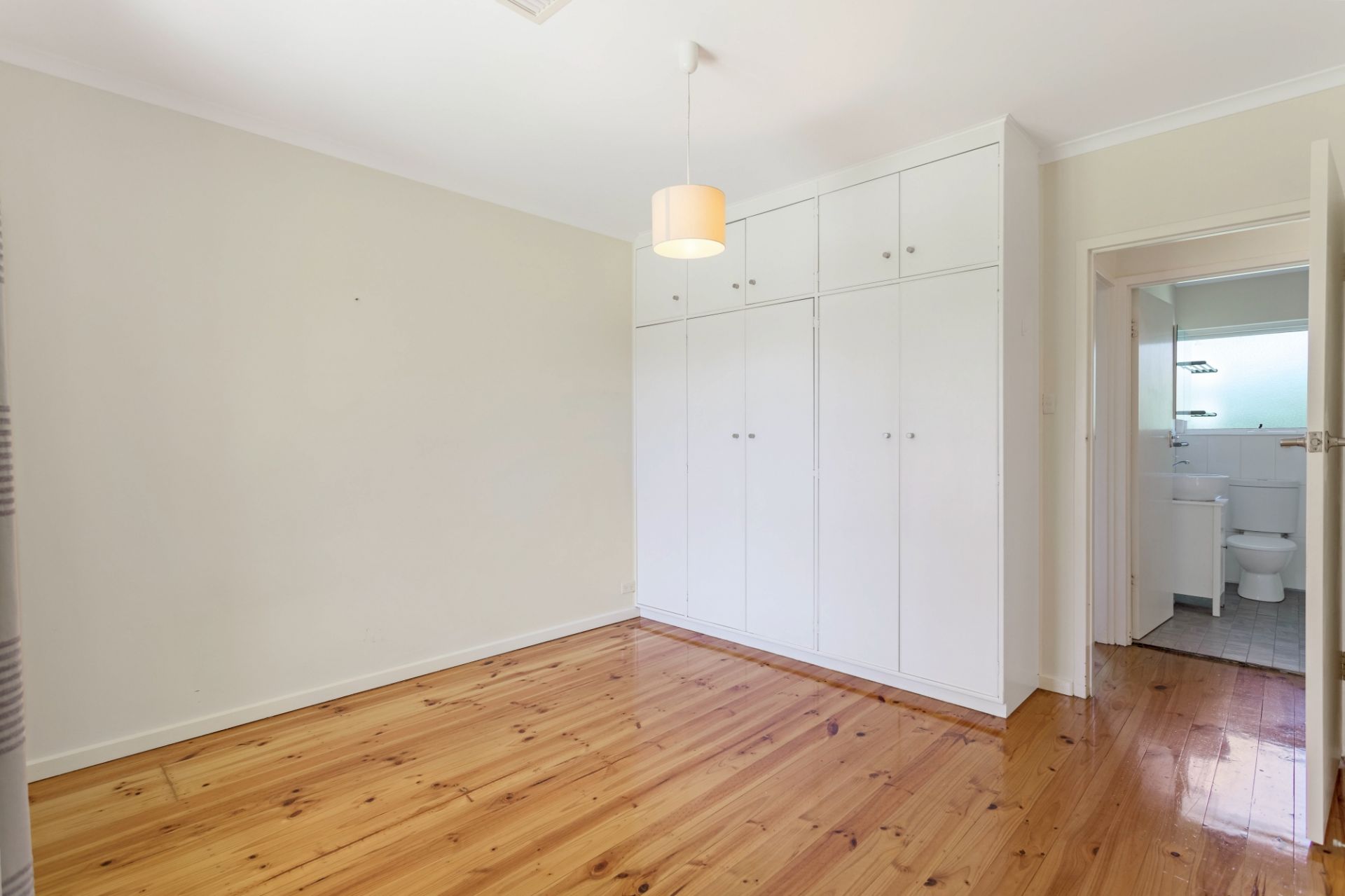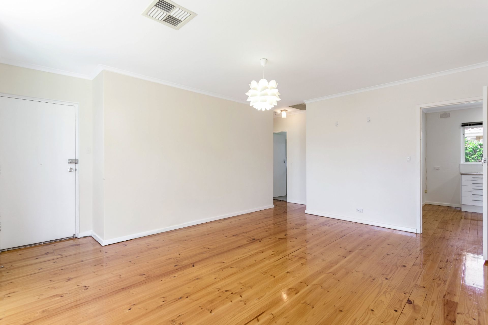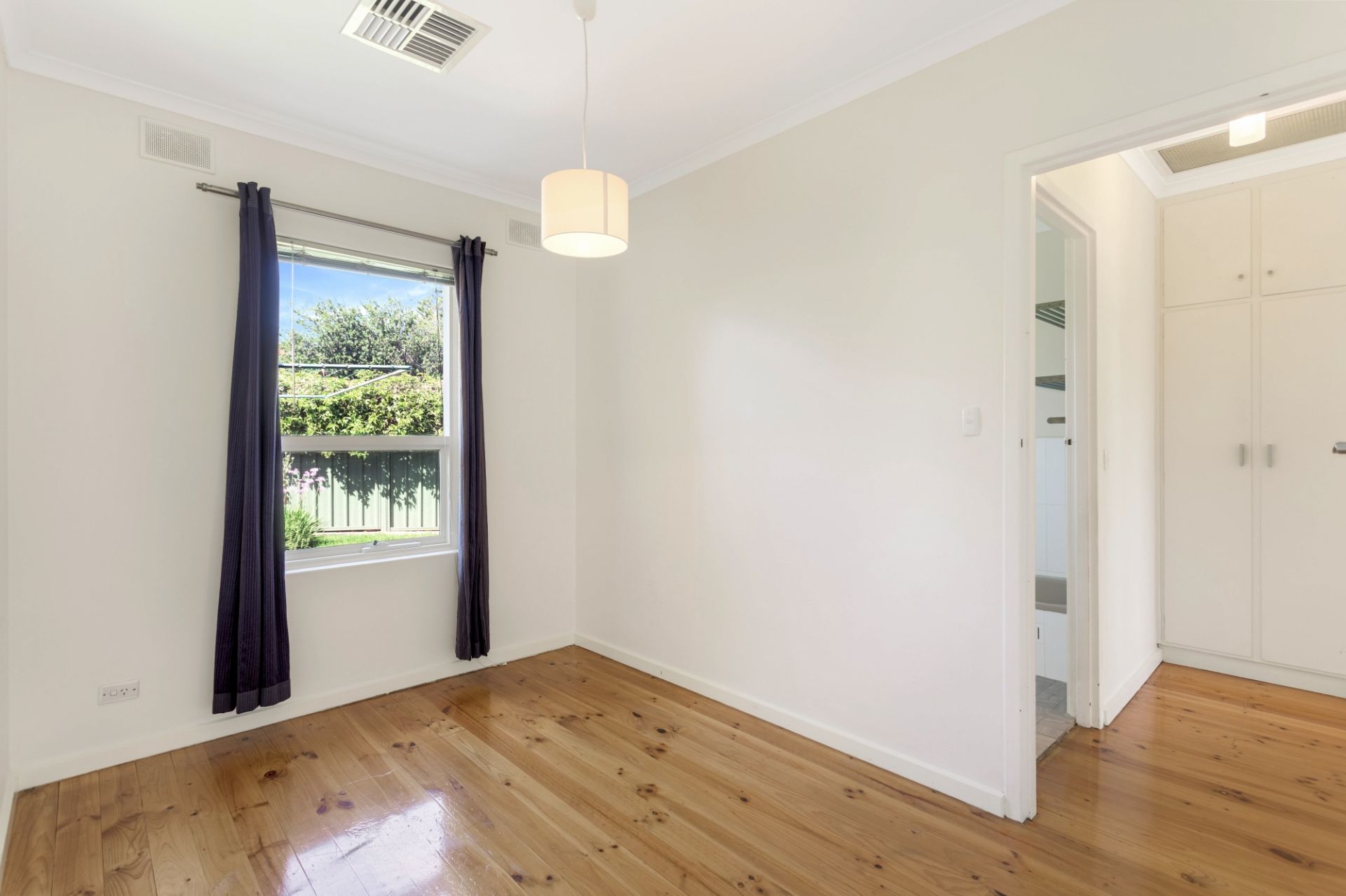 > polished floorboards, timber venetians, tasteful neutral decor