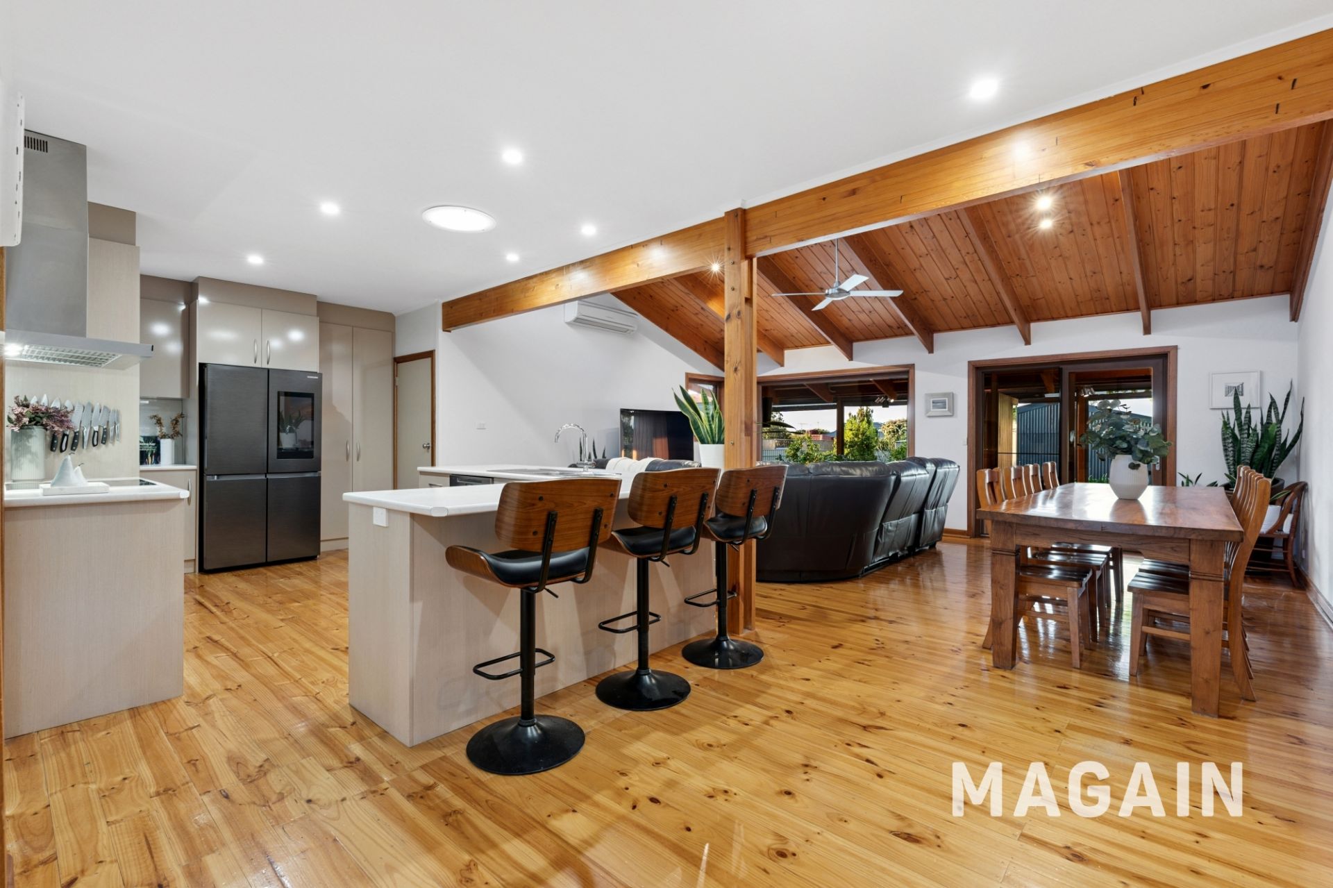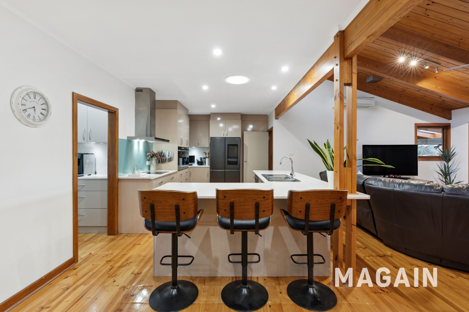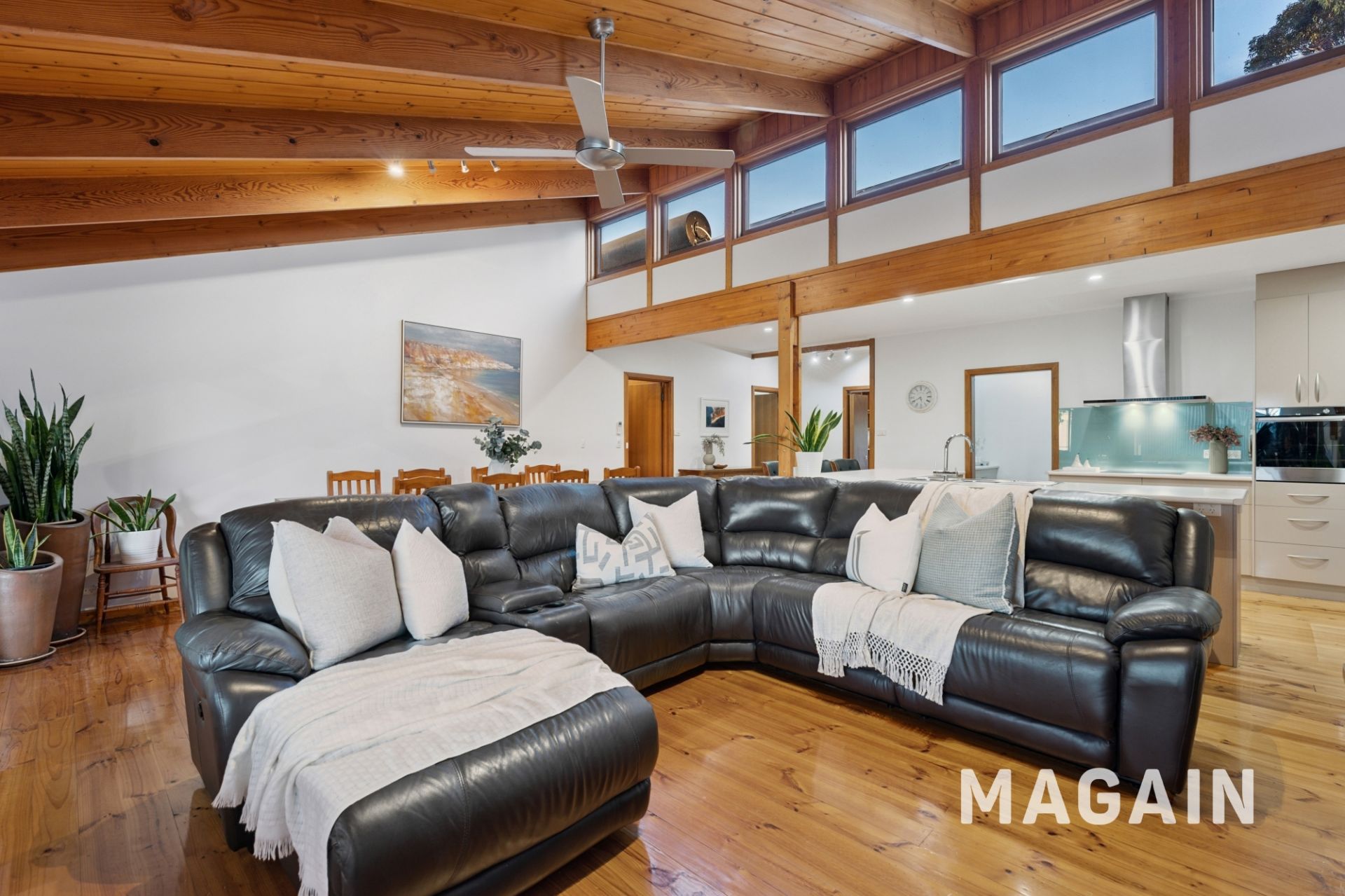 The heart of the home is the expansive open-plan kitchen, dining and lounge area, highlighted by a vaulted timber ceiling with high windows for abundant natural light. The custom kitchen has been updated with no expense spared-boasting an L-shaped island bench with breakfast bar seating, stainless steel double sink with filtered water tap, dishwasher, plumbed fridge, two pyrolytic wall ovens, an induction cooktop and a superb butler's style pantry with ample bench and storage space.