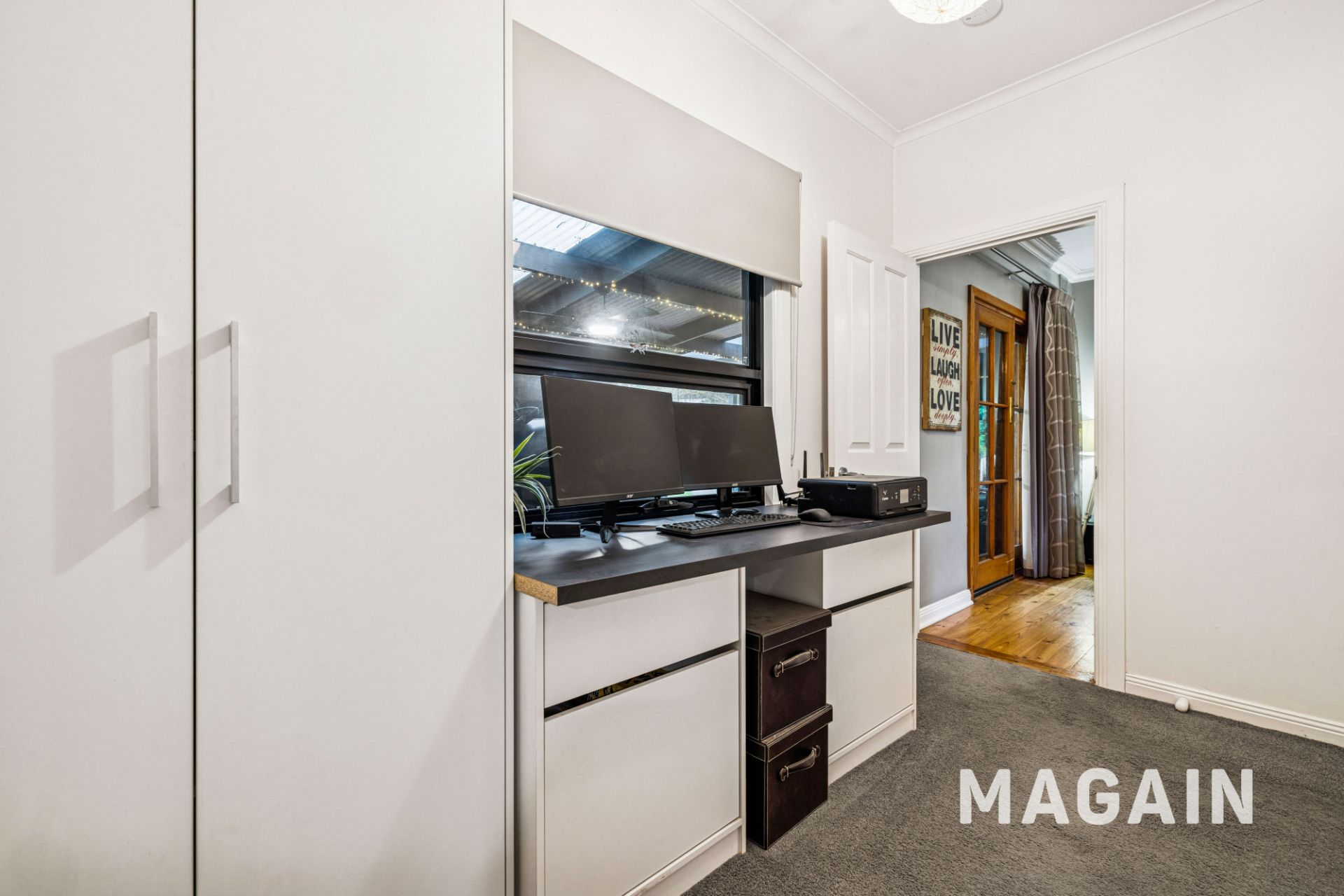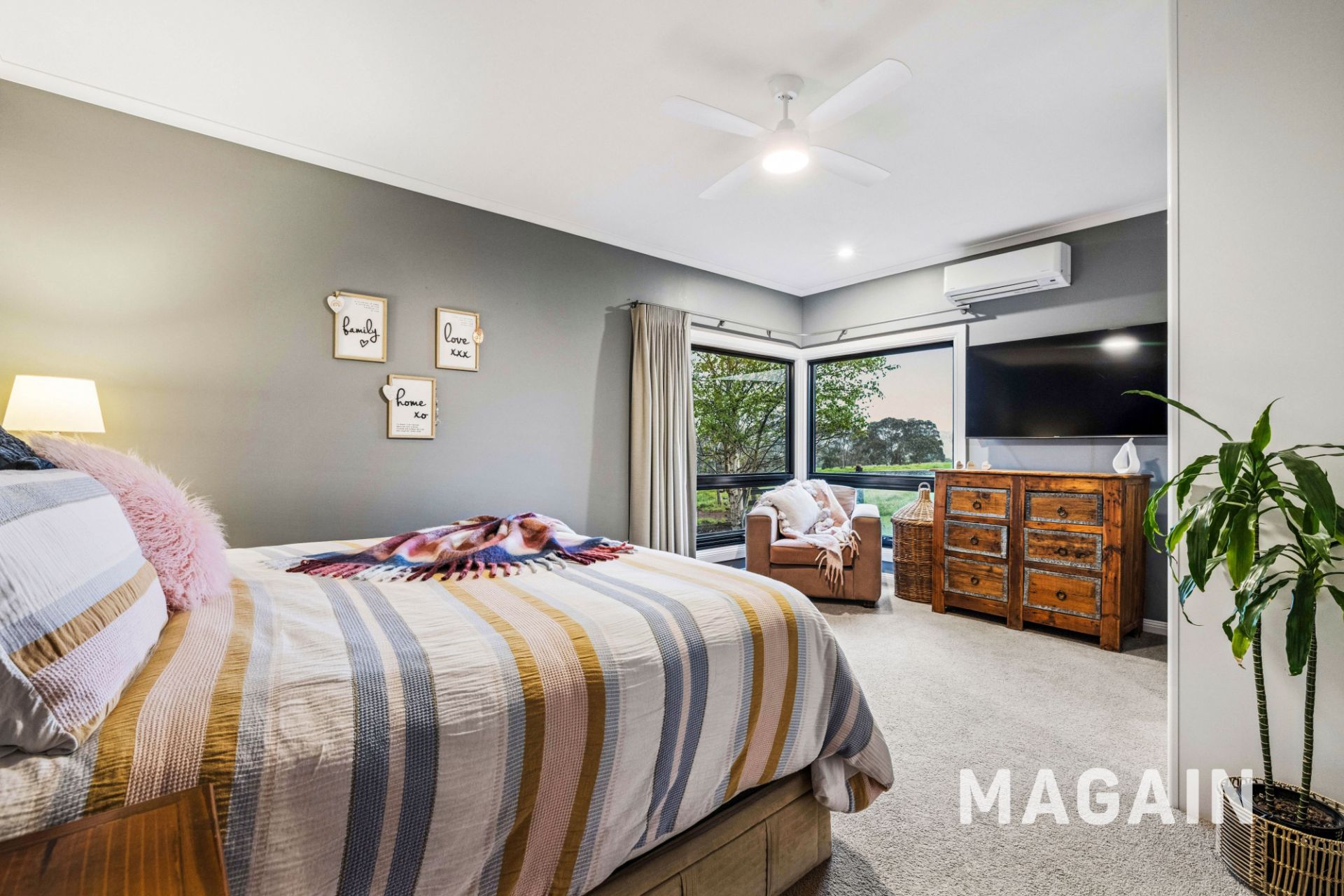 The home features three beautifully appointed bedrooms. The main suite enjoys picture windows overlooking the nearby paddocks and hills, a walk-in robe area within the built-in robe, a quality ensuite, split system air conditioning, and ceiling fan for year-round comfort. Bedrooms two and three include built-in robes, ceiling fans, and cosy carpets, while a handy study nook provides a quiet corner to work or read.