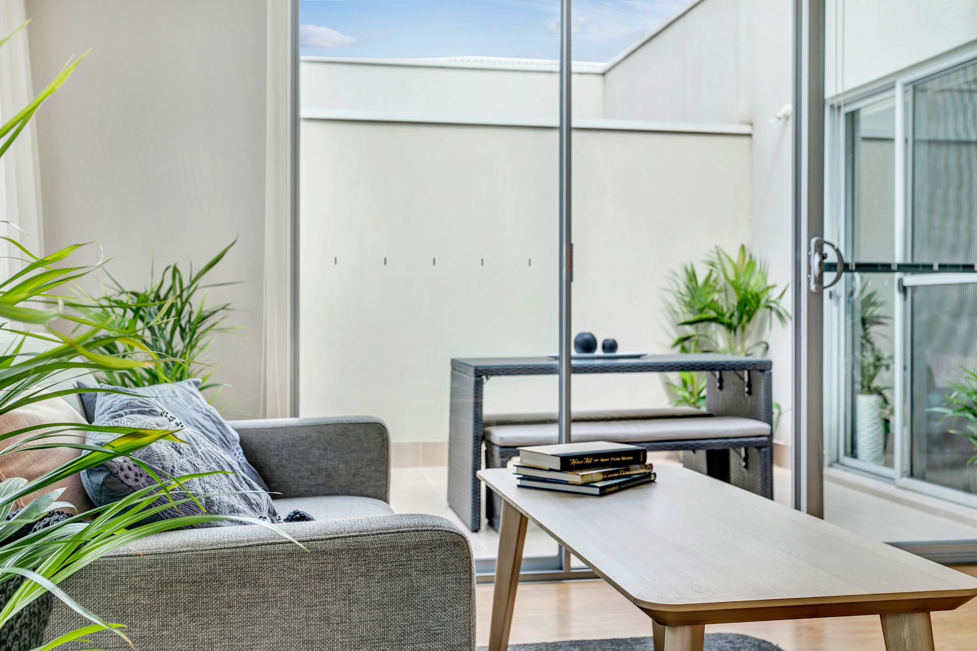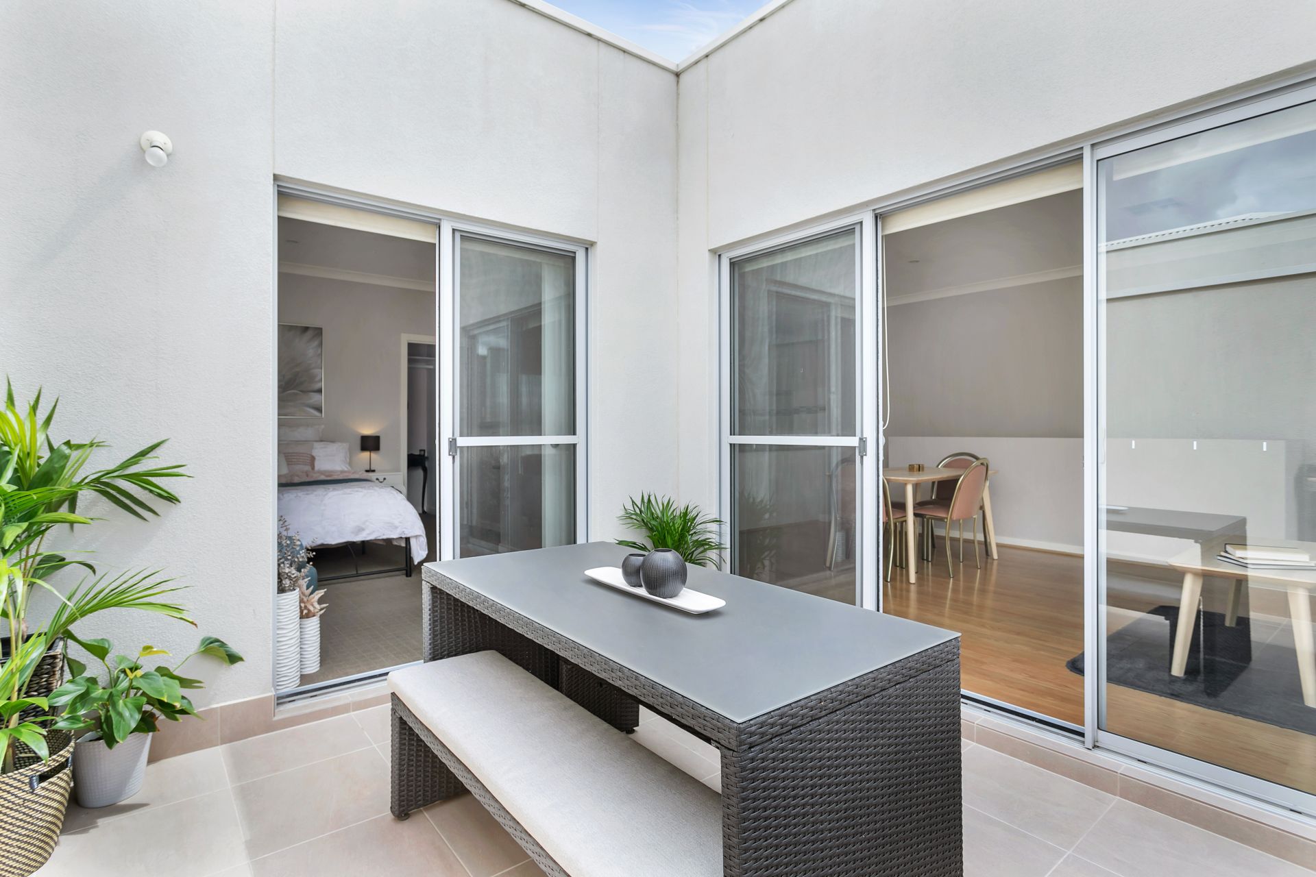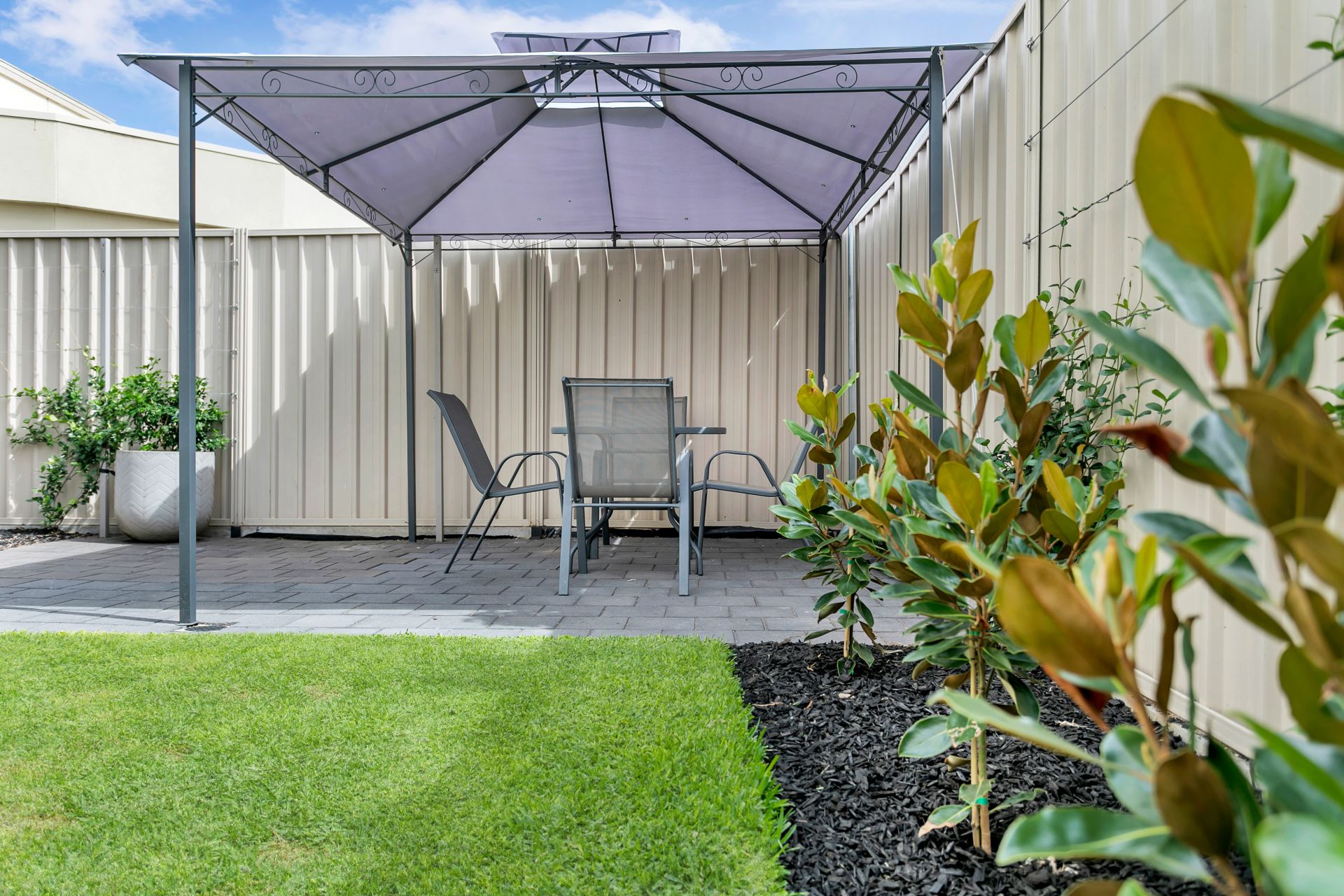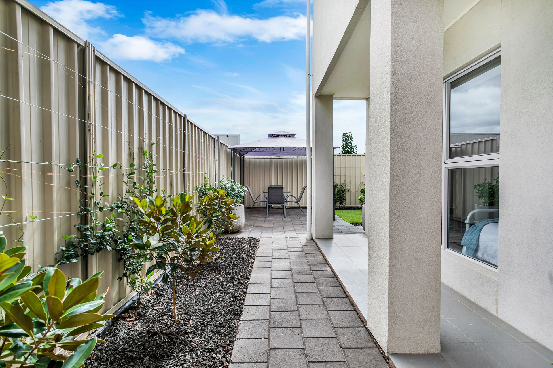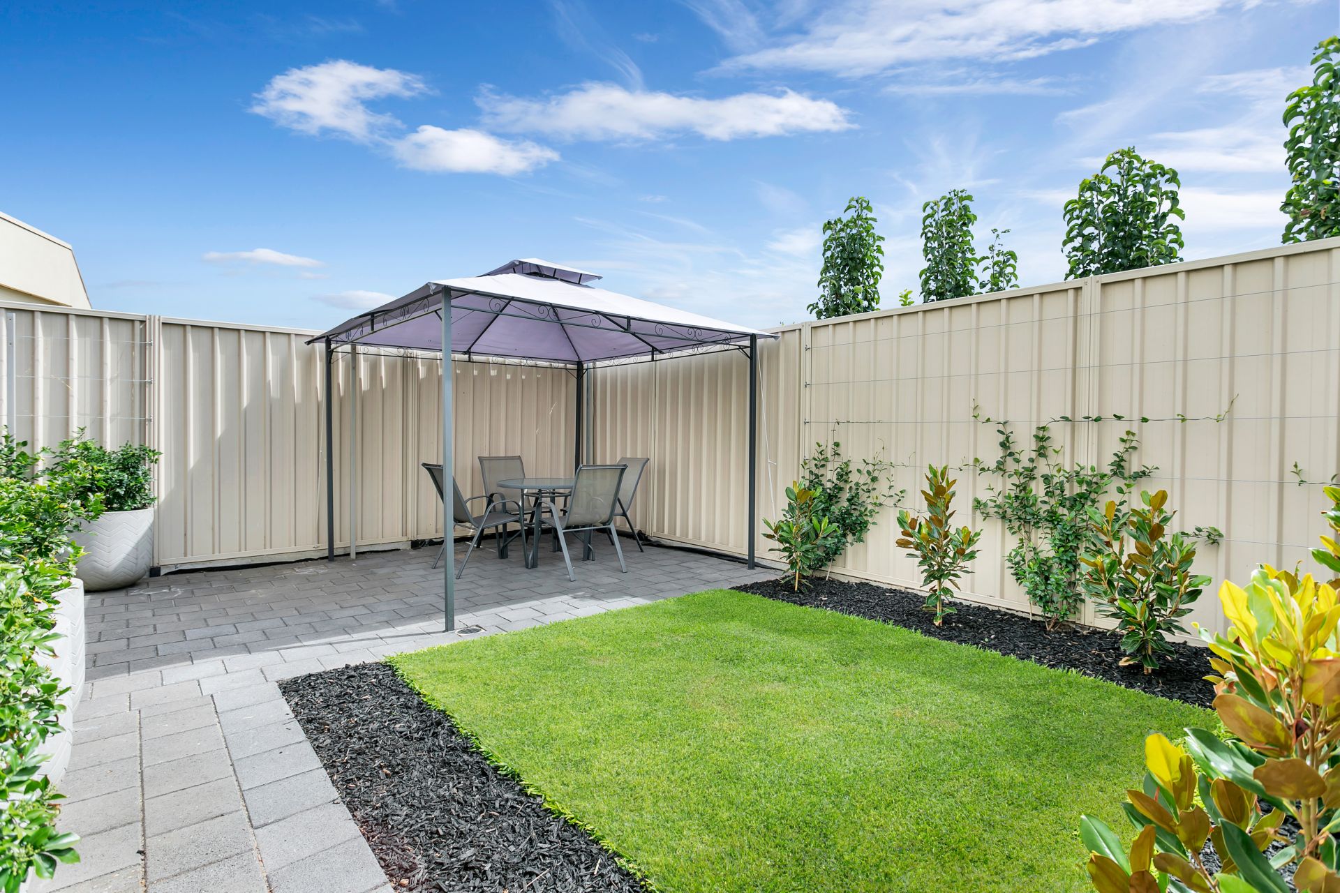 The thoughtfully landscaped outdoor living space is beautiful, functional, and low maintenance with fully automated irrigation system and easy-care garden.