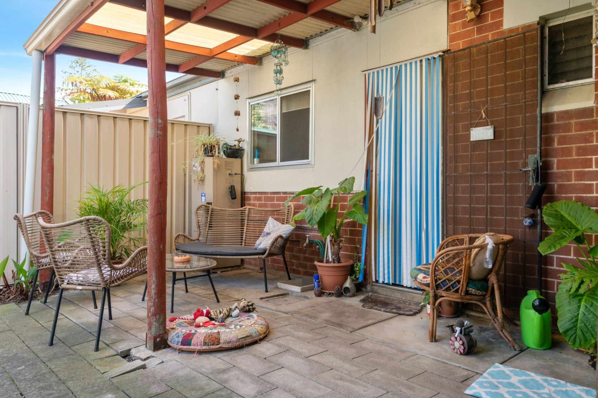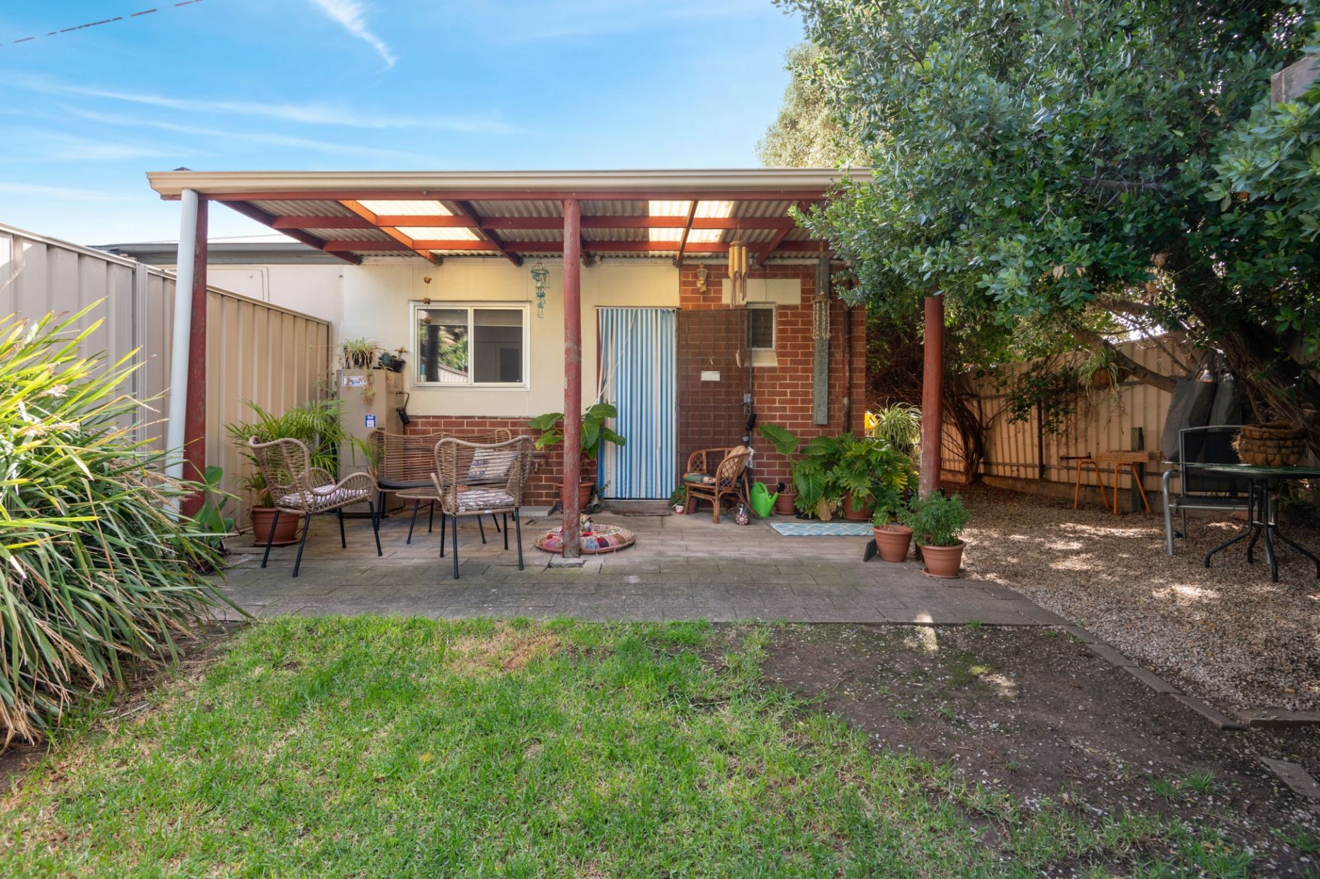 > outdoor undercover entertaining area overlooking small grassed area