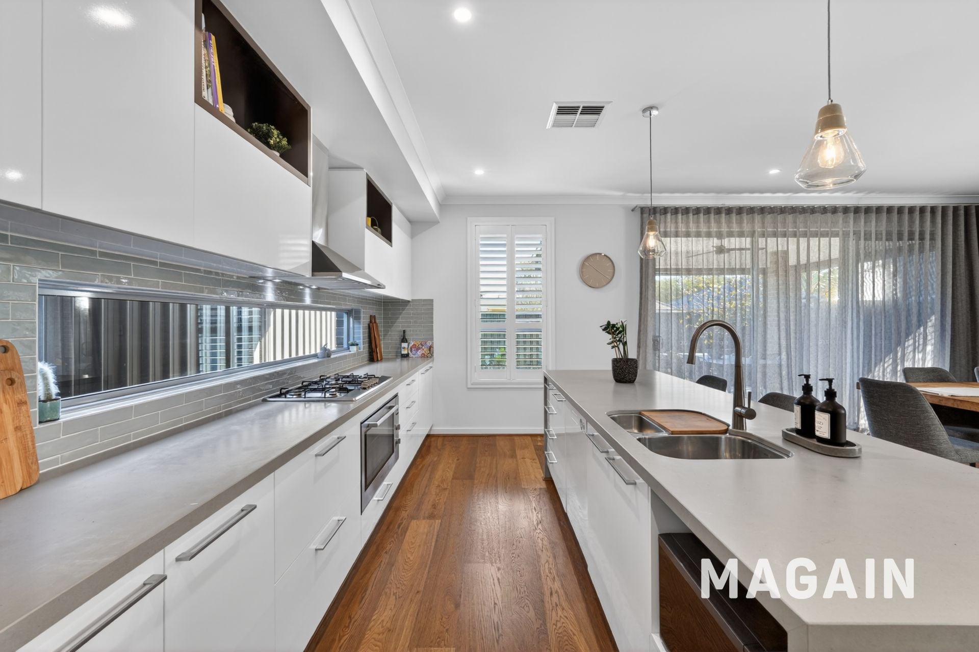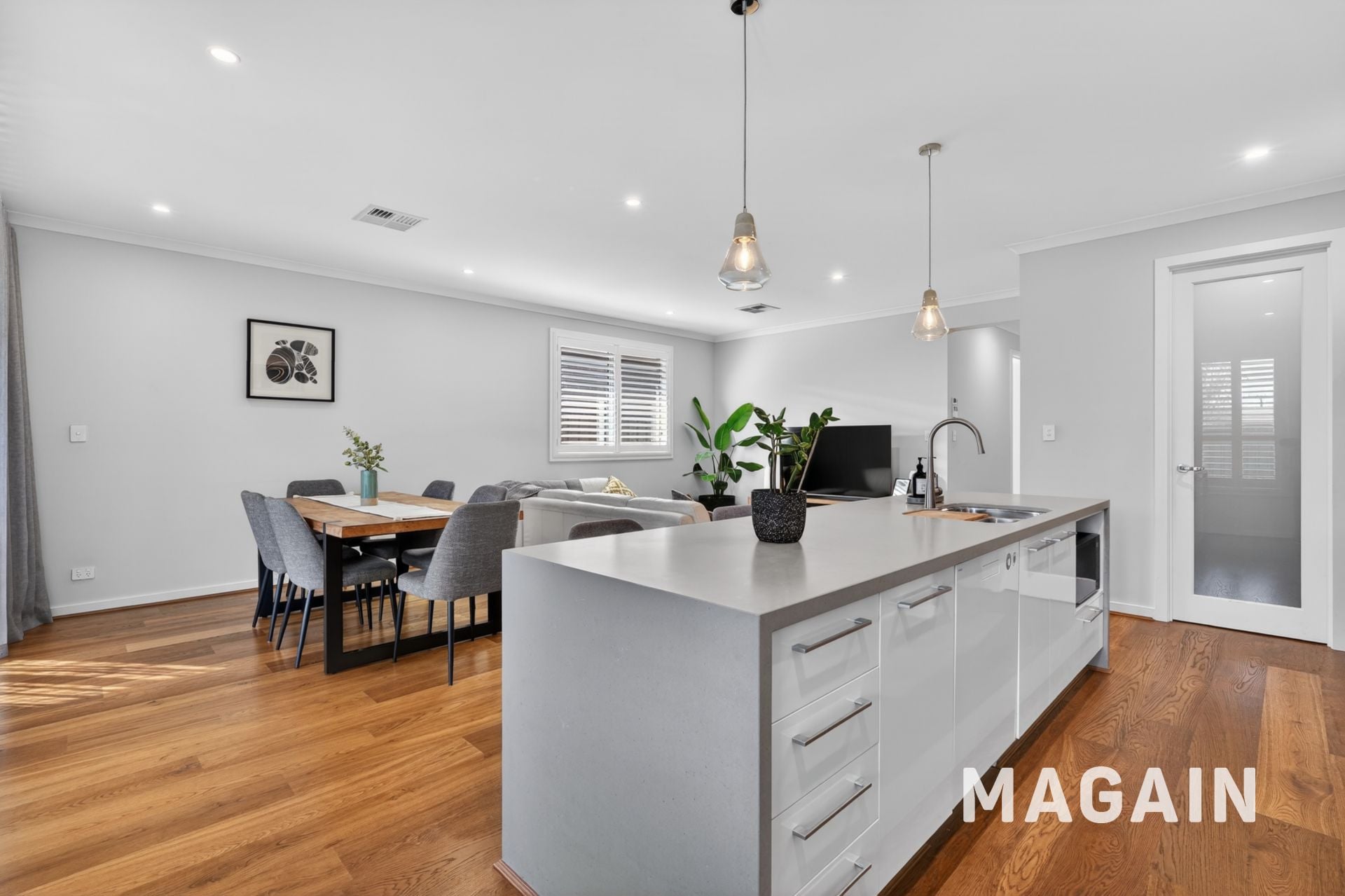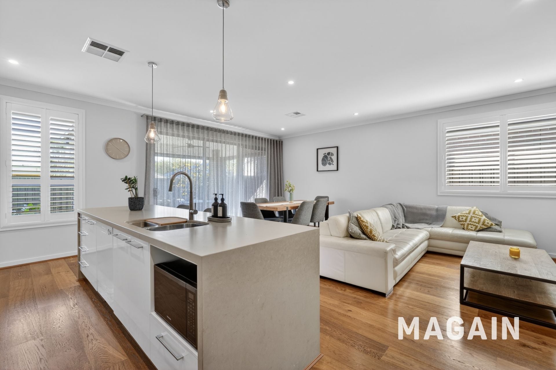 At the centre, the open-plan living and dining area is where everything comes together. The kitchen is both functional and impressive, featuring a stone waterfall island, walk-in pantry, pendant lighting and a glass splashback that enhances light and space-ideal for busy mornings, family dinners or entertaining with ease.