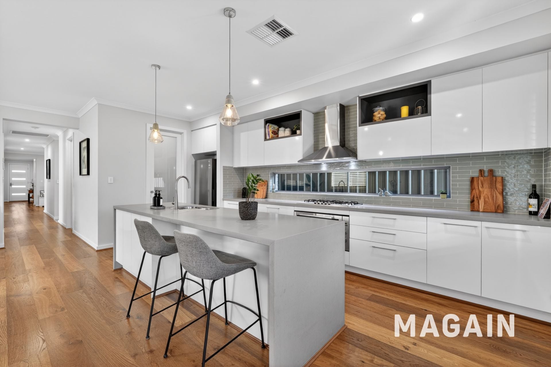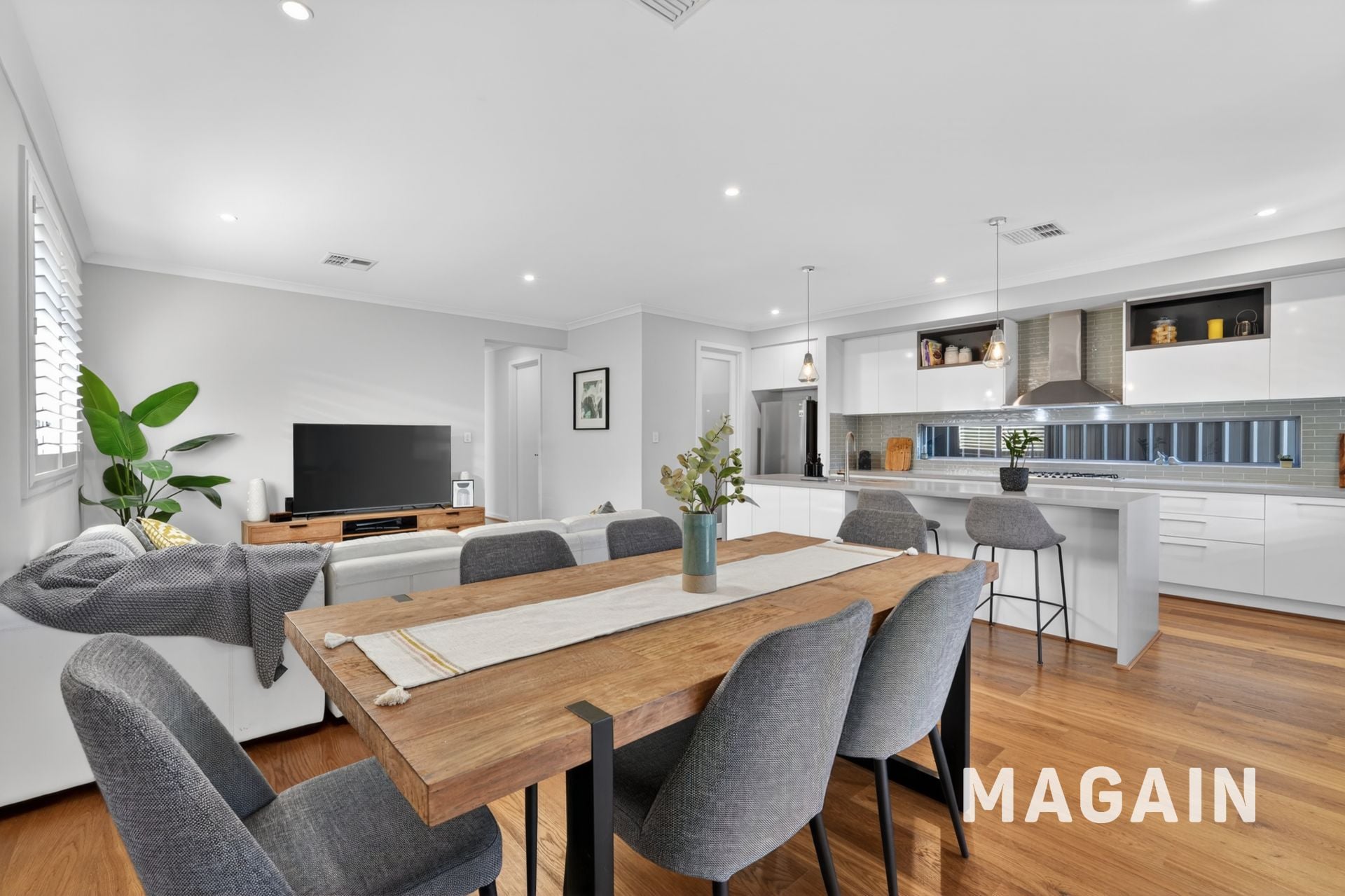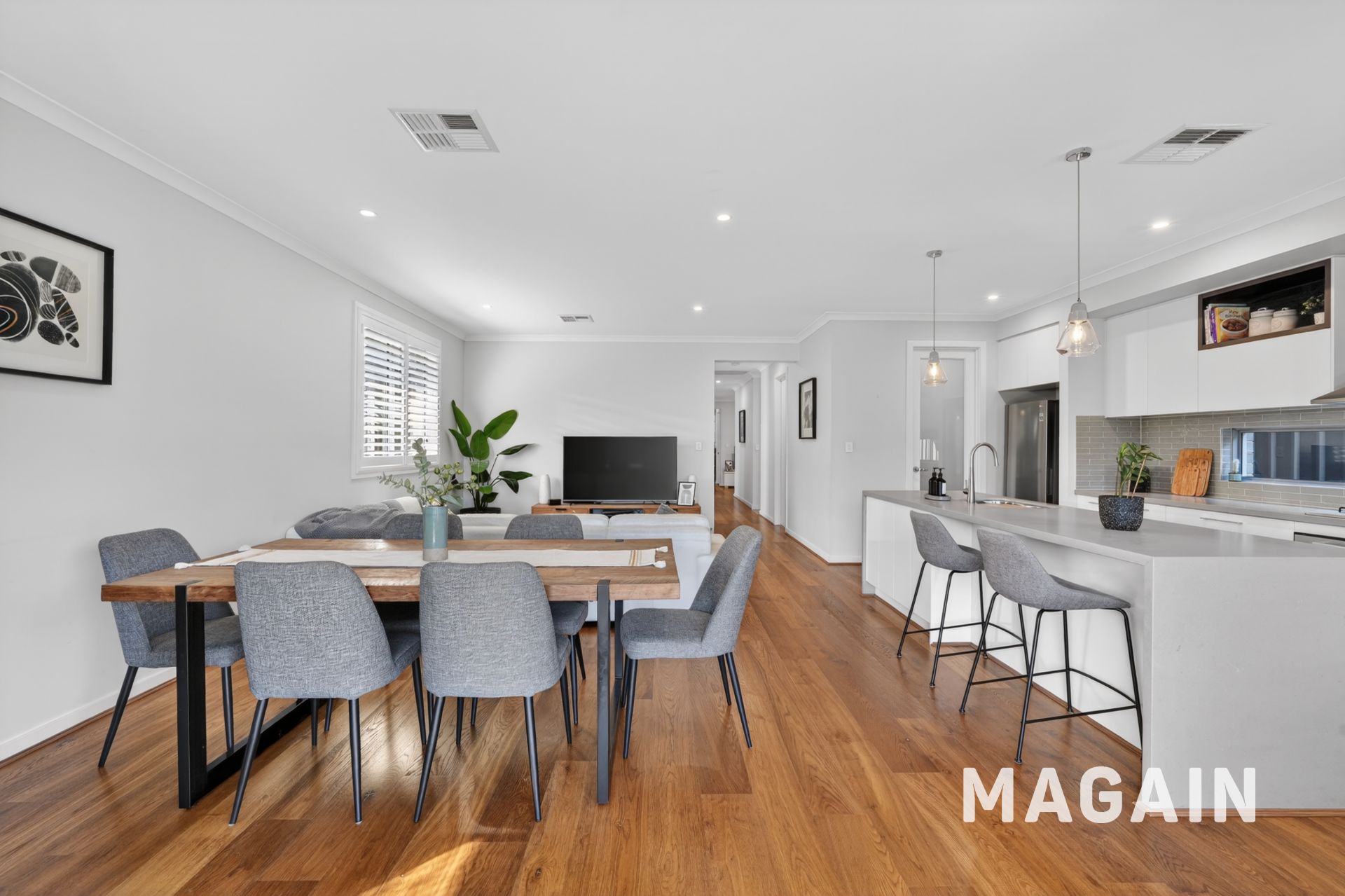 At the centre, the open-plan living and dining area is where everything comes together. The kitchen is both functional and impressive, featuring a stone waterfall island, walk-in pantry, pendant lighting and a glass splashback that enhances light and space-ideal for busy mornings, family dinners or entertaining with ease.