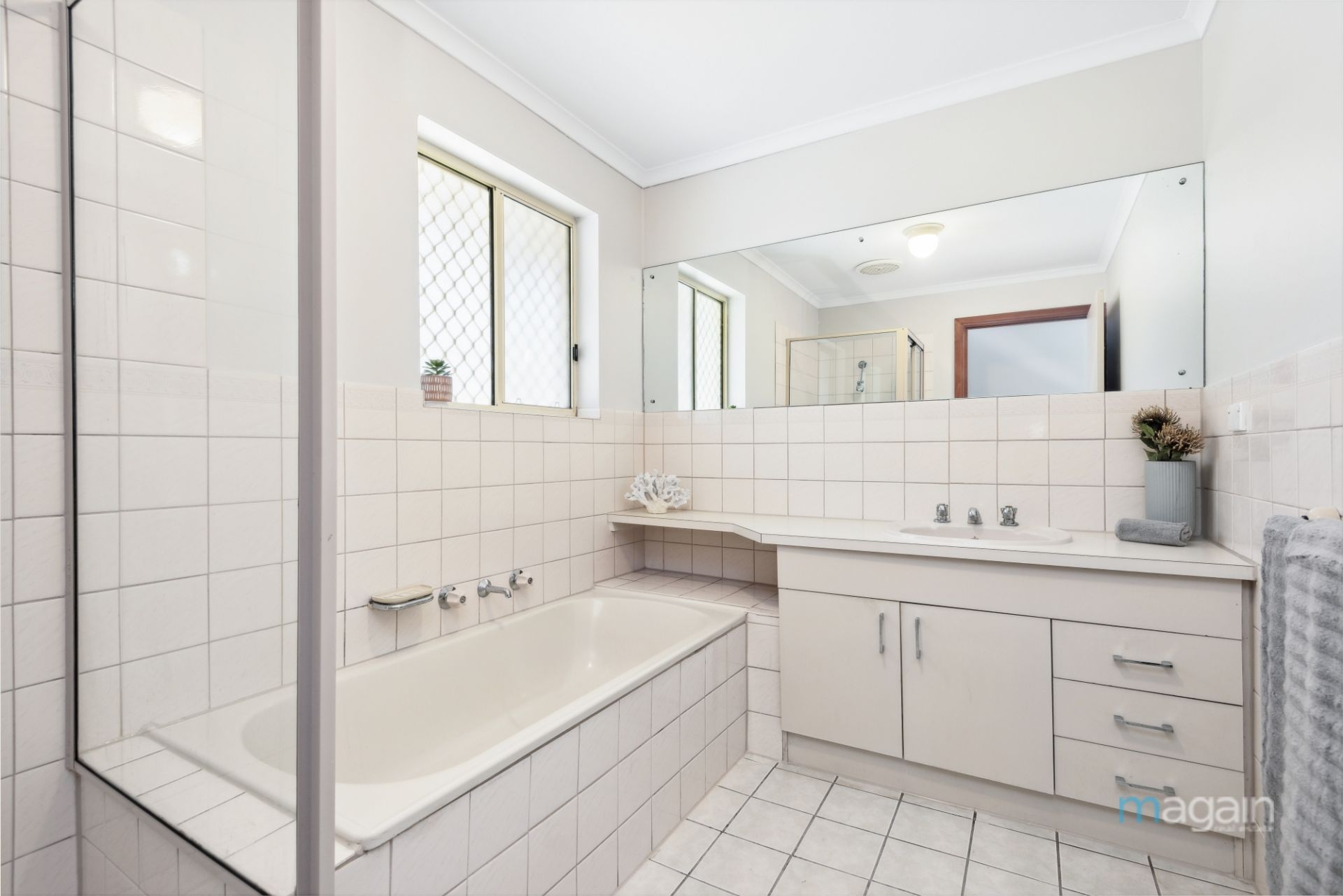 From the lower level, access the expansive paved entertaining area through the laundry, which is covered by a pergola, making it perfect for year-round outdoor gatherings. The spacious backyard is a true sanctuary, with winding garden paths through established landscaping, offering a peaceful escape.