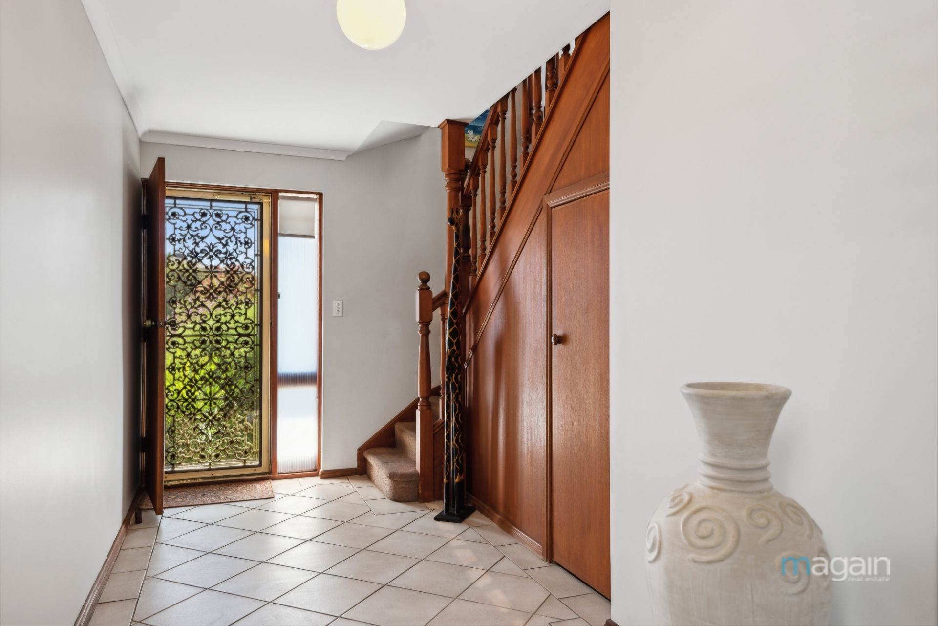 Upon entering, you're greeted by a welcoming hallway with neutral tiles, 8ft ceilings, and a beautiful timber staircase, setting a tone of elegance and sophistication. To the left, the upgraded kitchen invites you with a bright casual meals area and a large window framing the lush front garden. Roller shutters here provide extra privacy and energy efficiency, enhancing comfort in every season.