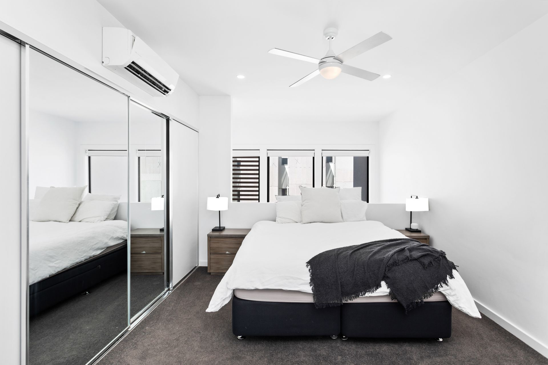 - Master bedroom on the top level, complete with a built-in robe, ensuite, and ceiling fan