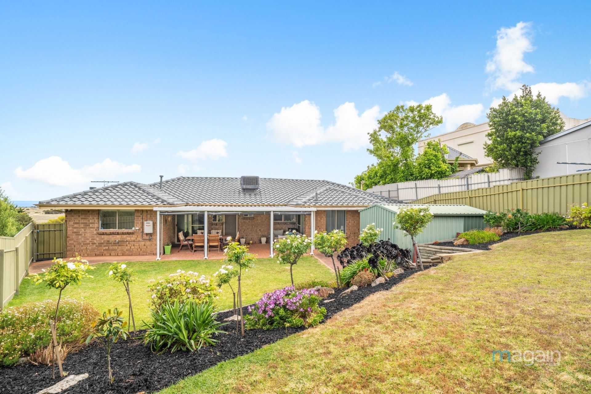 Glass sliding doors from the family living area beckon you to the rear yard, where an entertainer's paradise awaits. A capacious paved entertaining area, sheltered by a sleek flat roof pergola, offers the ideal setting for year-round gatherings. The split-level rear yard grants plenty of space for the kids and pets to frolic and explore. Meanwhile, a well-sized workshop awaits the handyman of the family.