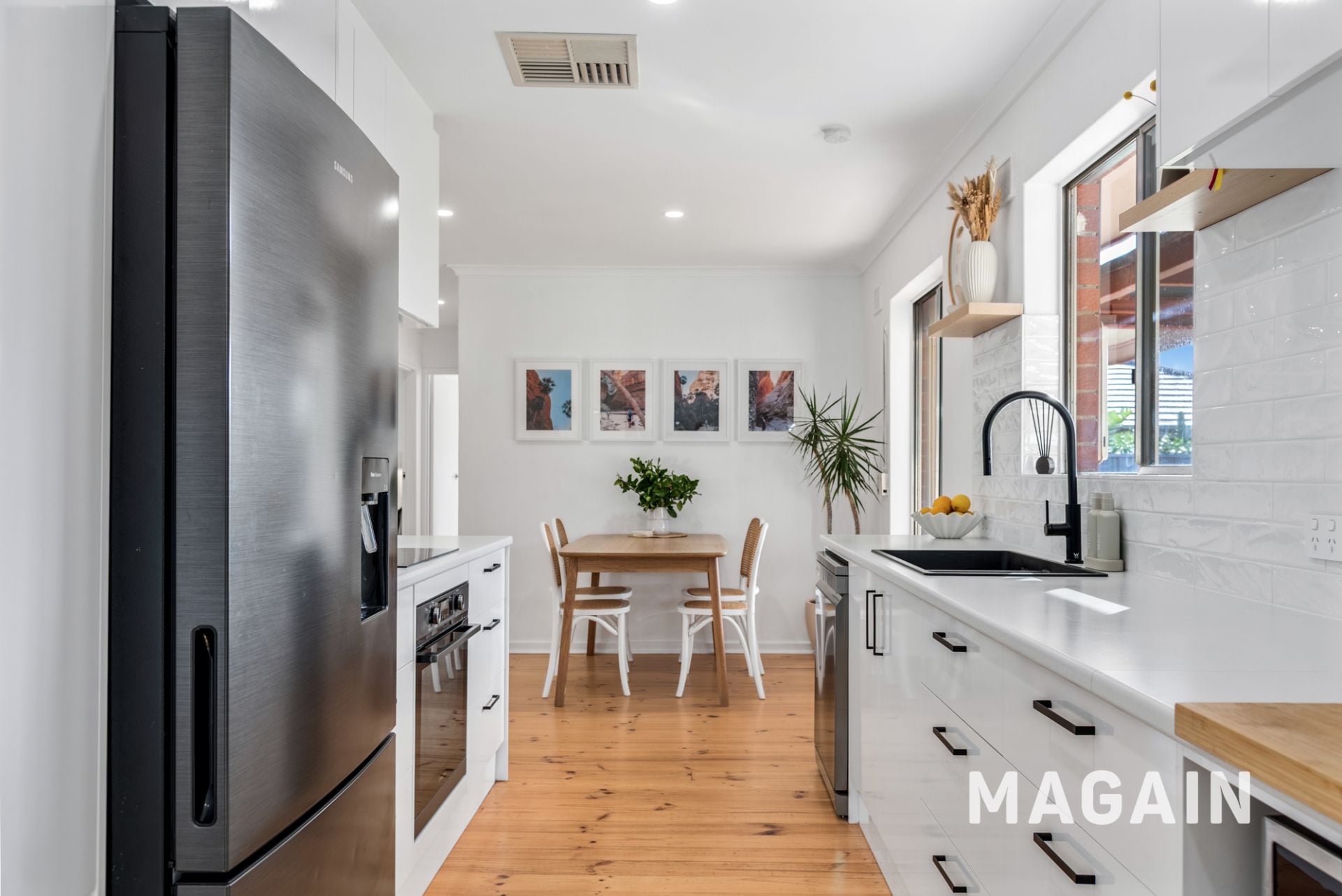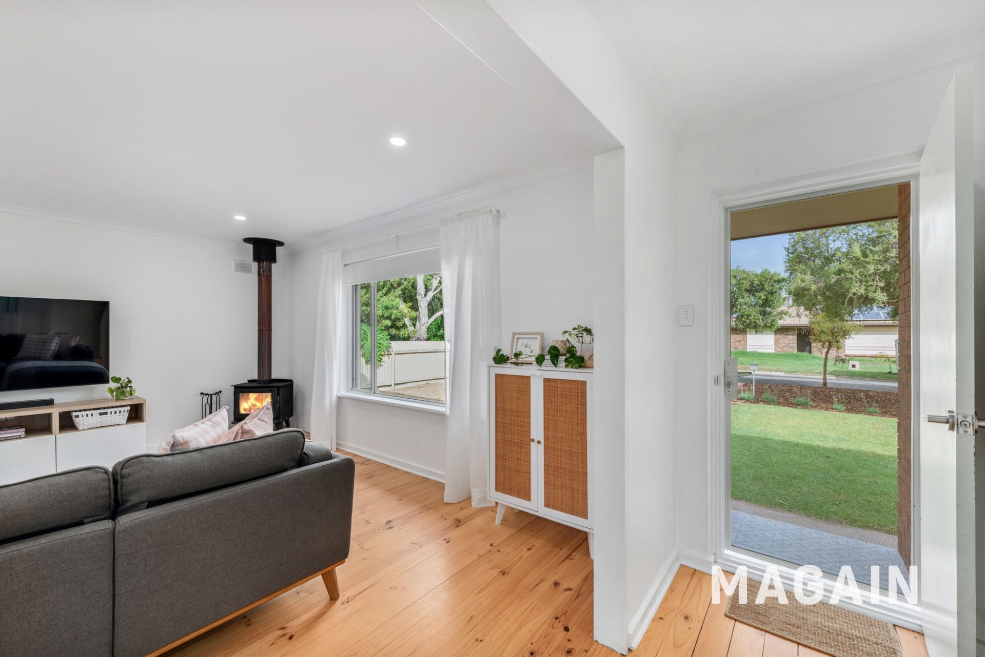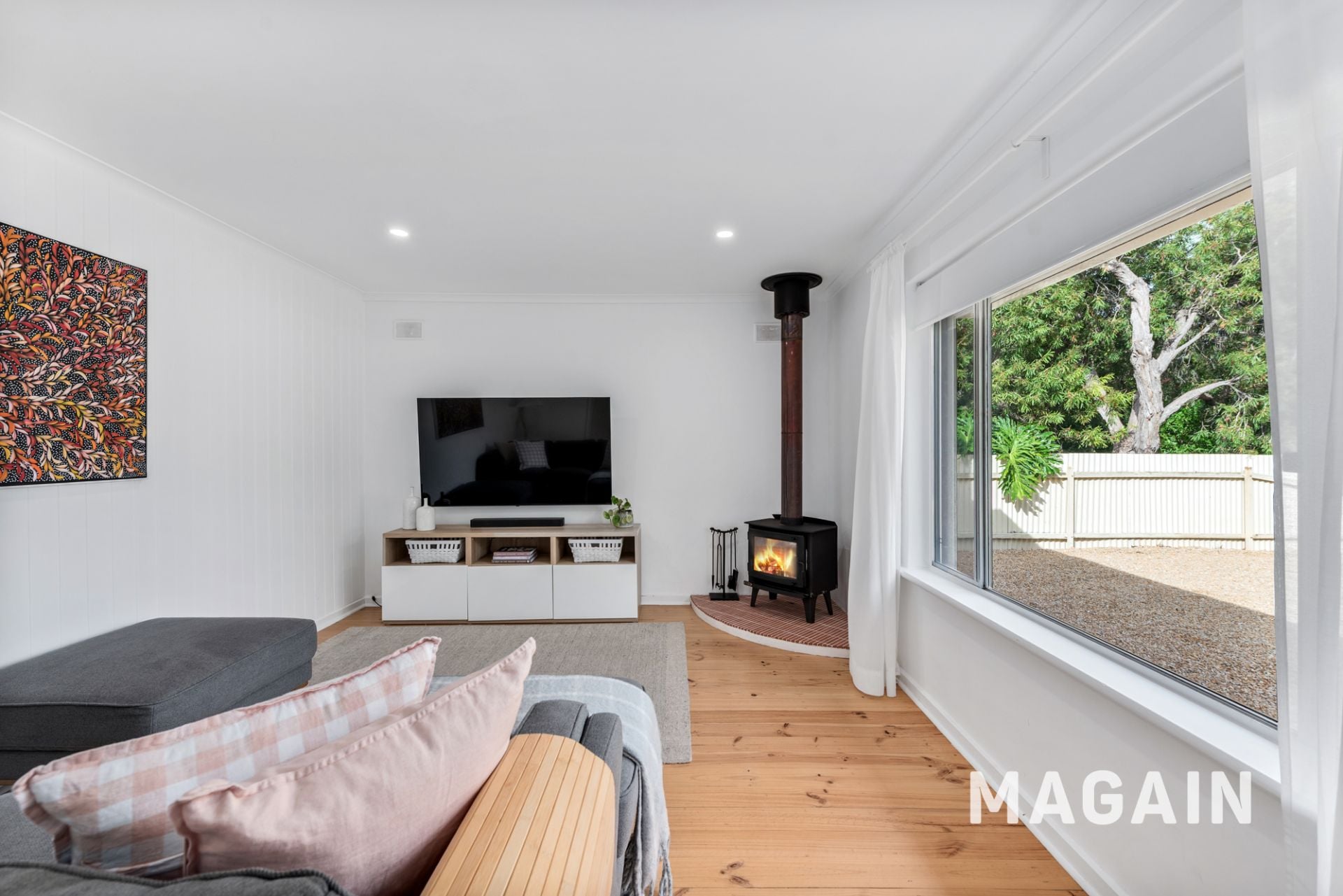Stepping inside, you're welcomed by a light-filled lounge that feels instantly like home, enhanced by timber-look flooring that flows seamlessly throughout the living areas. Complete with a combustion heater for those cosy winter nights and ducted heating and cooling for year-round comfort, the space is both inviting and functional.