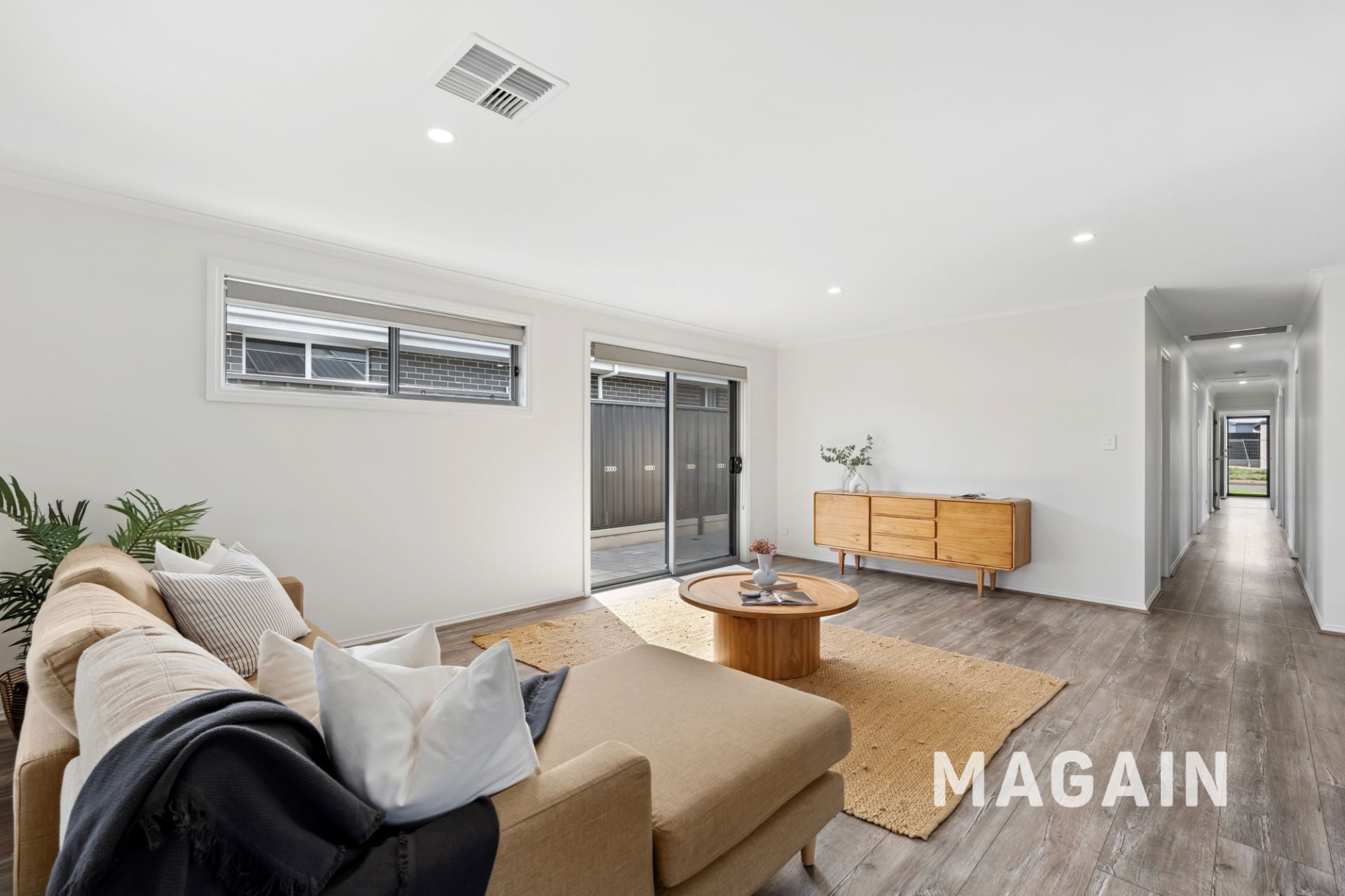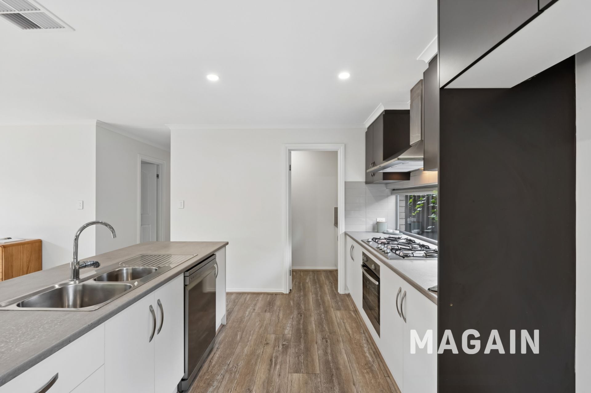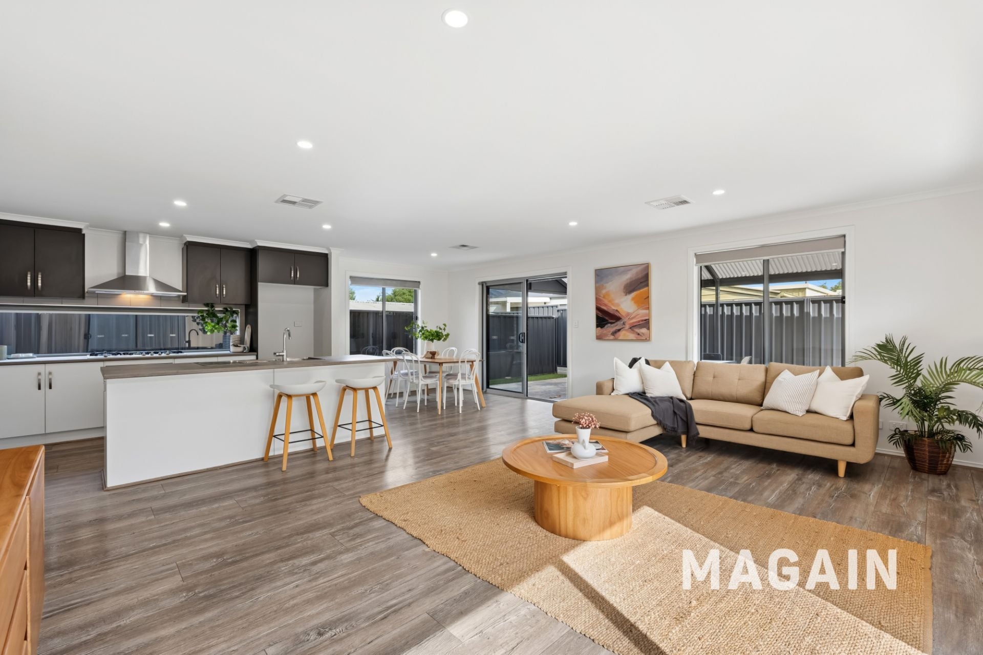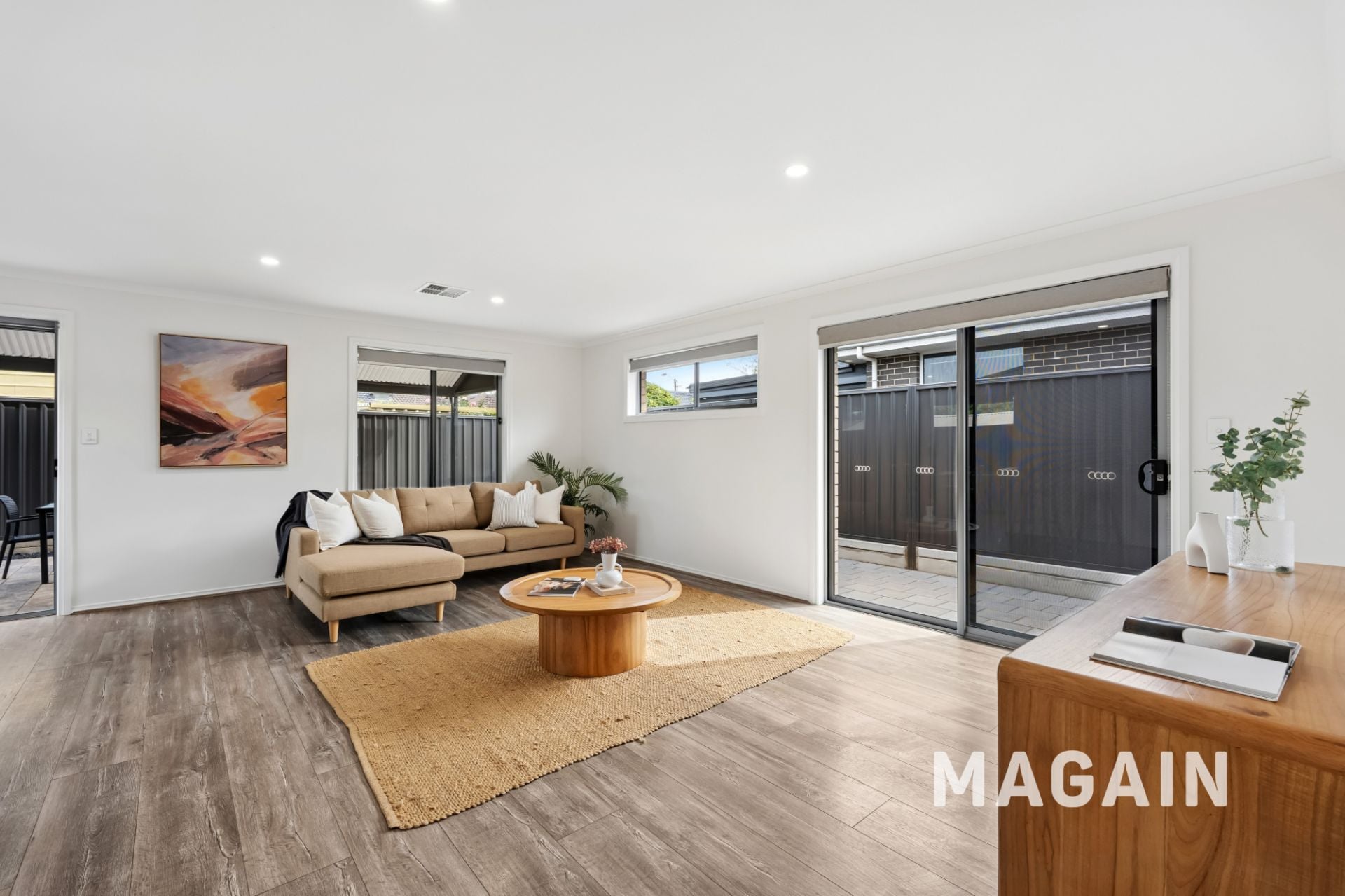 Inside, the home features three generously sized bedrooms, each complete with built-in robes, while the main bedroom enjoys the added luxury of a walk-in robe and private ensuite. A contemporary family bathroom services the remainder of the home, finished with modern fittings and thoughtful design. Floating floors flow seamlessly through the main living zones, enhancing the light-filled open plan living and dining area that forms the heart of the home, whilst the convenience of a second family living area adds further versatility.