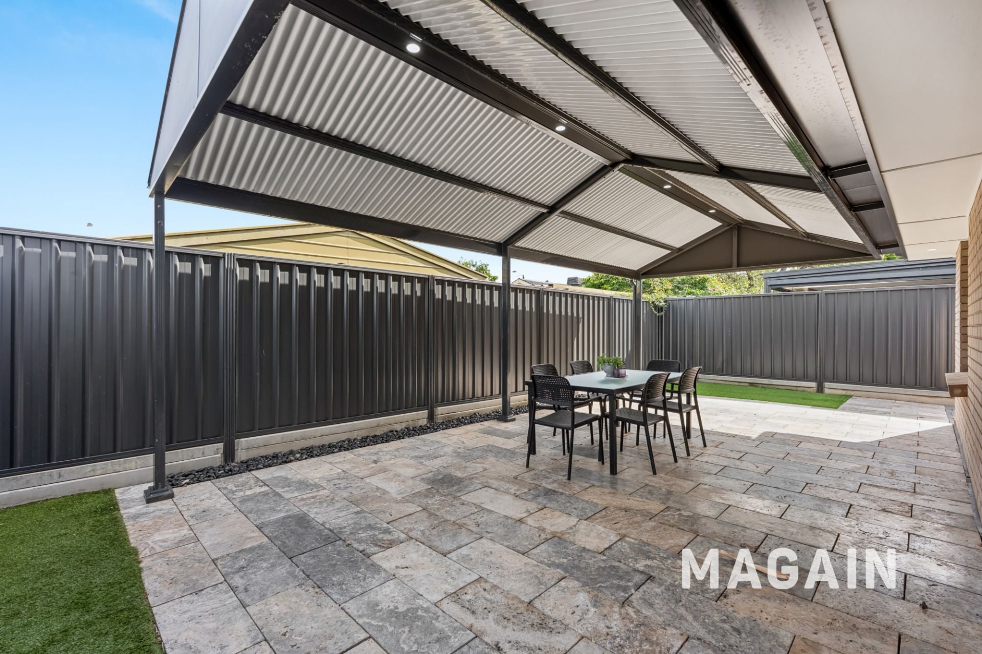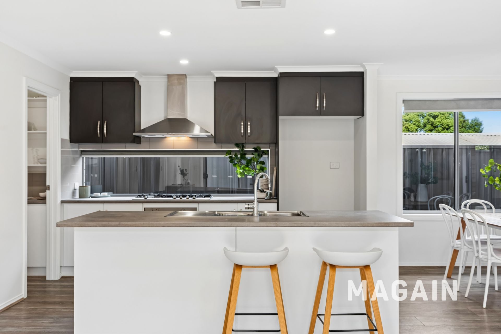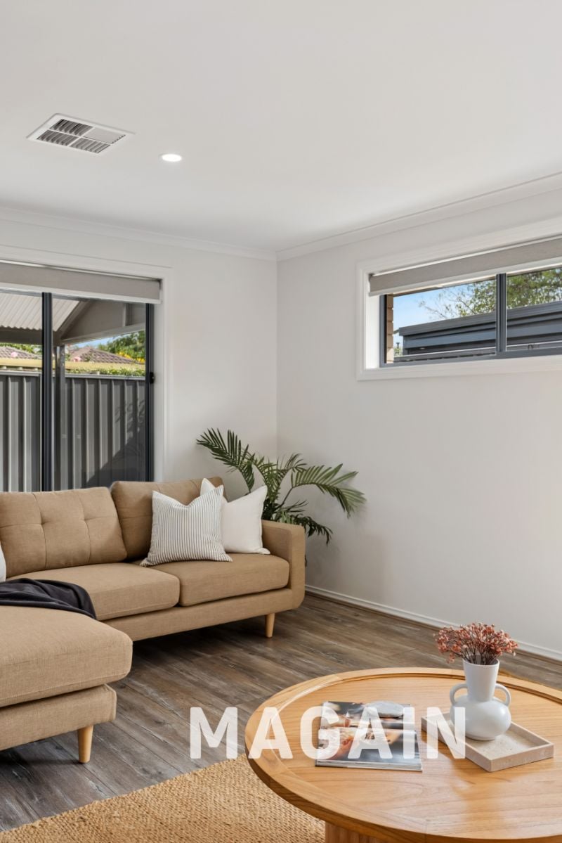 Inside, the home features three generously sized bedrooms, each complete with built-in robes, while the main bedroom enjoys the added luxury of a walk-in robe and private ensuite. A contemporary family bathroom services the remainder of the home, finished with modern fittings and thoughtful design. Floating floors flow seamlessly through the main living zones, enhancing the light-filled open plan living and dining area that forms the heart of the home, whilst the convenience of a second family living area adds further versatility.