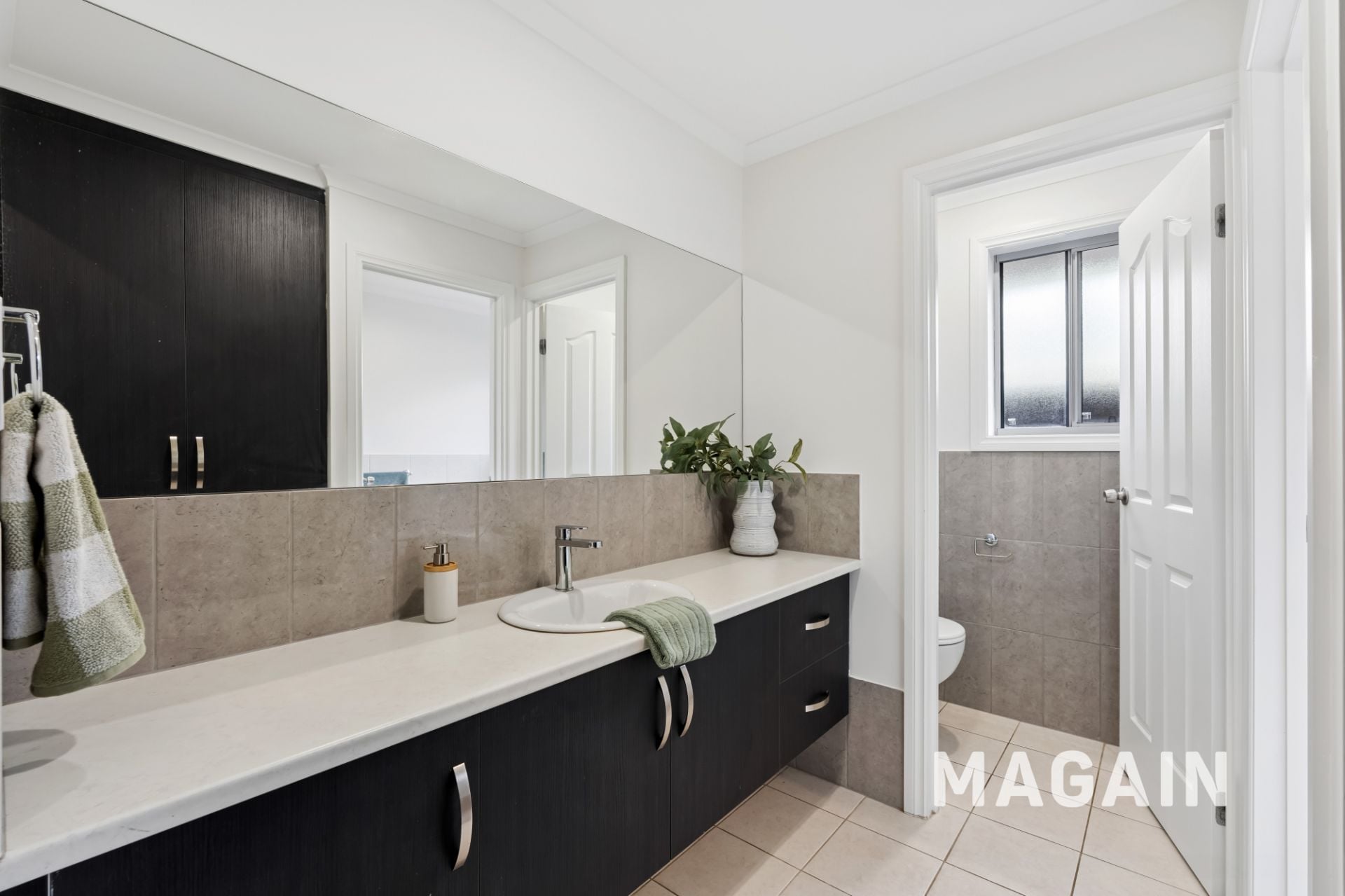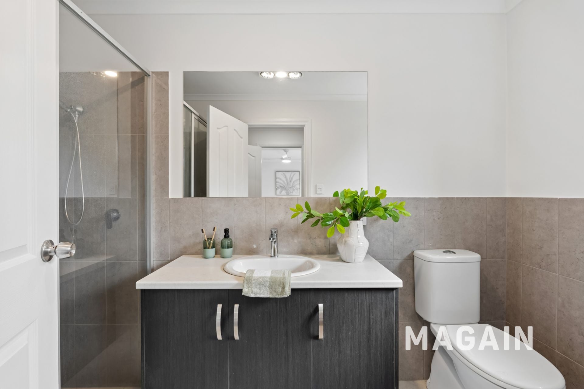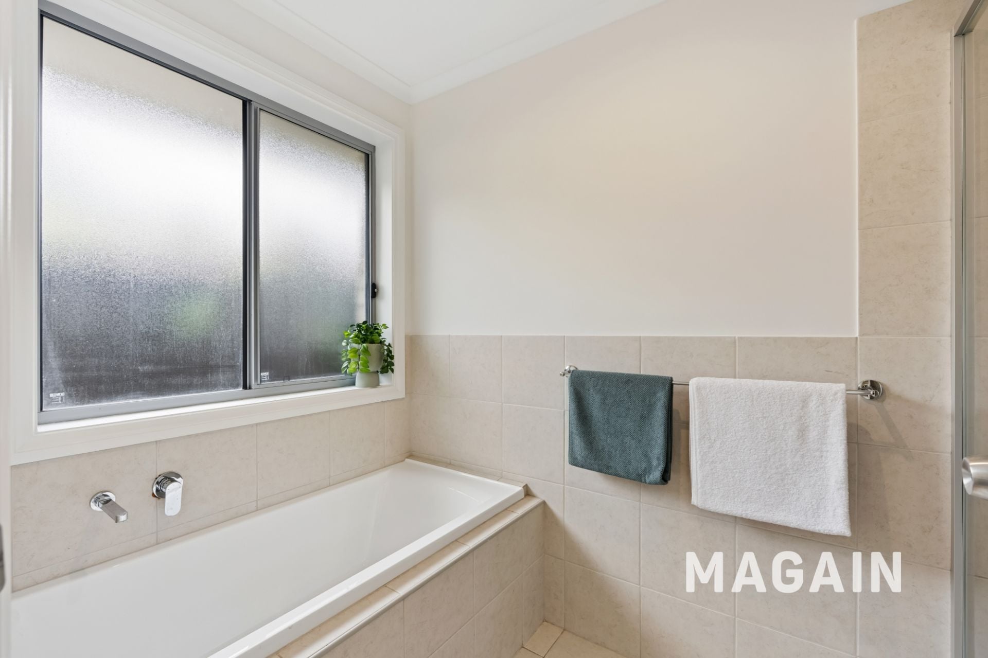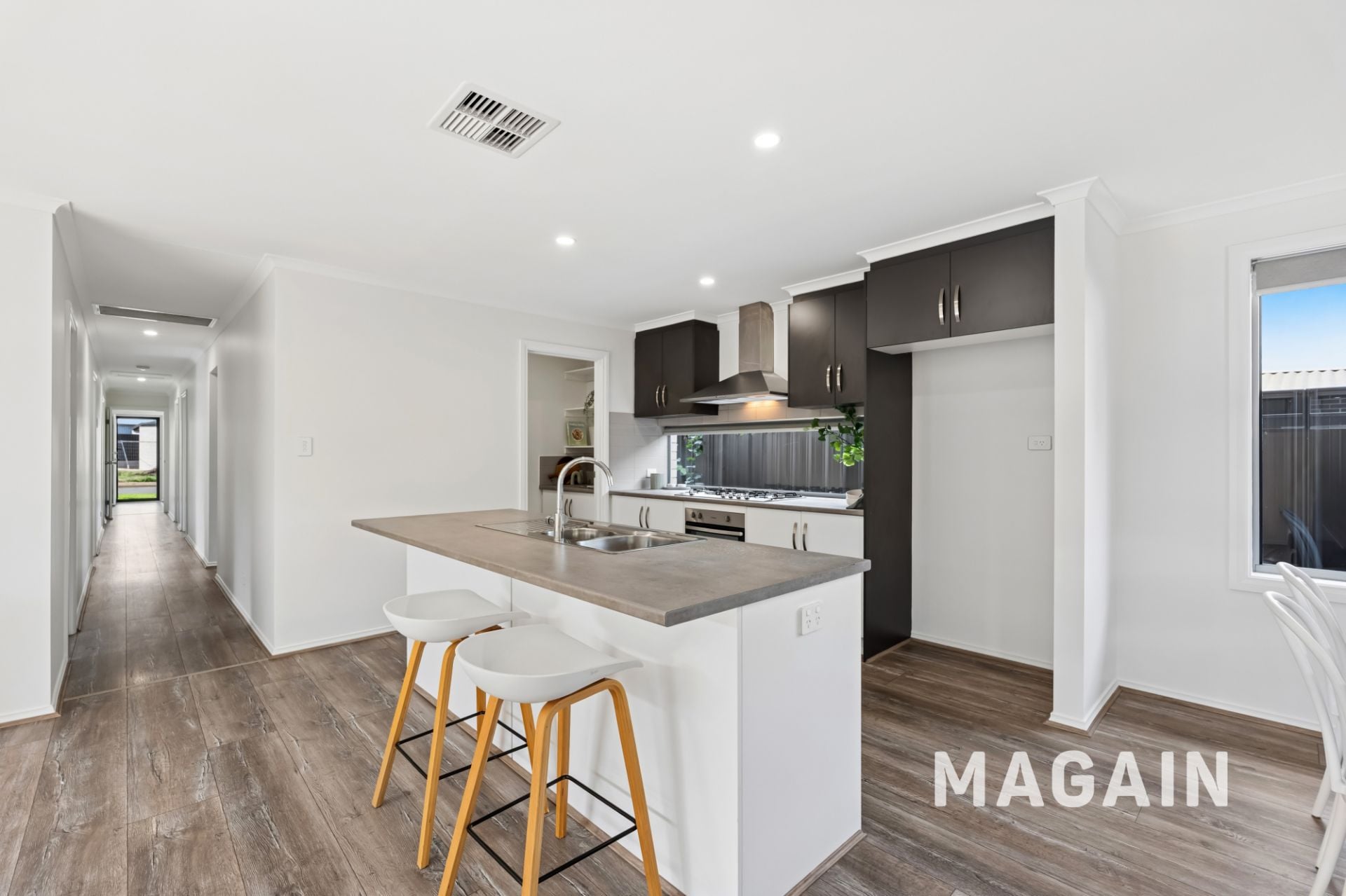 Inside, the home features three generously sized bedrooms, each complete with built-in robes, while the main bedroom enjoys the added luxury of a walk-in robe and private ensuite. A contemporary family bathroom services the remainder of the home, finished with modern fittings and thoughtful design. Floating floors flow seamlessly through the main living zones, enhancing the light-filled open plan living and dining area that forms the heart of the home, whilst the convenience of a second family living area adds further versatility.