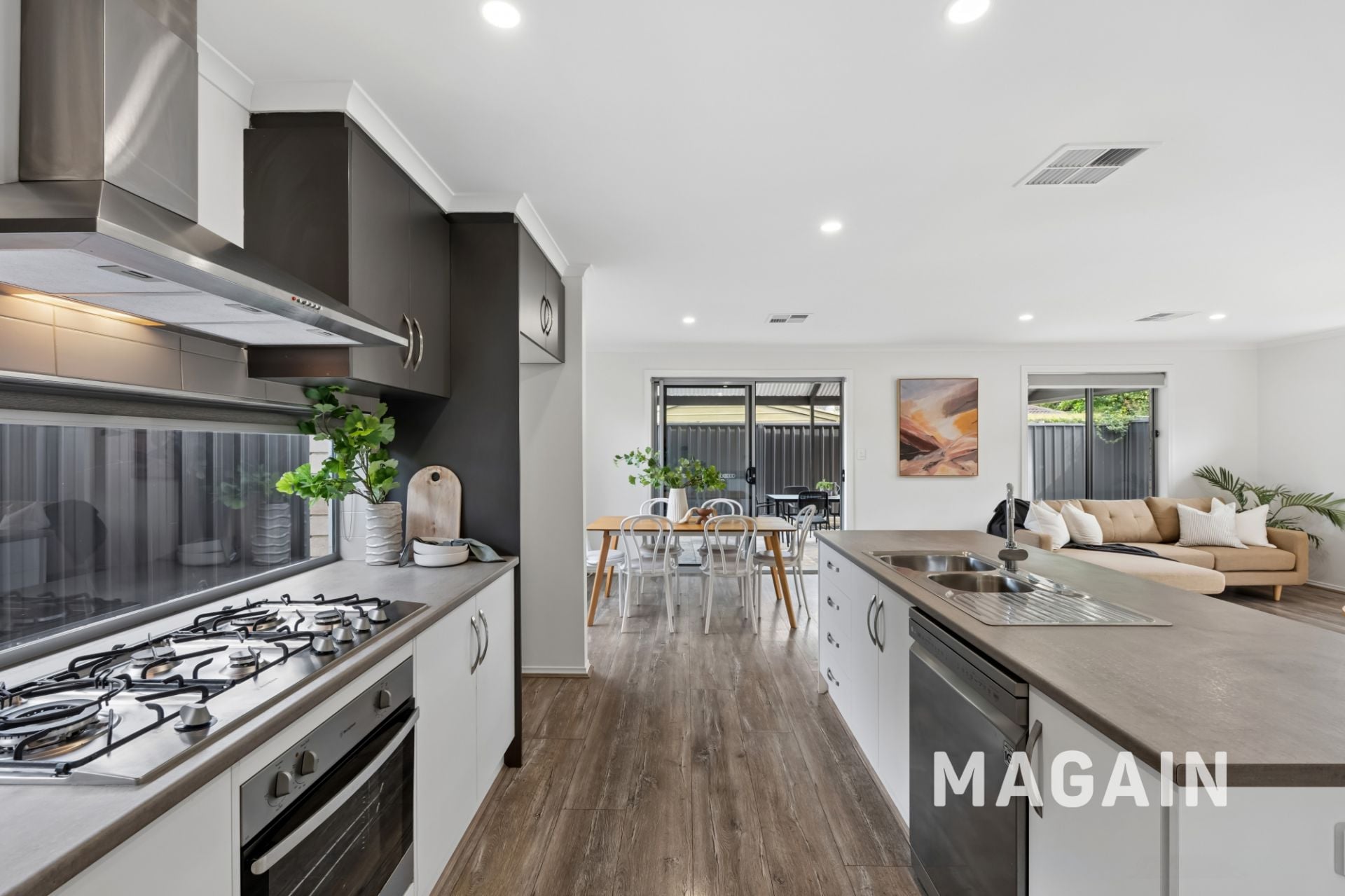 The spacious kitchen is sure to impress, boasting a large island bench, quality appliances, a five-burner gas cooktop, dishwasher, and the added convenience of a butler's pantry-perfect for both everyday living and entertaining. Comfort is assured year-round with zoned reverse cycle heating and cooling.