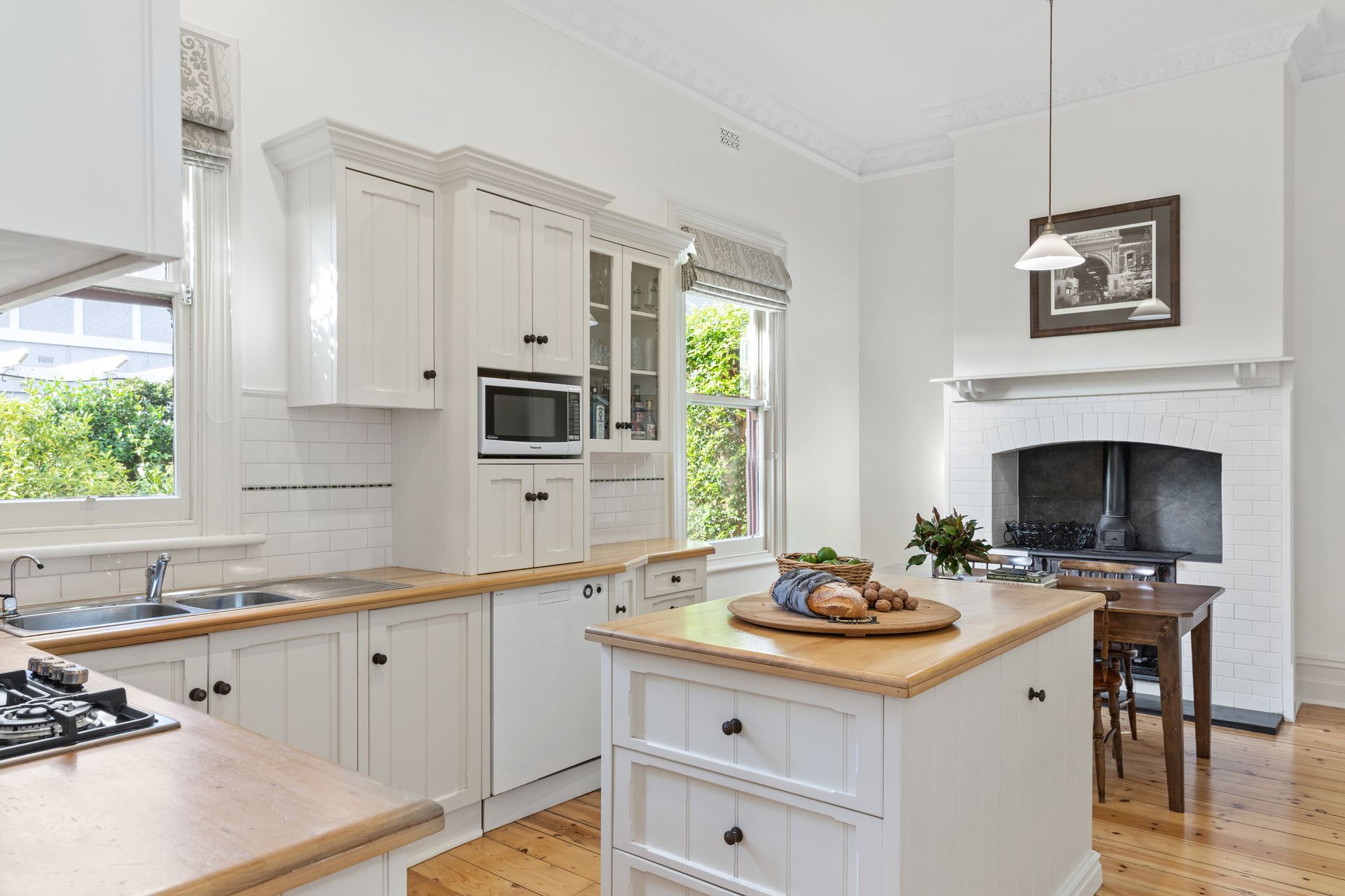 Lovely French Provincial/ country style kitchen with huge pantry, gas cooking and original wood burning stove