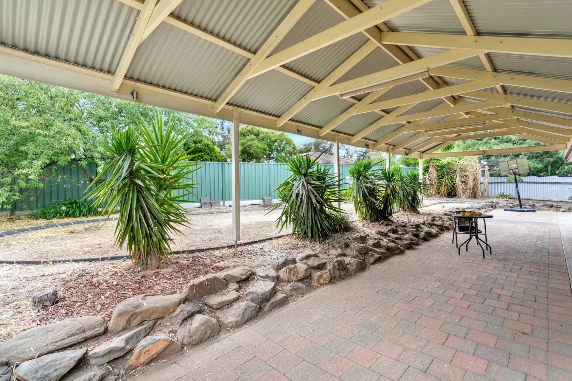 > secure back yard with a small garden shed and a large pergola for year round entertaining