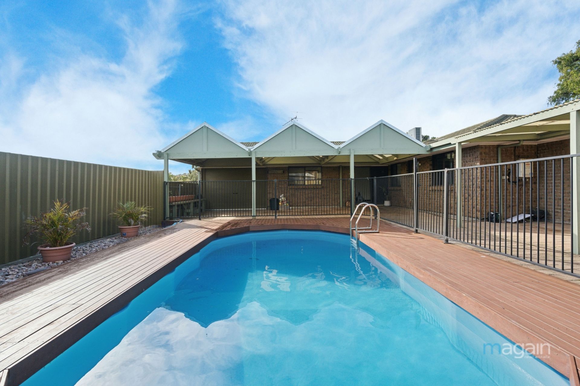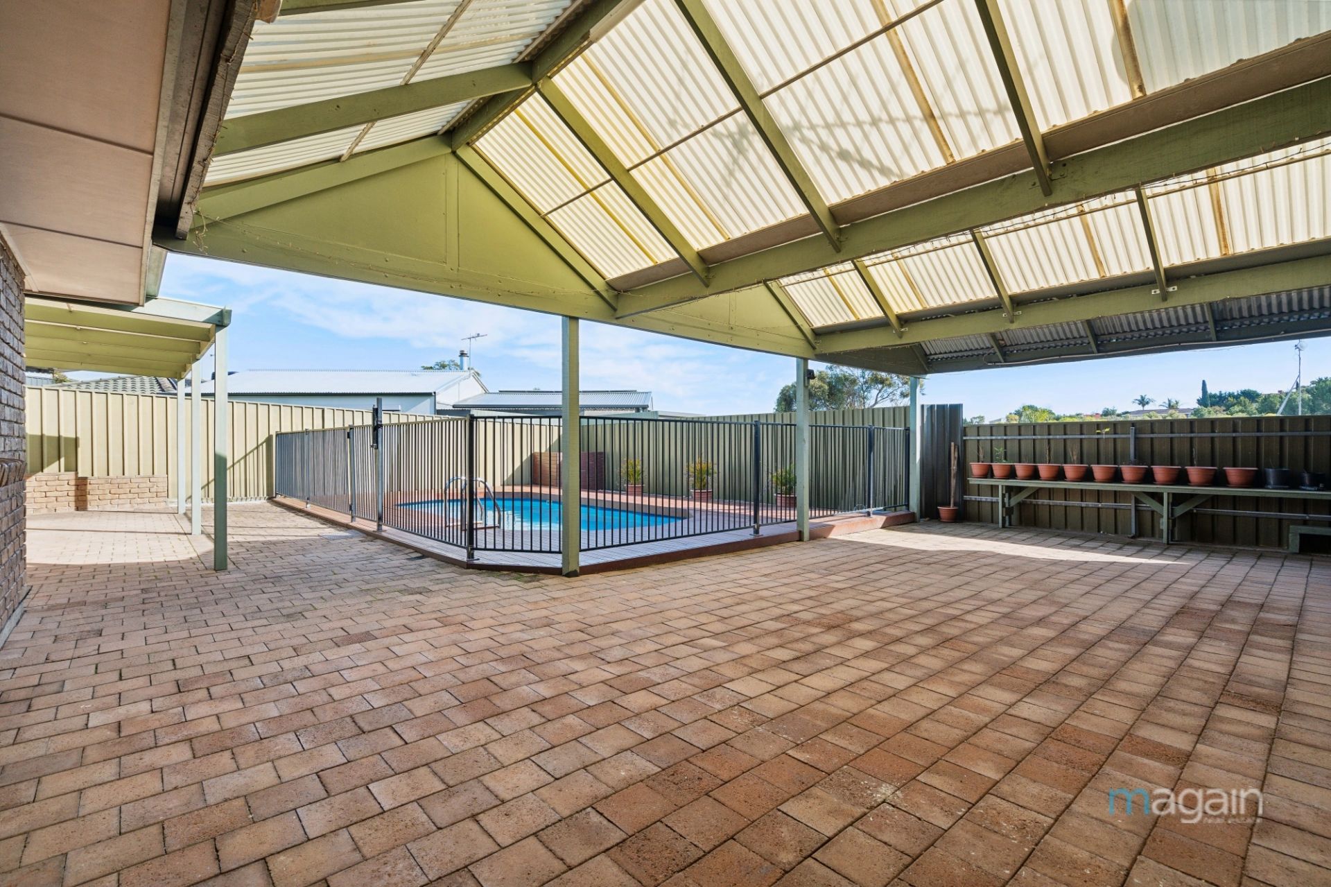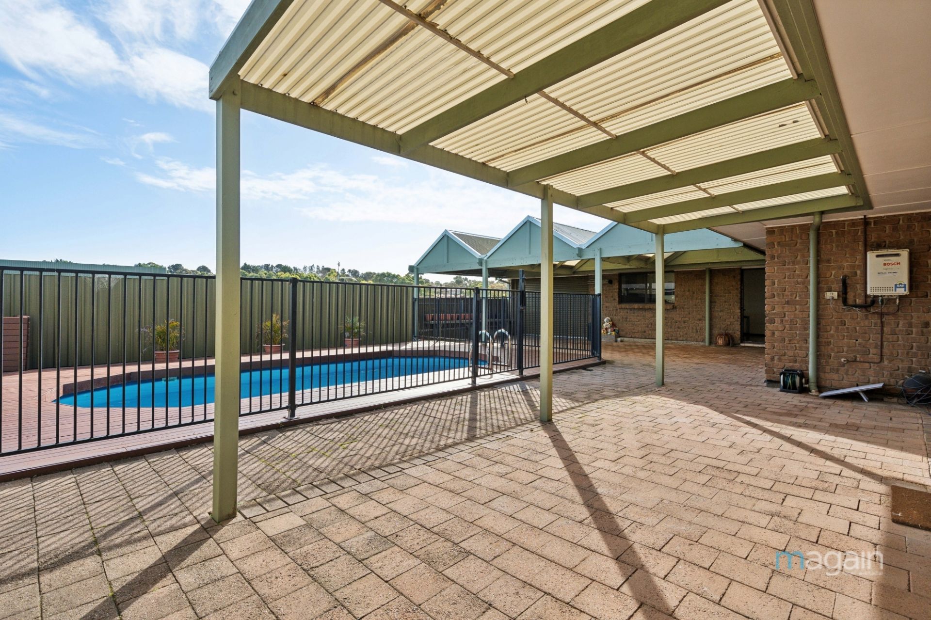 Glass sliding doors in the kitchen and living areas offer a breath-taking view and seamless outdoor access, enhancing the entertainer's paradise waiting outside. Enjoy hosting family and friends in style year-round with a vast paved entertaining space under a pitched roof pergola and an inviting in-ground swimming pool surrounded by decking, making it a perfect backyard for family enjoyment.