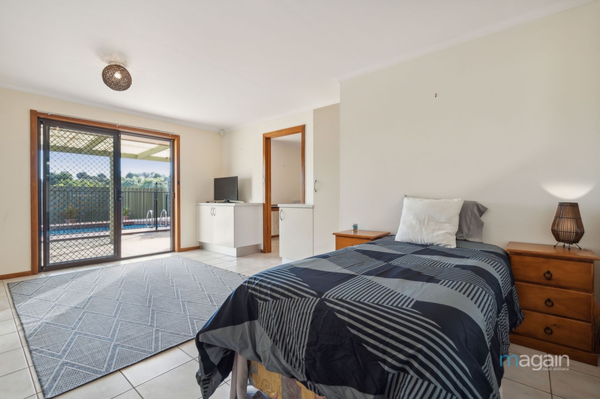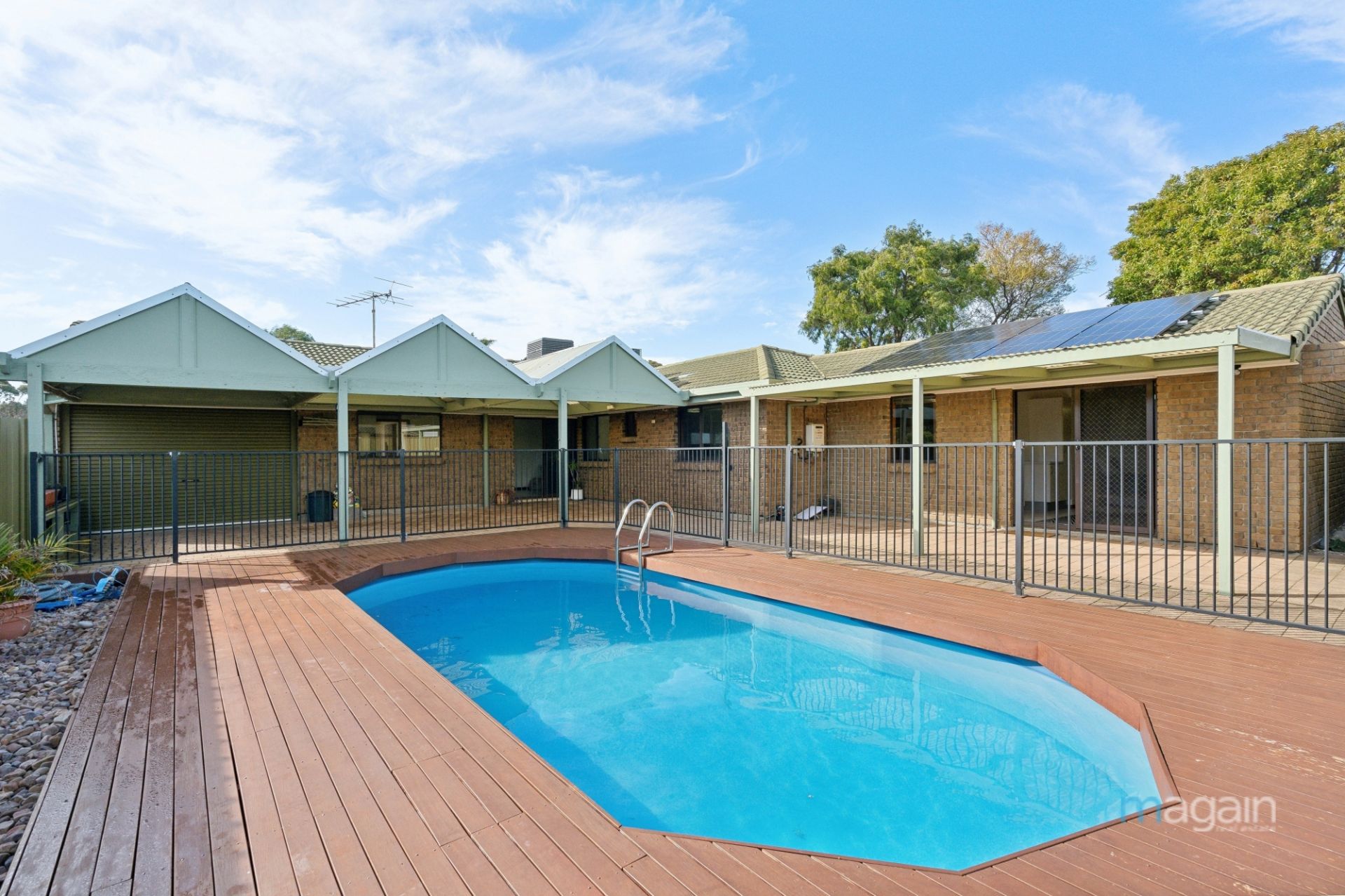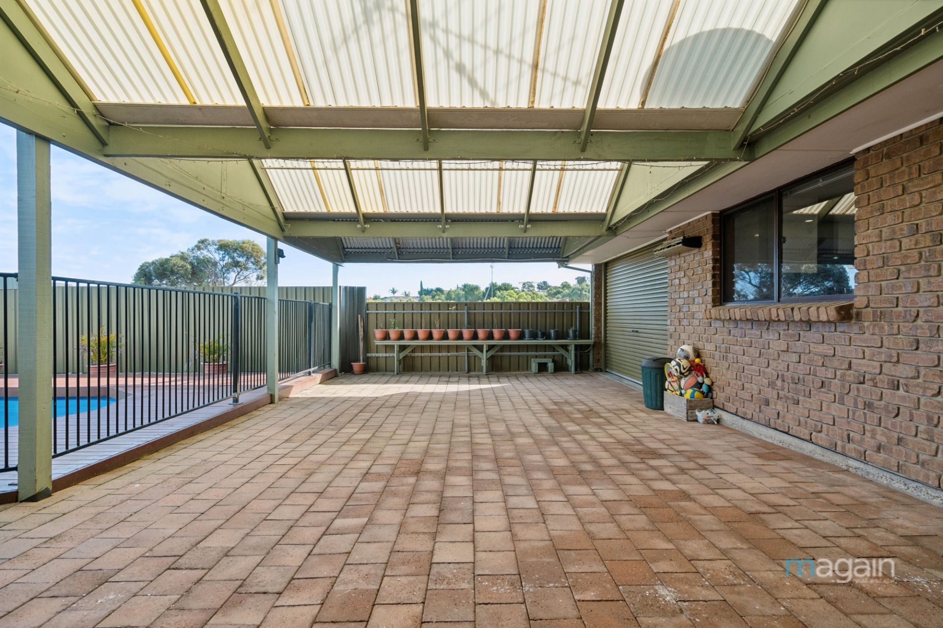 Glass sliding doors in the kitchen and living areas offer a breath-taking view and seamless outdoor access, enhancing the entertainer's paradise waiting outside. Enjoy hosting family and friends in style year-round with a vast paved entertaining space under a pitched roof pergola and an inviting in-ground swimming pool surrounded by decking, making it a perfect backyard for family enjoyment.