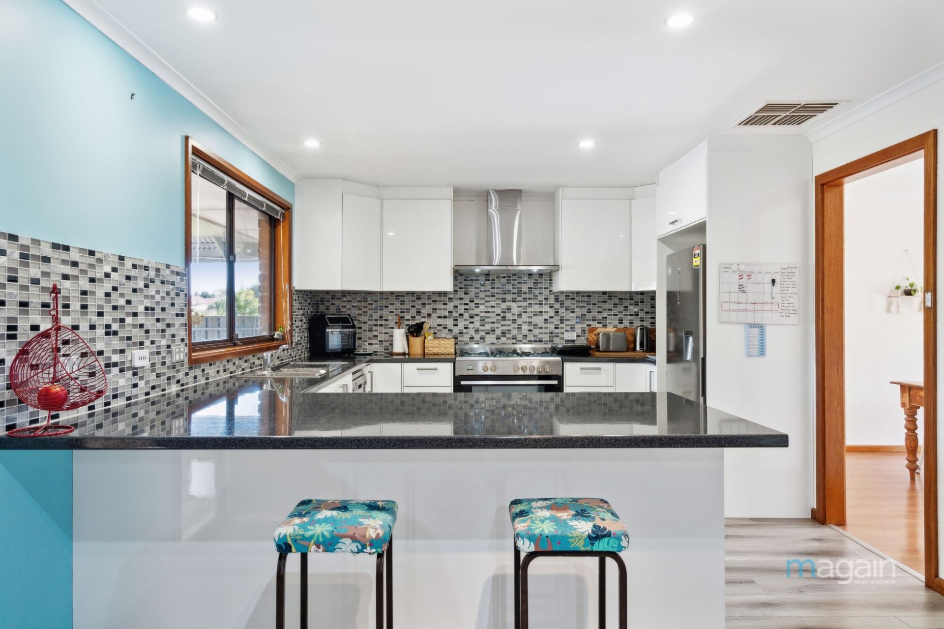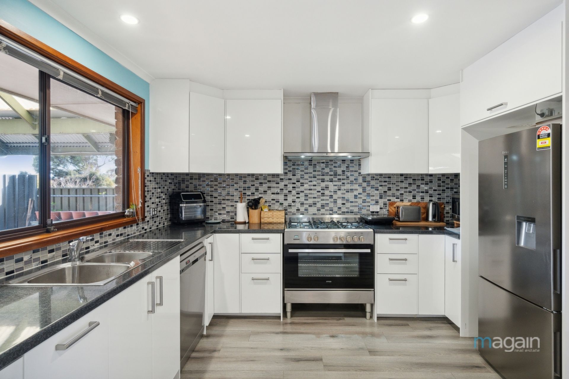 Upon entry, a formal lounge and dining area greet you, flowing seamlessly into the beautifully updated kitchen overlooking the family living zone. This area opens via glass sliding doors to a generous outdoor entertaining space. The kitchen is a chef's dream, featuring abundant high-gloss white cabinetry, and modern appliances including a 900mm oven, gas cooktop, and dishwasher, complemented by a practical breakfast bar, making it the heart of the home.