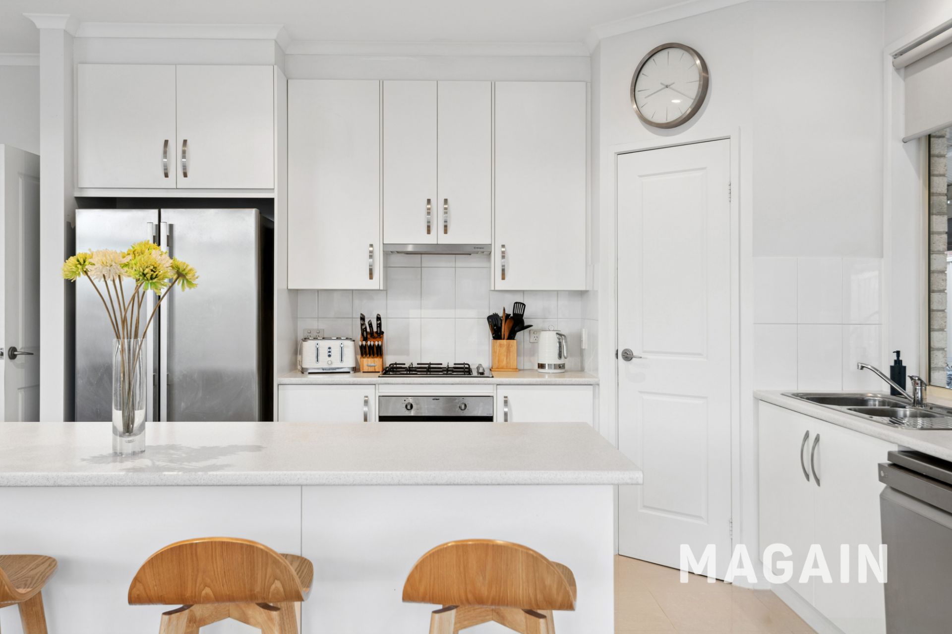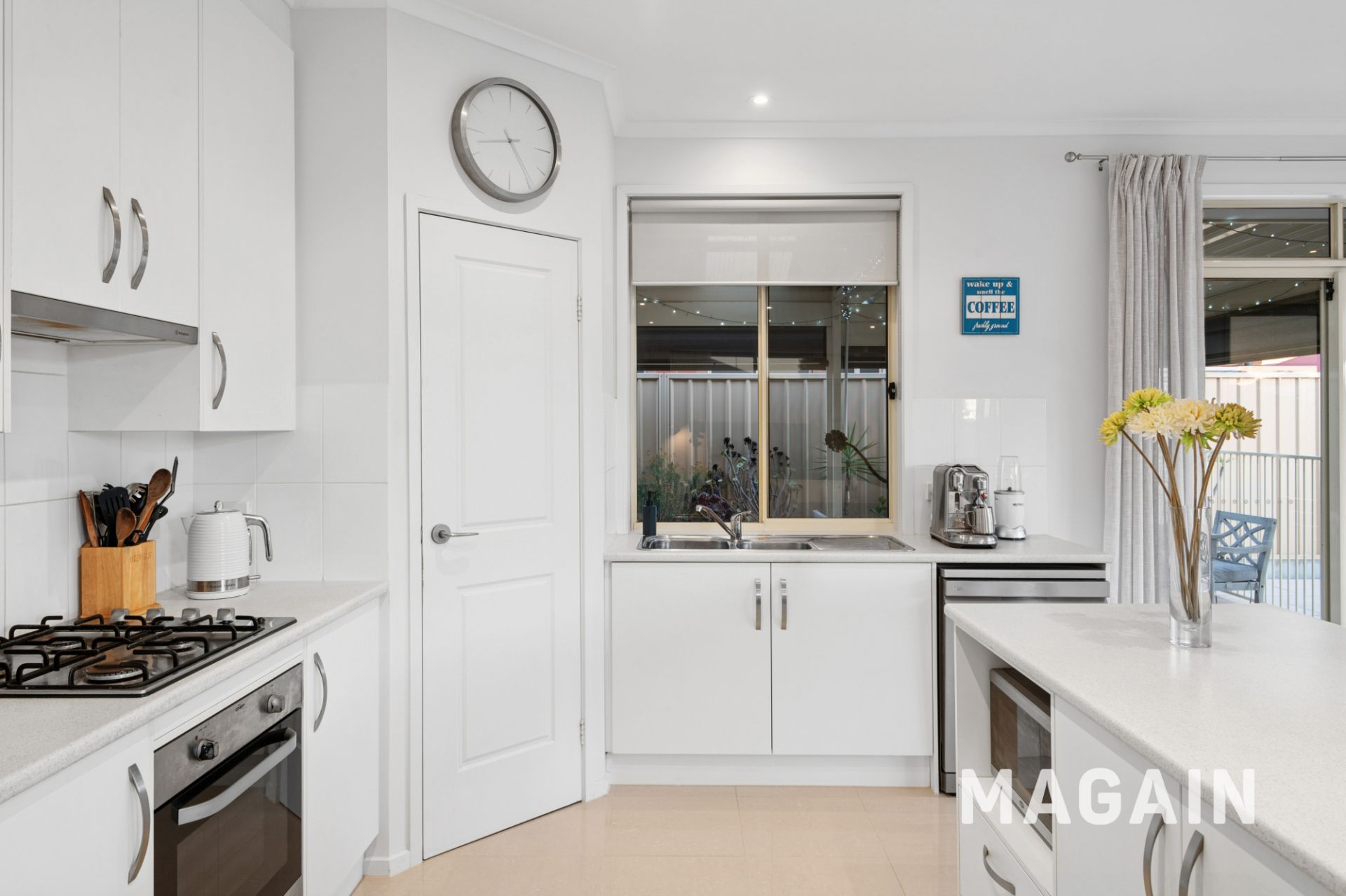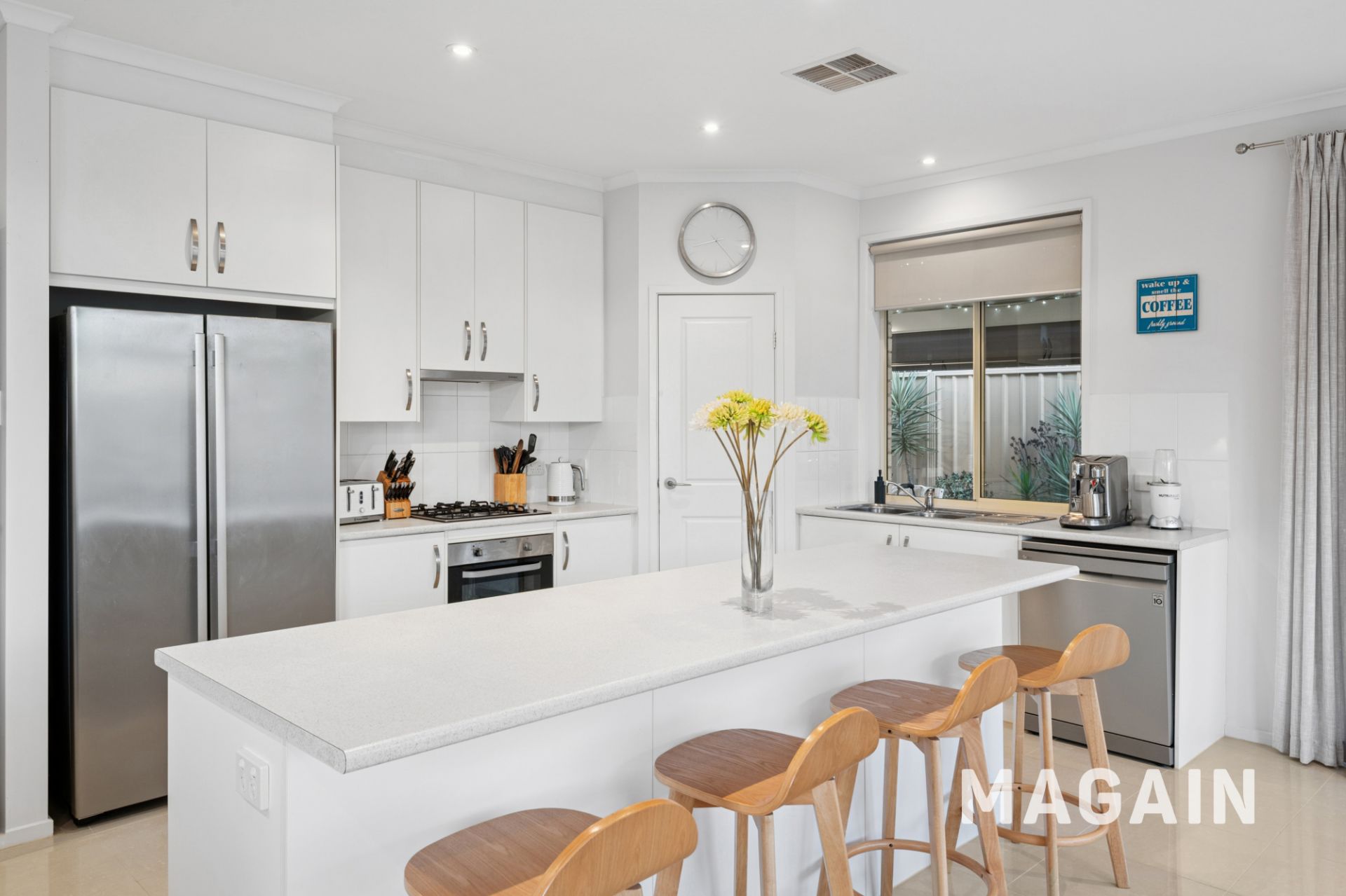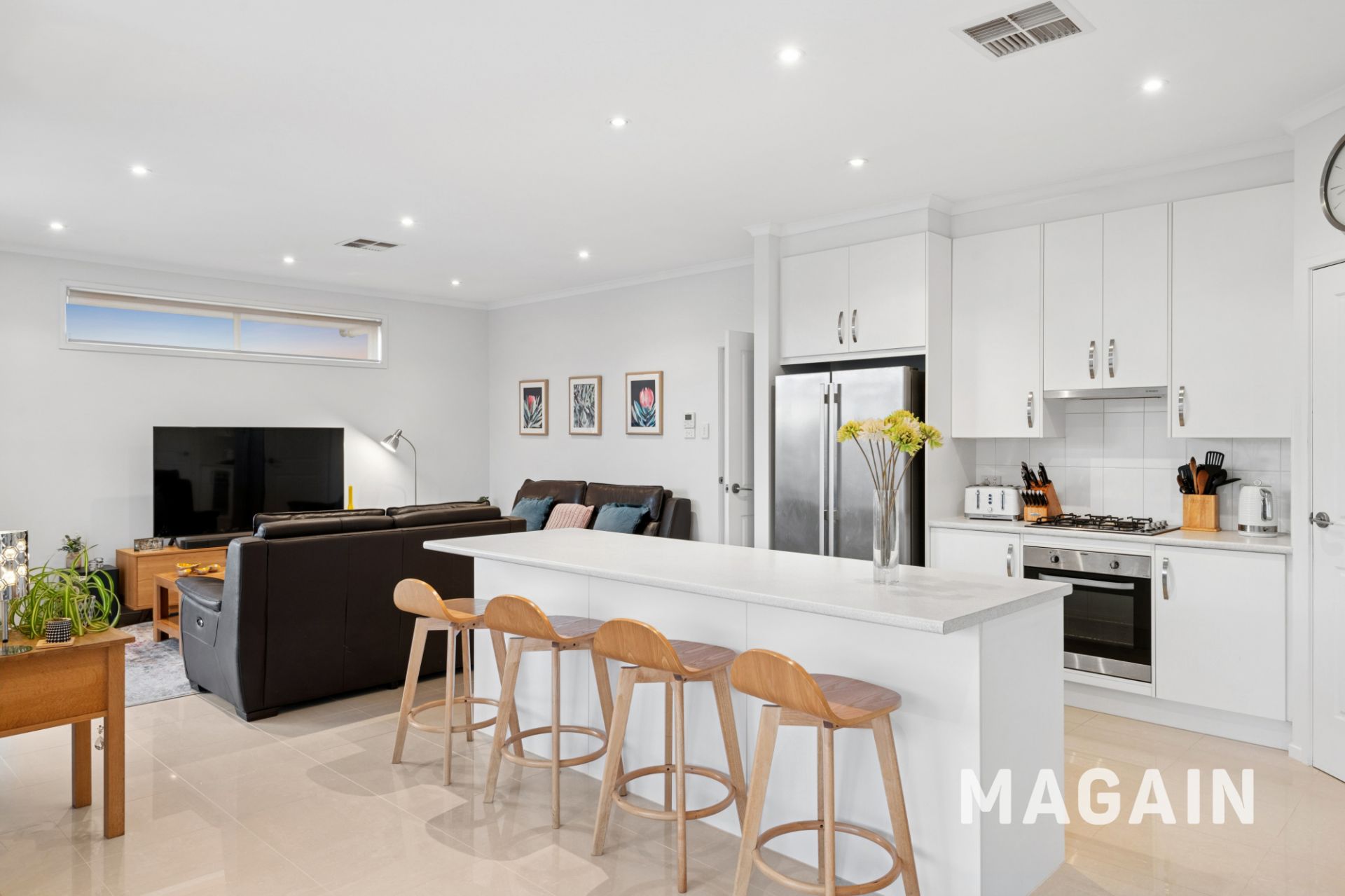 At the rear, light-filled open-plan living is anchored by a well-appointed kitchen featuring stainless steel oven, gas cooktop, rangehood and dishwasher, along with a double sink, ample bench and cupboard space and a walk-in pantry. Premium tiled floors, raised 2.7m ceilings and ducted reverse-cycle air conditioning ensure year-round comfort throughout.