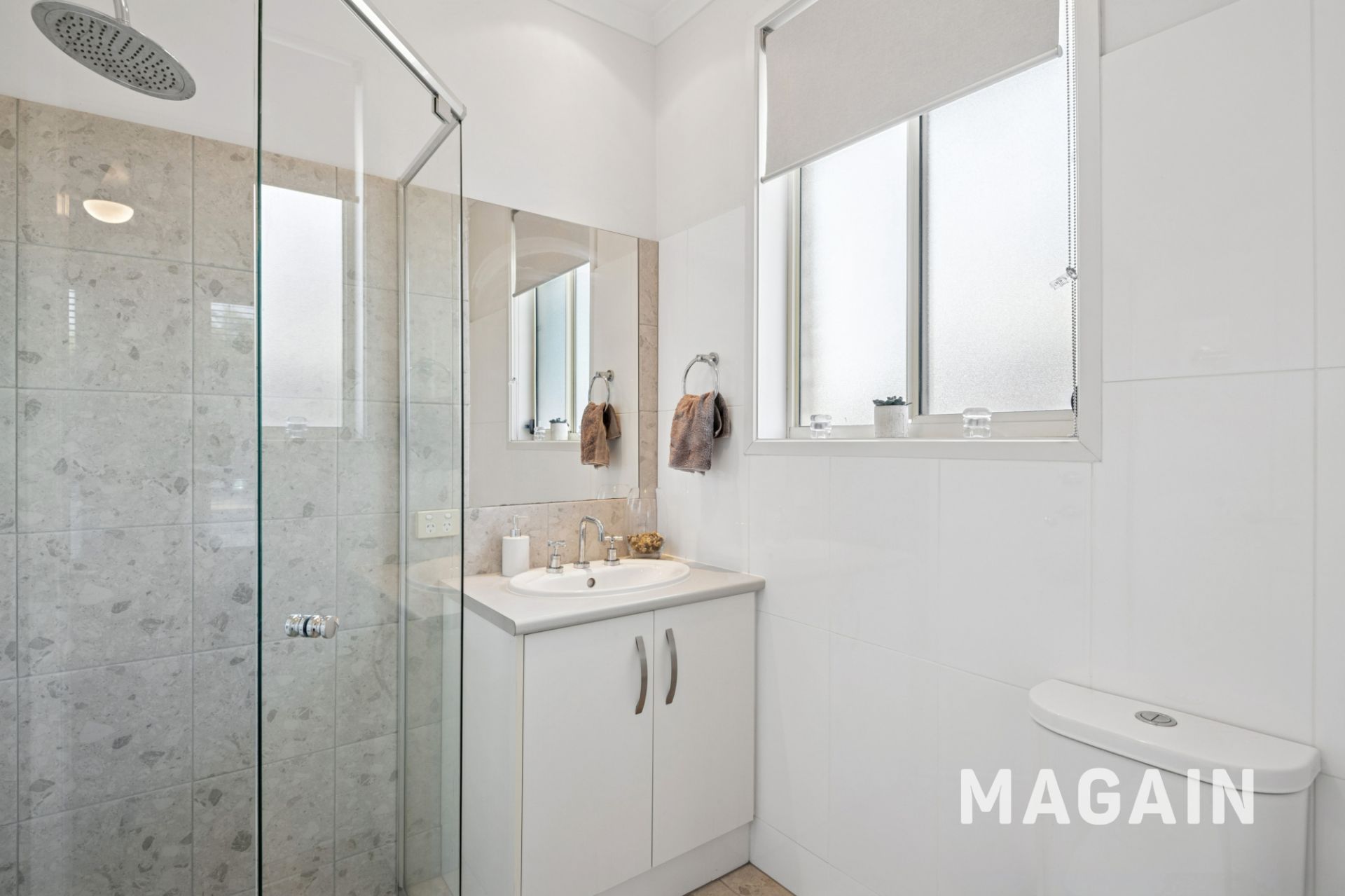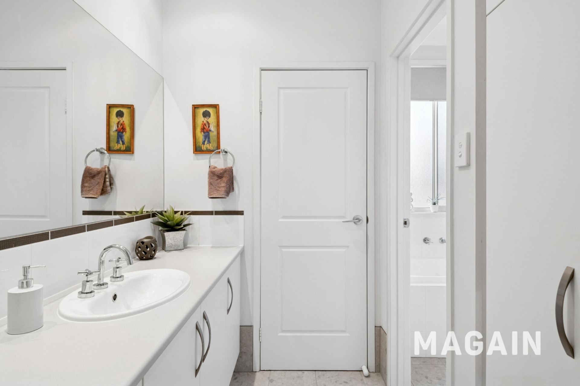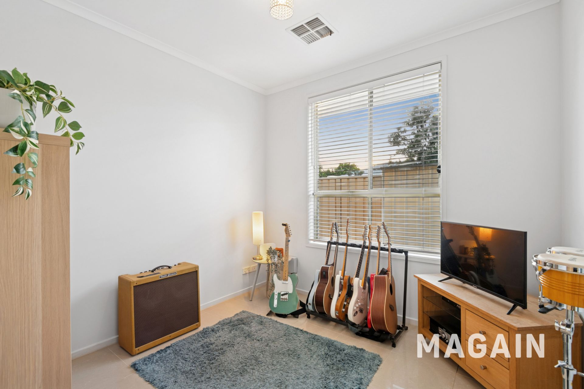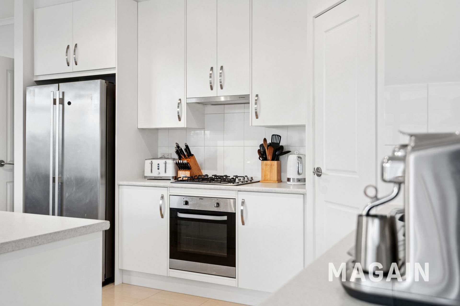 At the rear, light-filled open-plan living is anchored by a well-appointed kitchen featuring stainless steel oven, gas cooktop, rangehood and dishwasher, along with a double sink, ample bench and cupboard space and a walk-in pantry. Premium tiled floors, raised 2.7m ceilings and ducted reverse-cycle air conditioning ensure year-round comfort throughout.